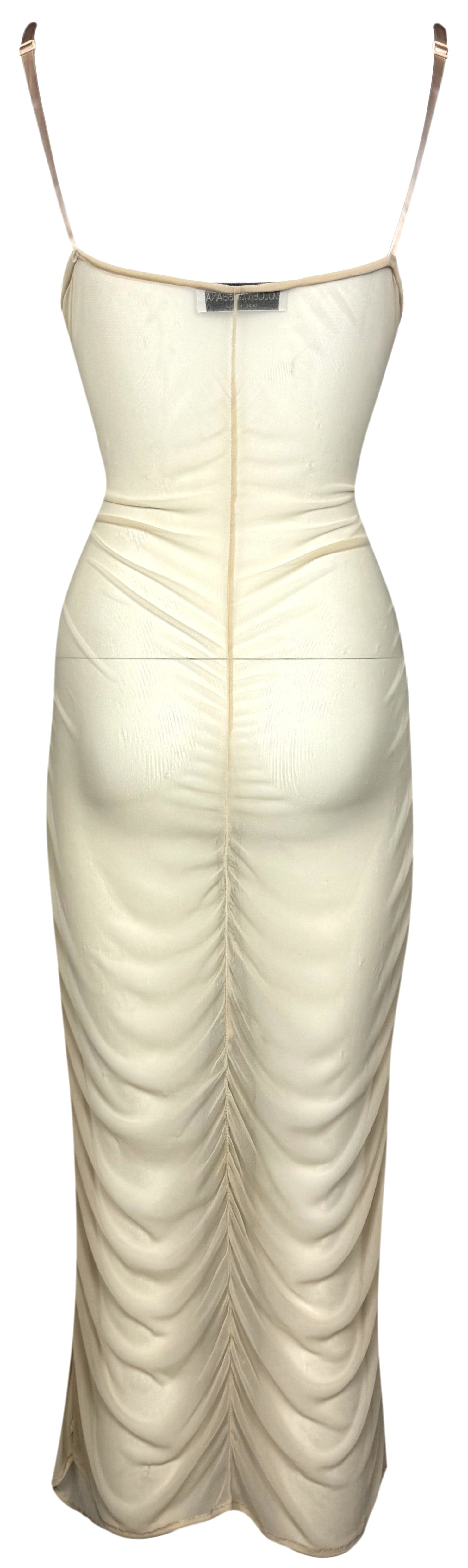1990's Dolce & Gabbana Sexy Sheer Nude Nylon Bodystocking Ruched Pin-Up Wiggle Midi Dress