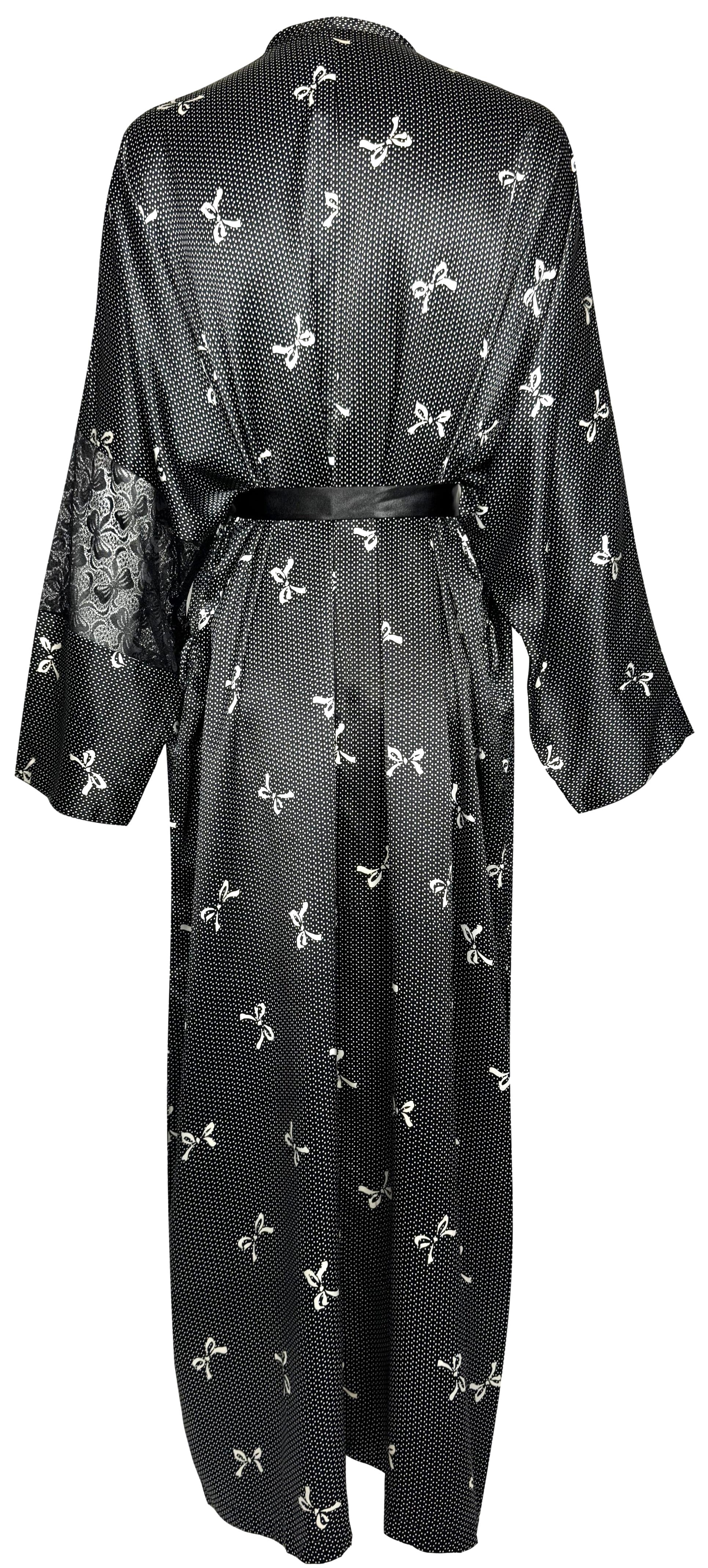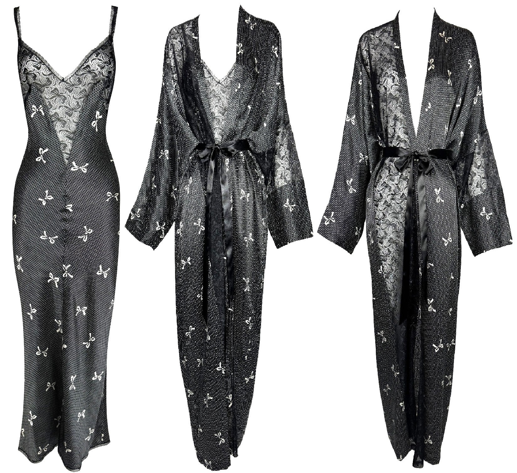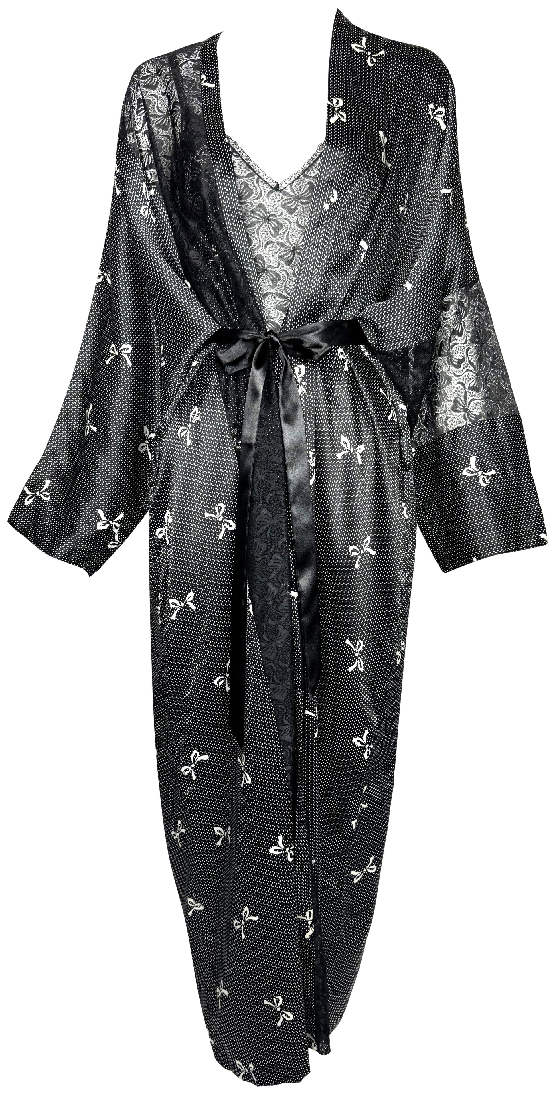 1990's Gianni Versace Black & White Lolita Bow Print Plunging Sheer Lace & Silk Maxi Slip Dress & Dressing Gown Set