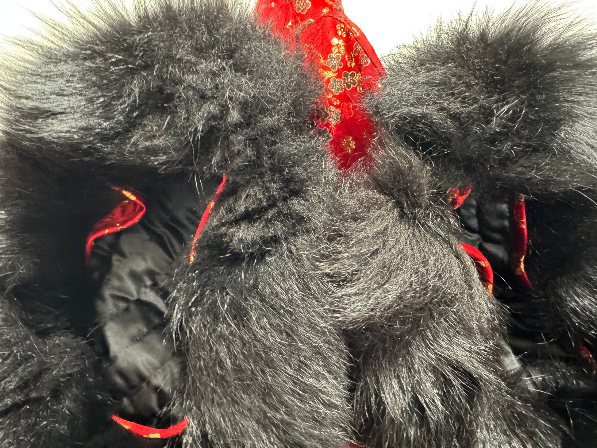 2000's Adrienne Landau Cheongsam Red & Gold Puffer Vest w Faux Fur Trim