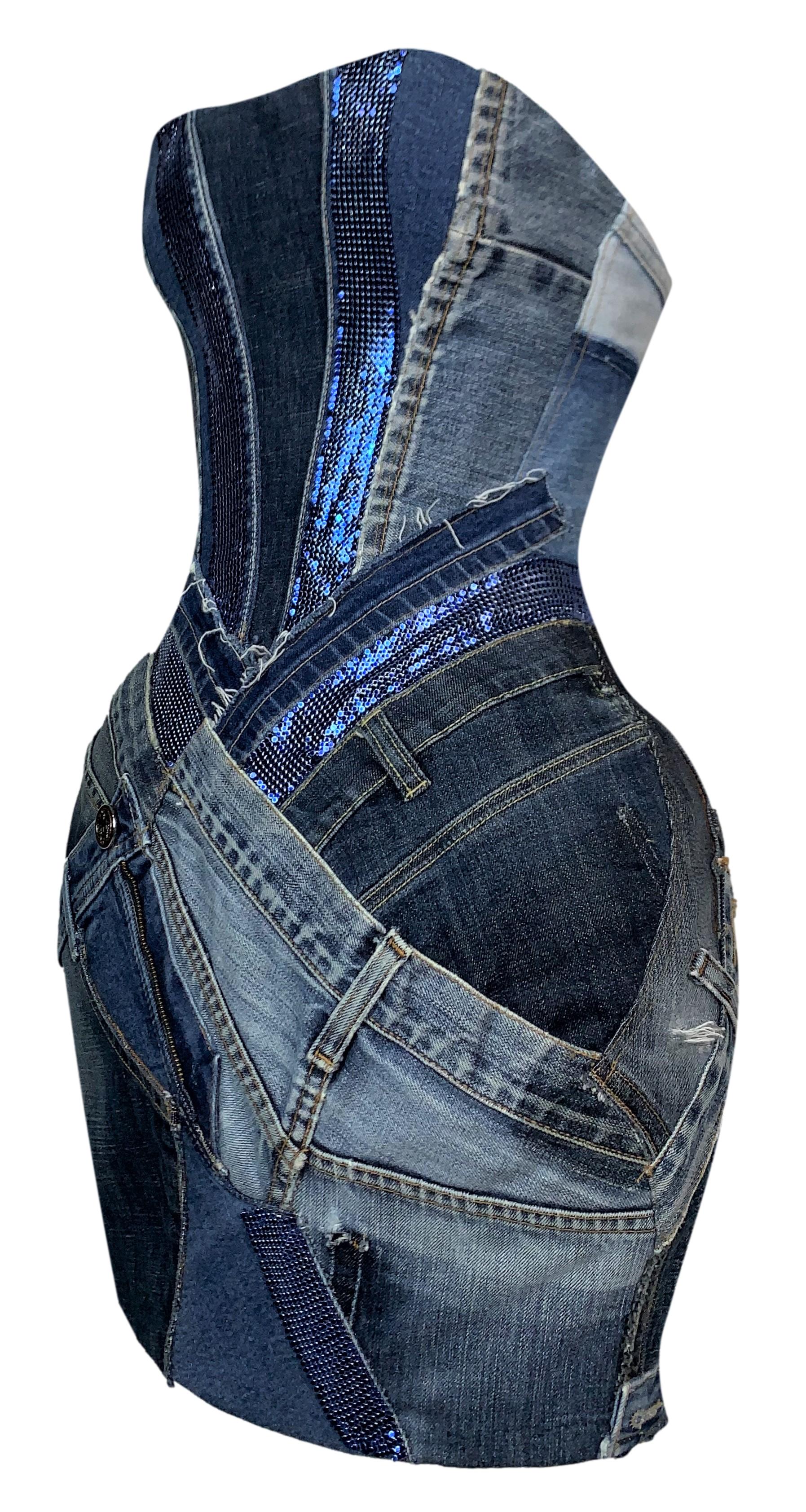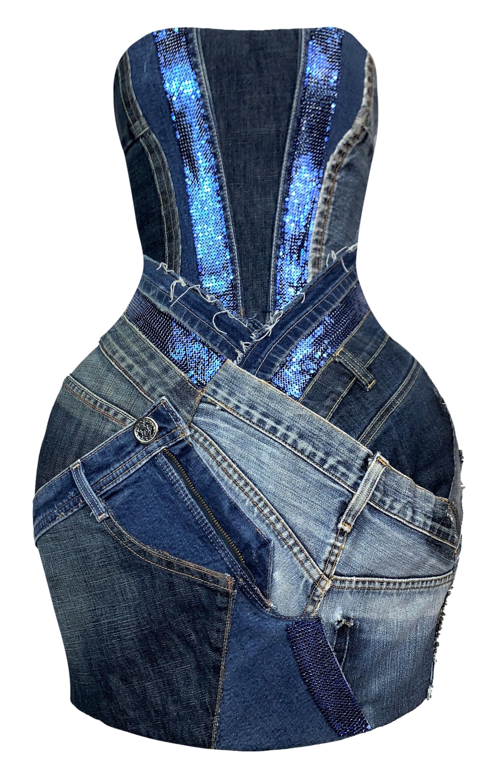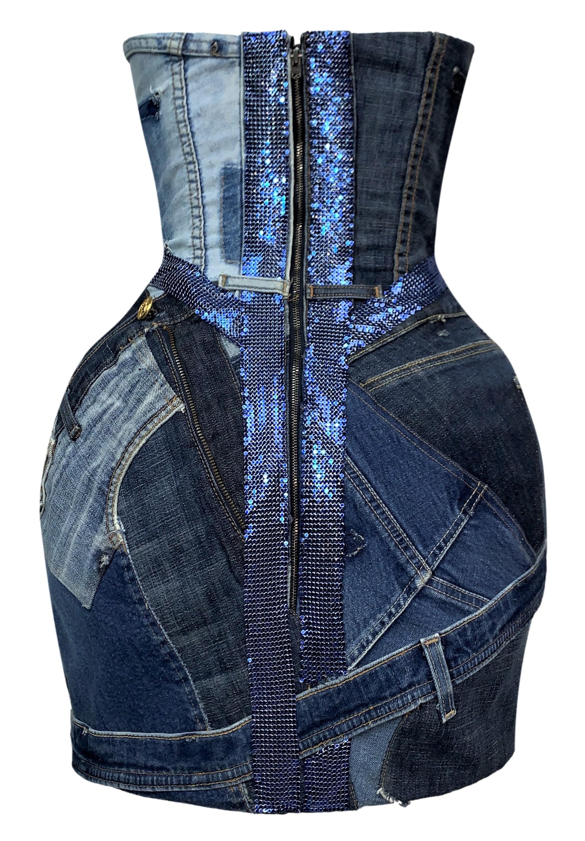 2000's Atelier Versace Couture Distressed Denim Chainmail Exaggerated Hips Strapless Mini Dress