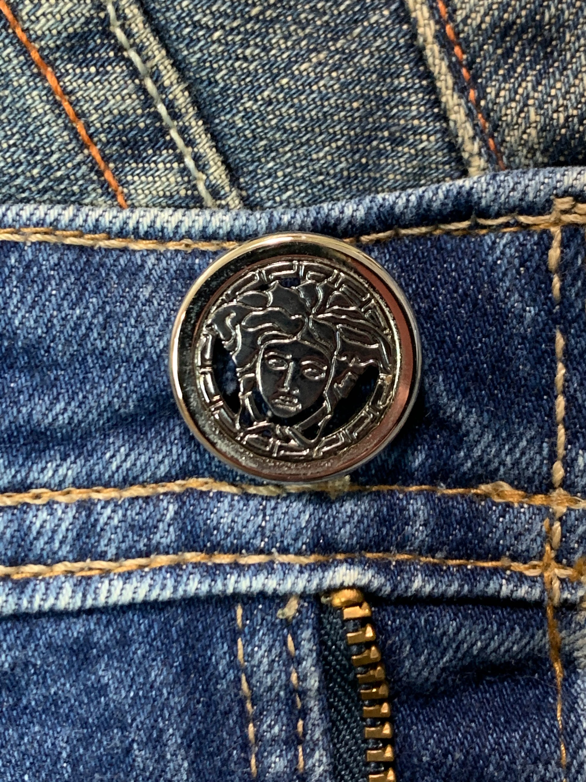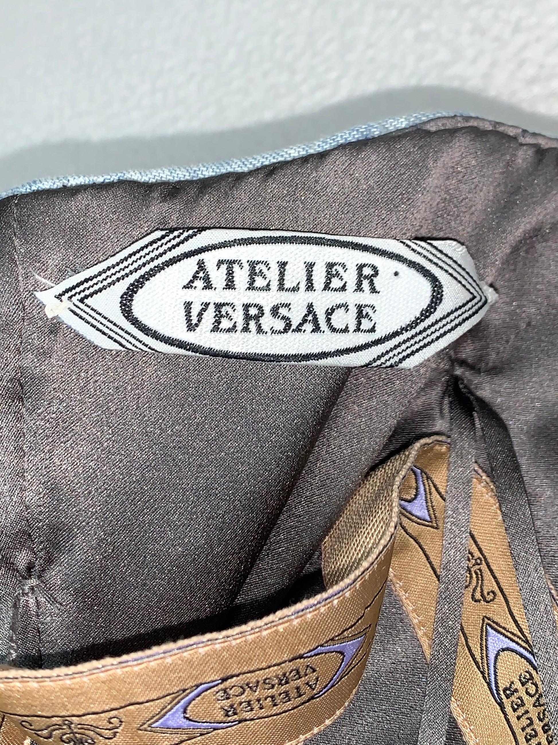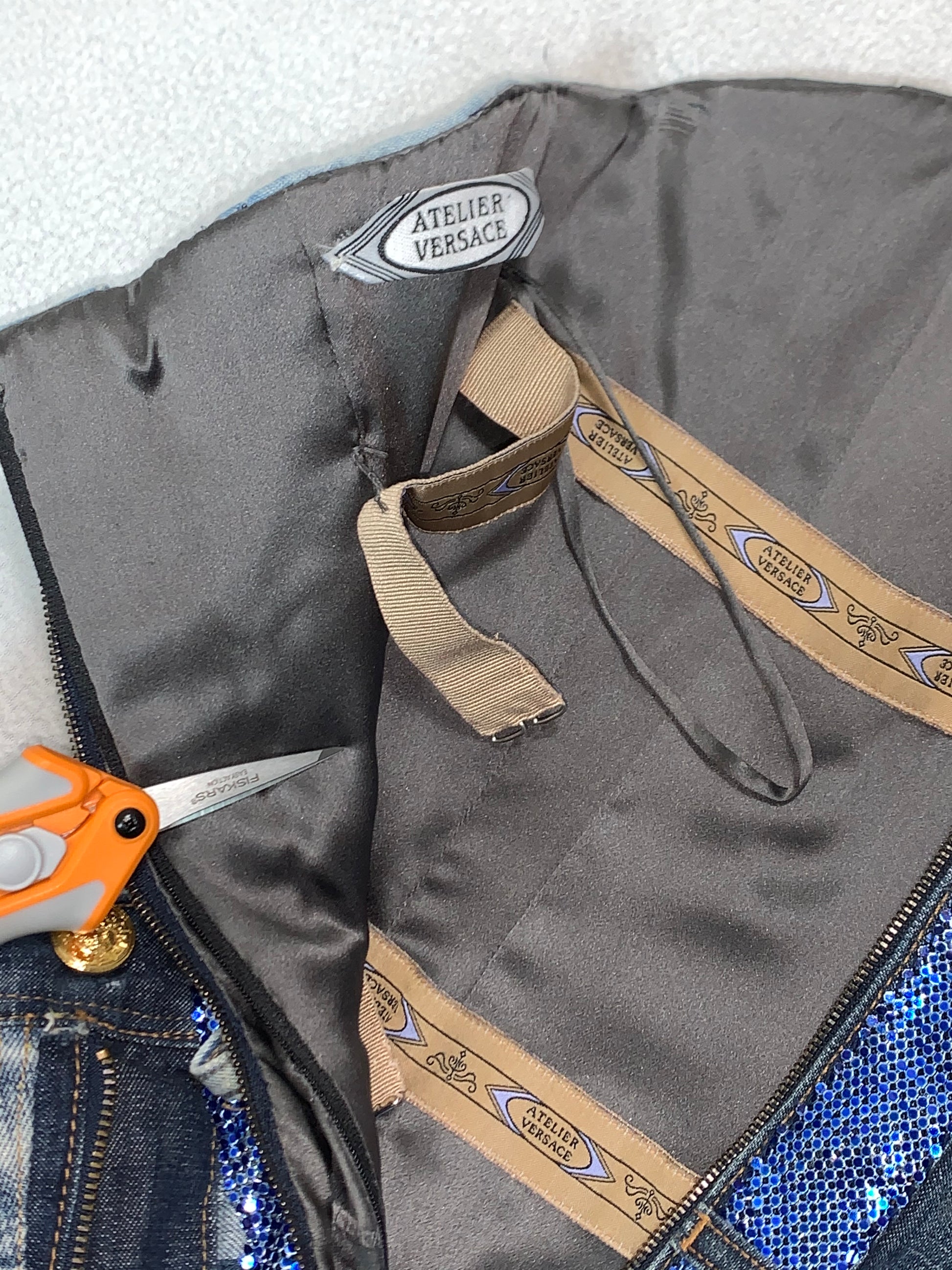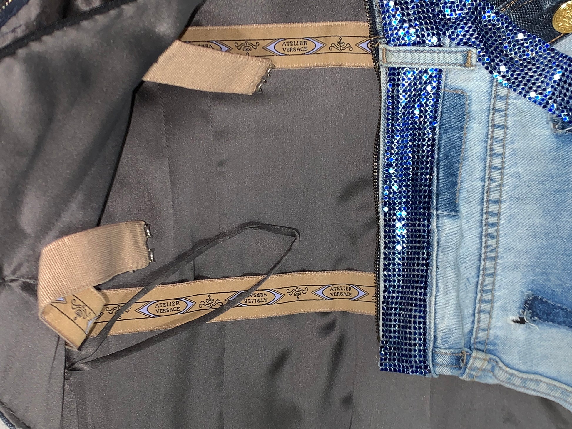 2000's Atelier Versace Couture Distressed Denim Chainmail Exaggerated Hips Strapless Mini Dress