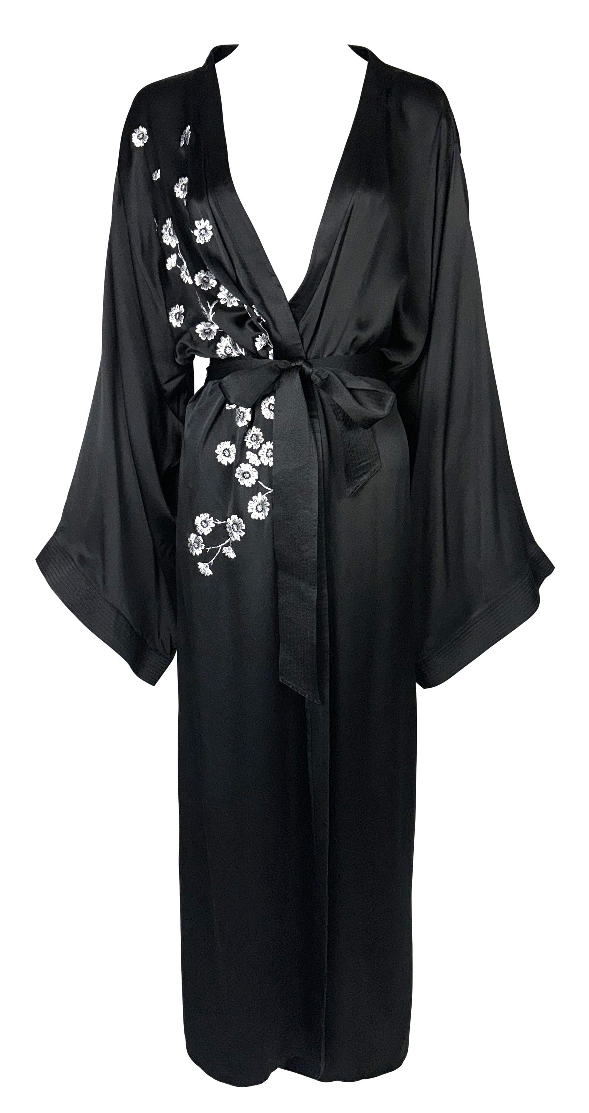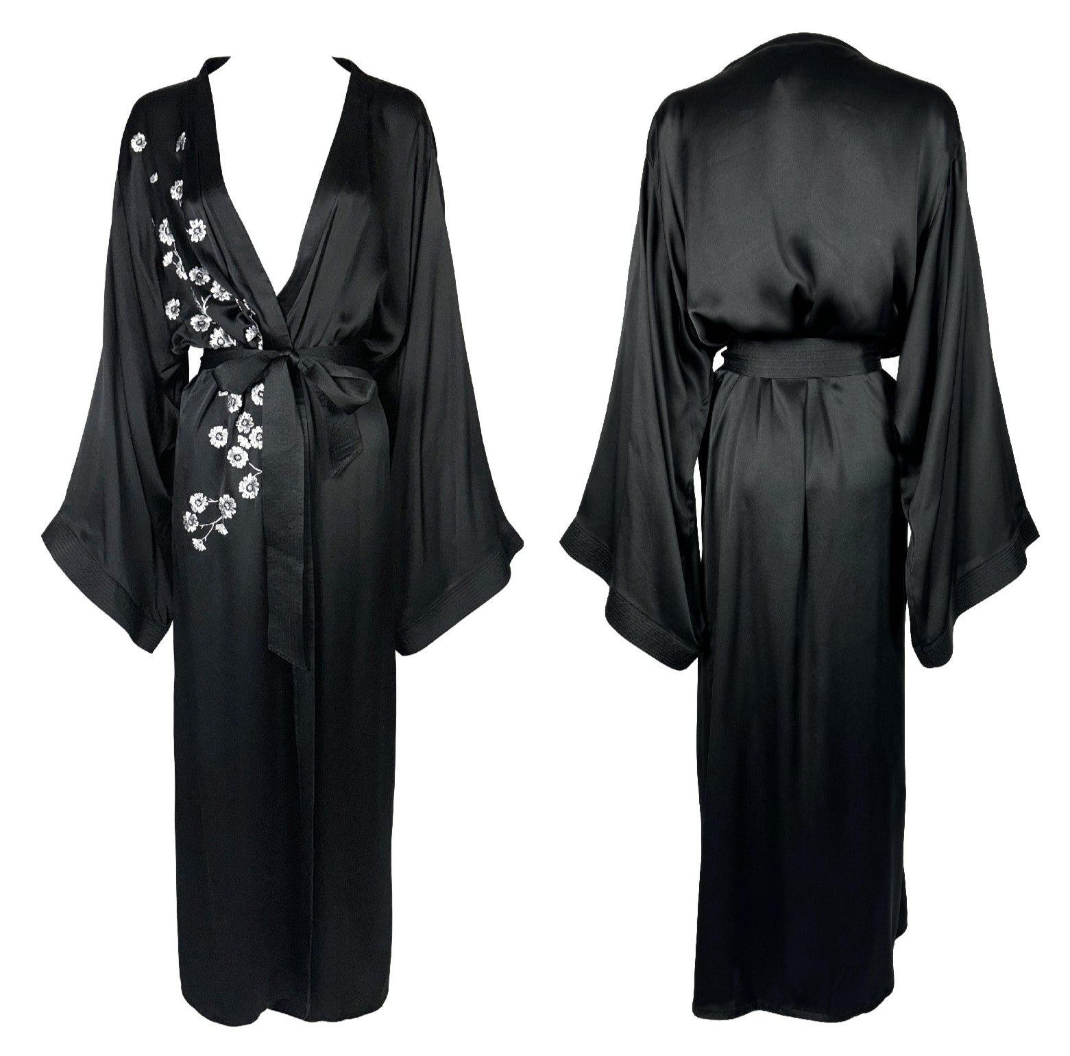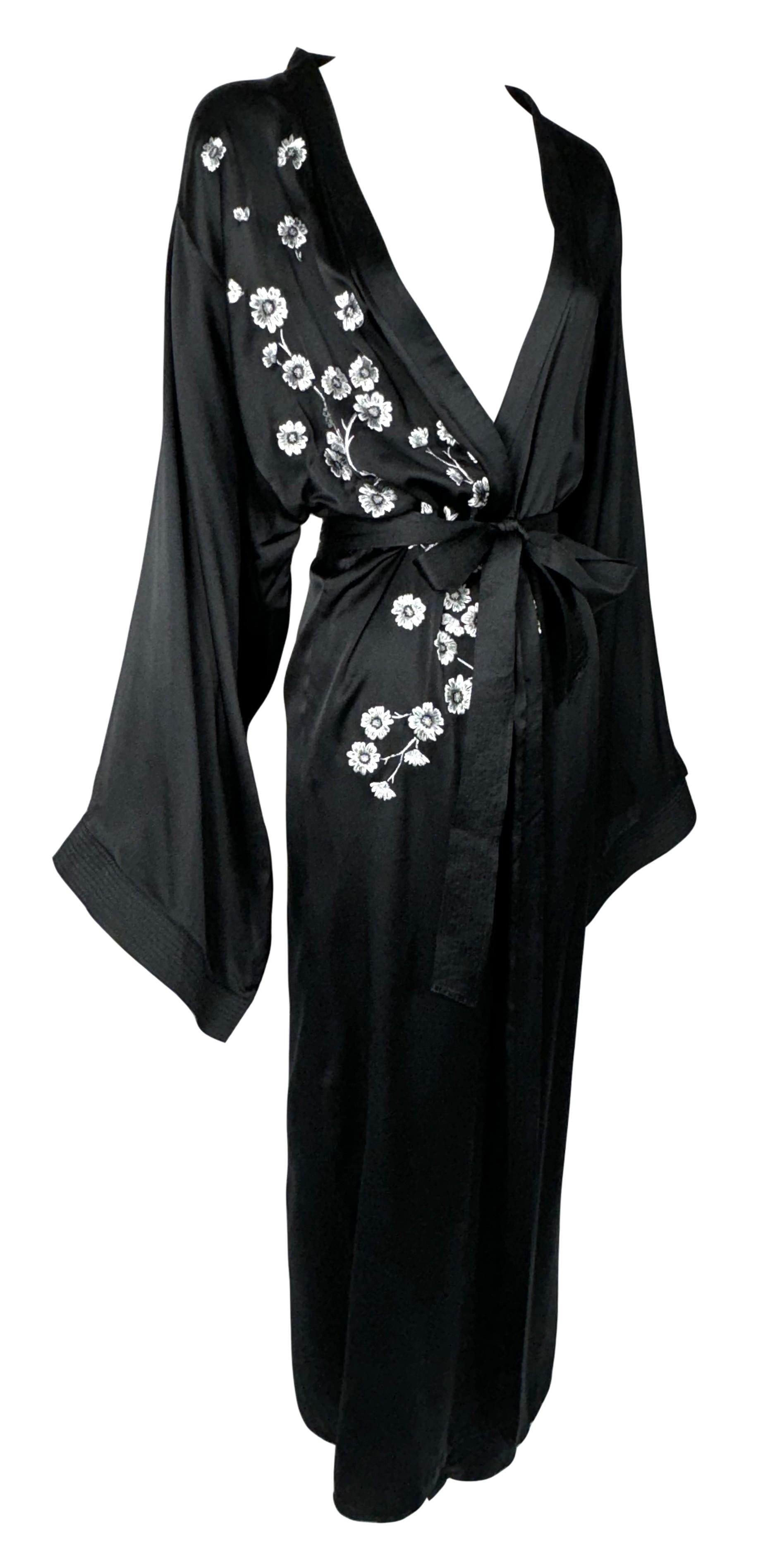 2000's Christian Dior by John Galliano Black Silk White Cherry Blossom Kimono Robe
