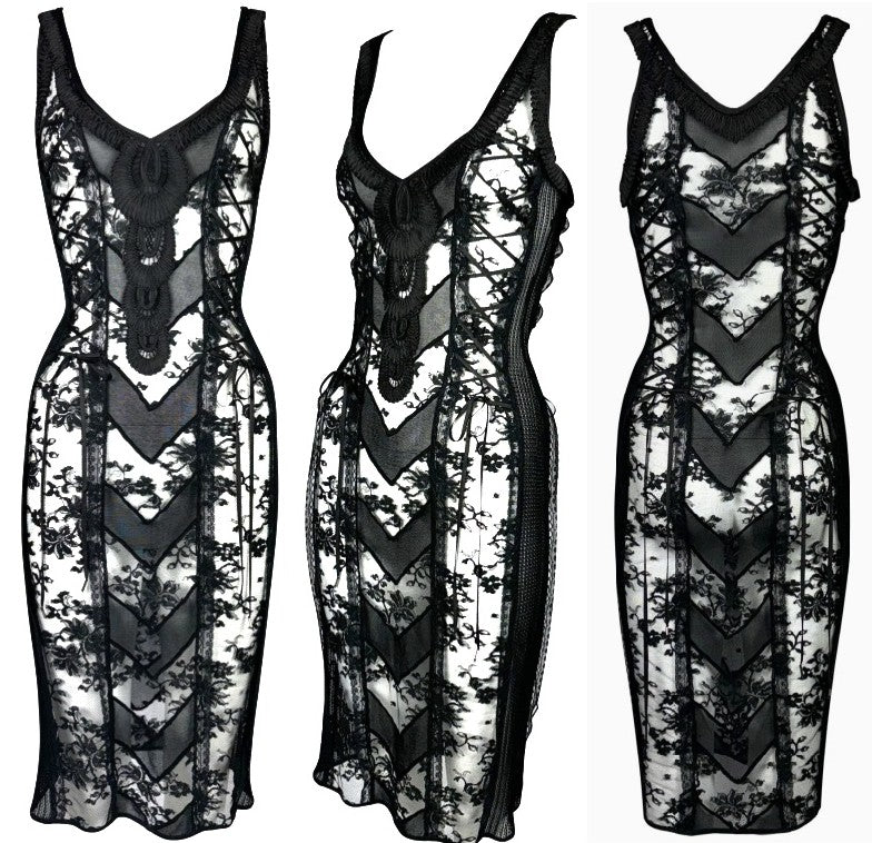 2003 Christian Dior by John Galliano Sheer Black Lace Corset Lace Up Dress