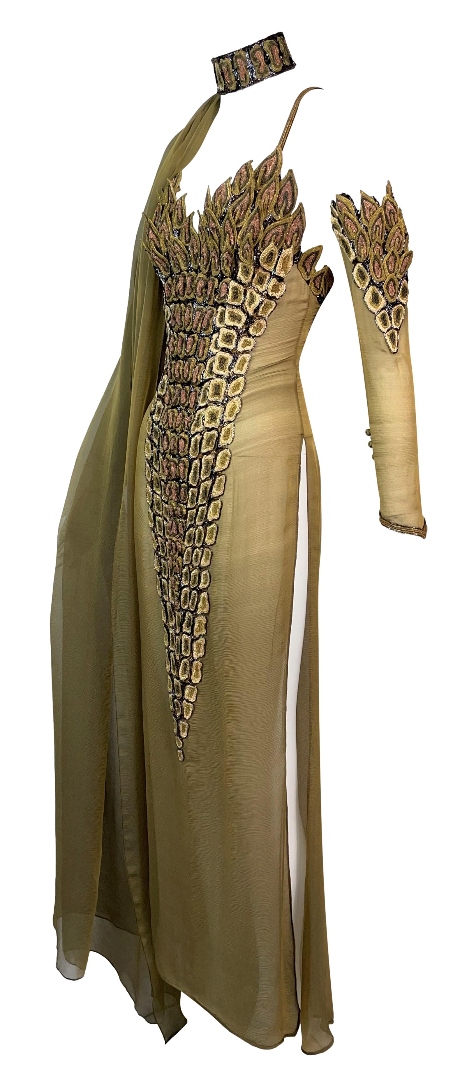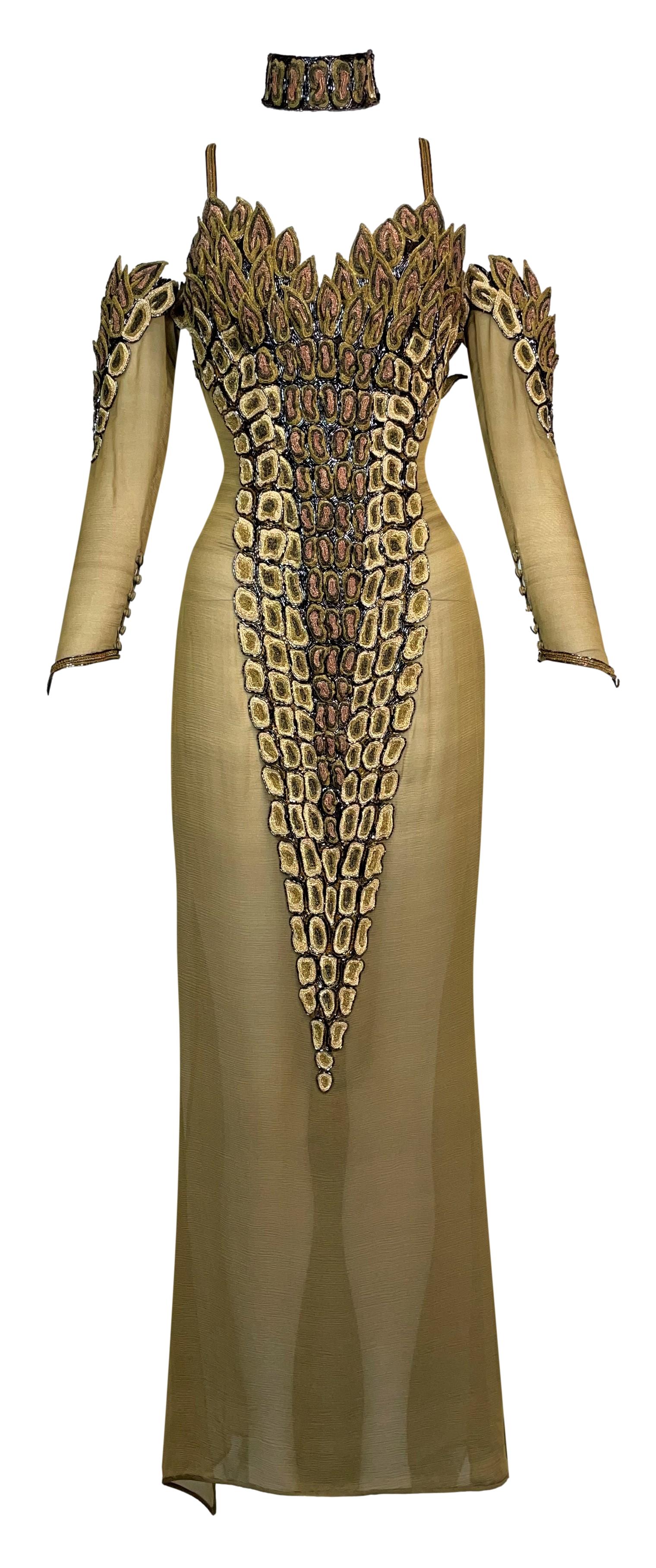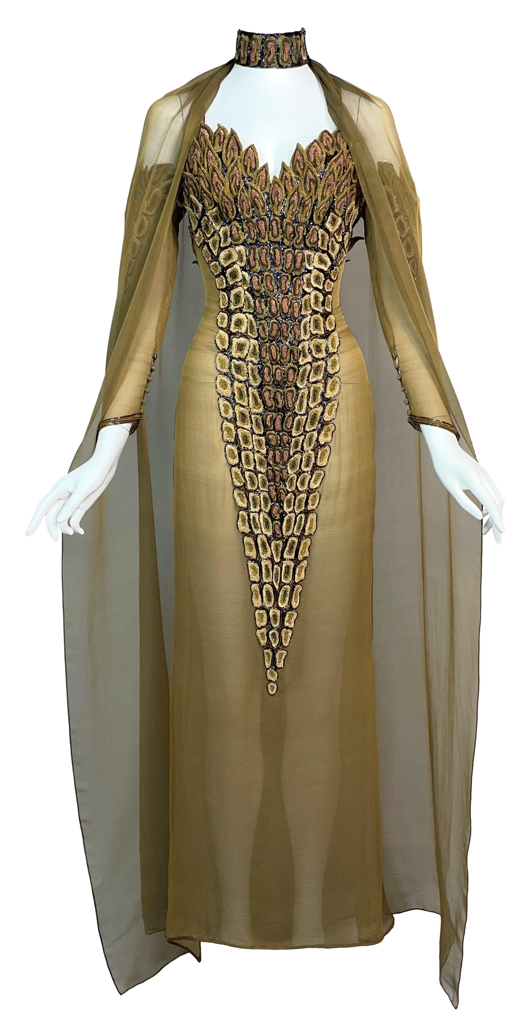 2003 Lloyd Klein Haute Couture Sheer Nude Silk Lesage Beaded Crocodile High Slits Dress w Choker & Cape