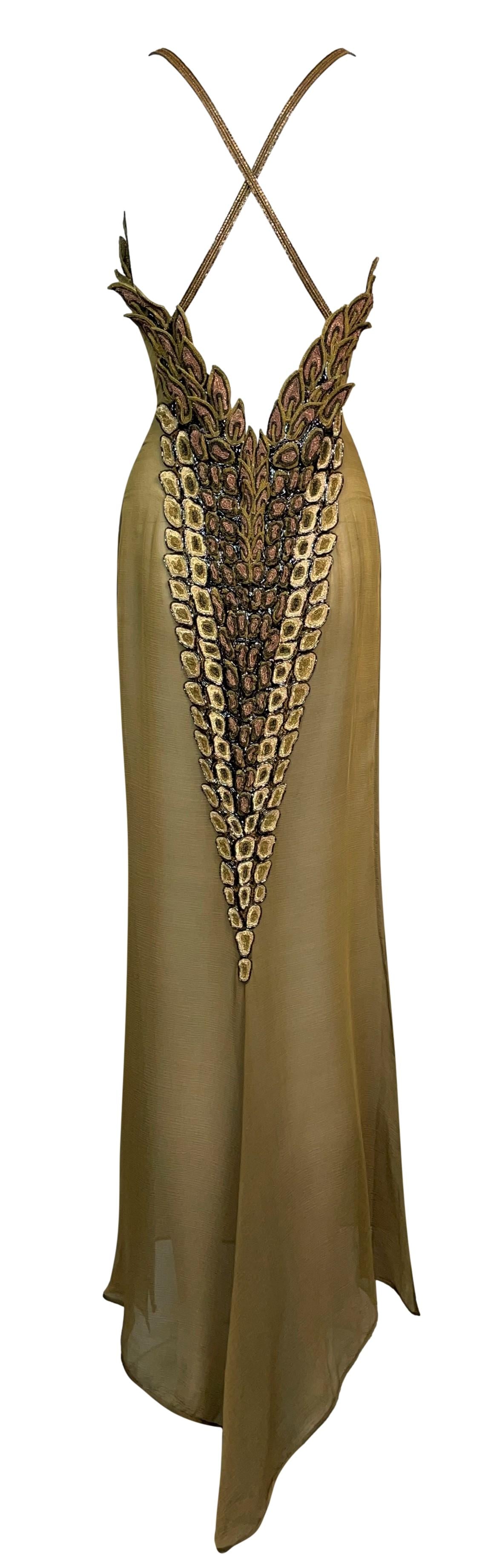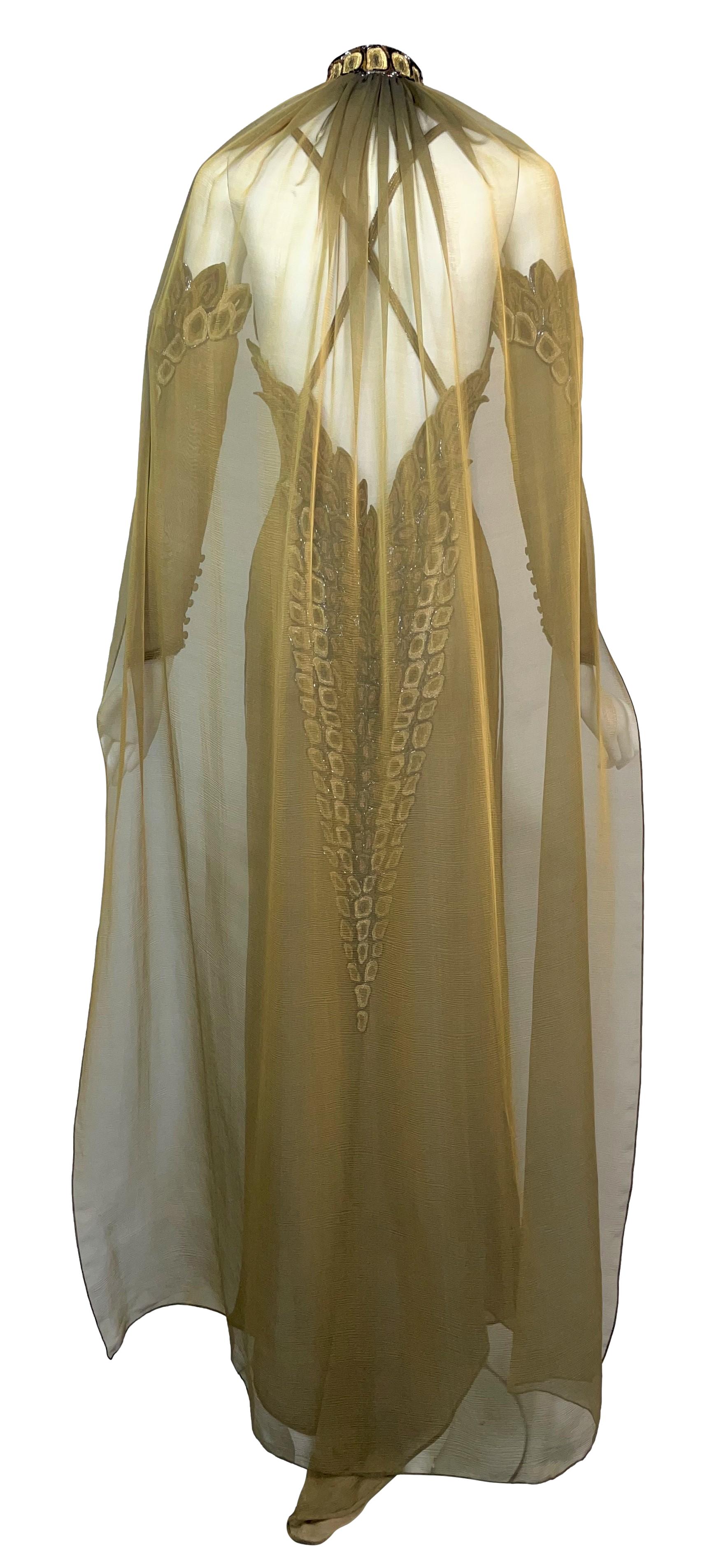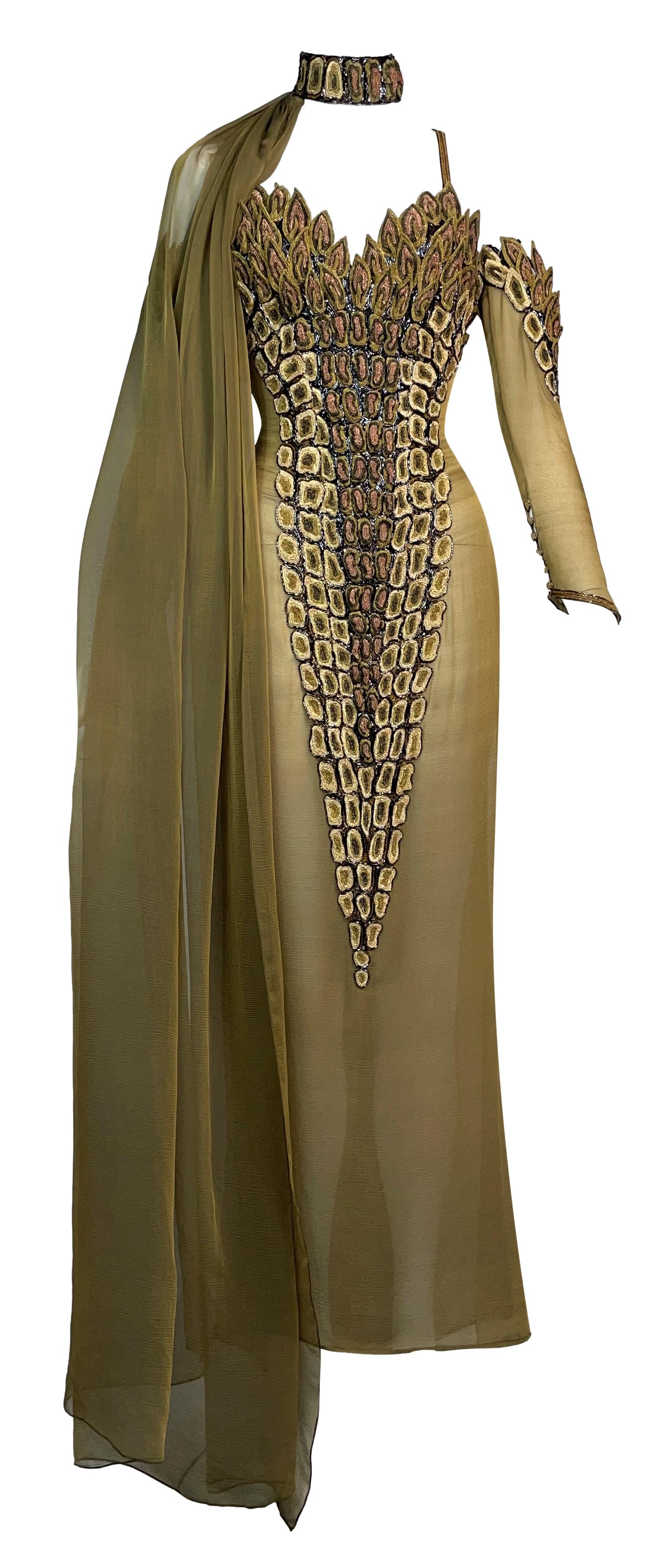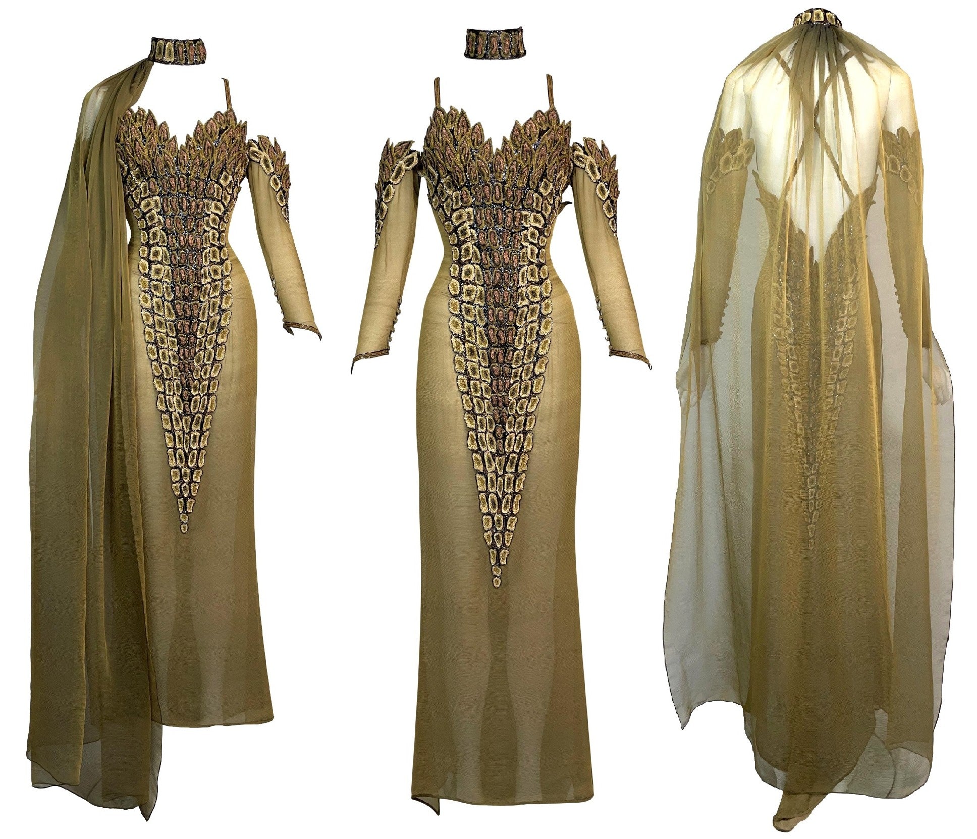 2003 Lloyd Klein Haute Couture Sheer Nude Silk Lesage Beaded Crocodile High Slits Dress w Choker & Cape