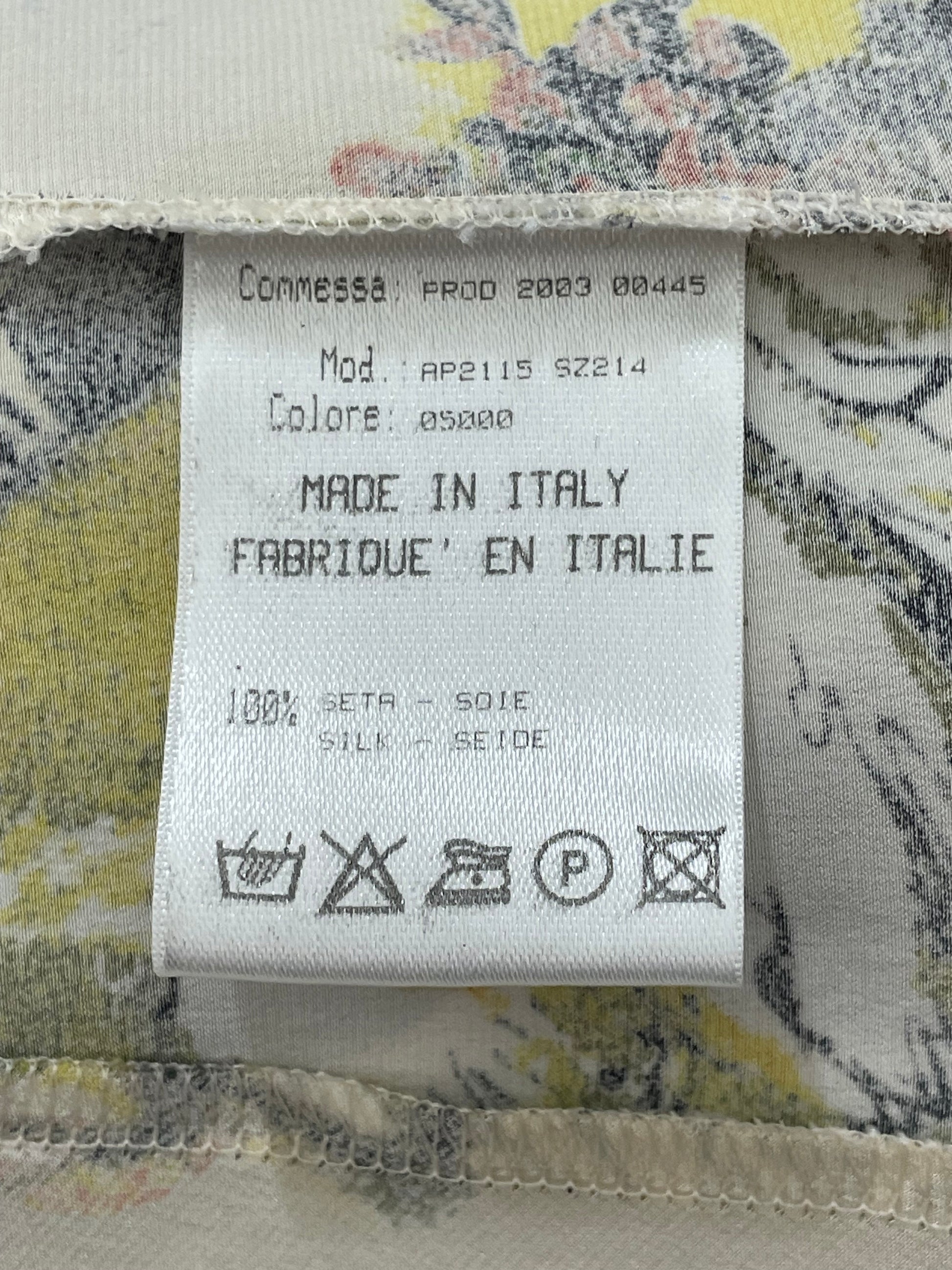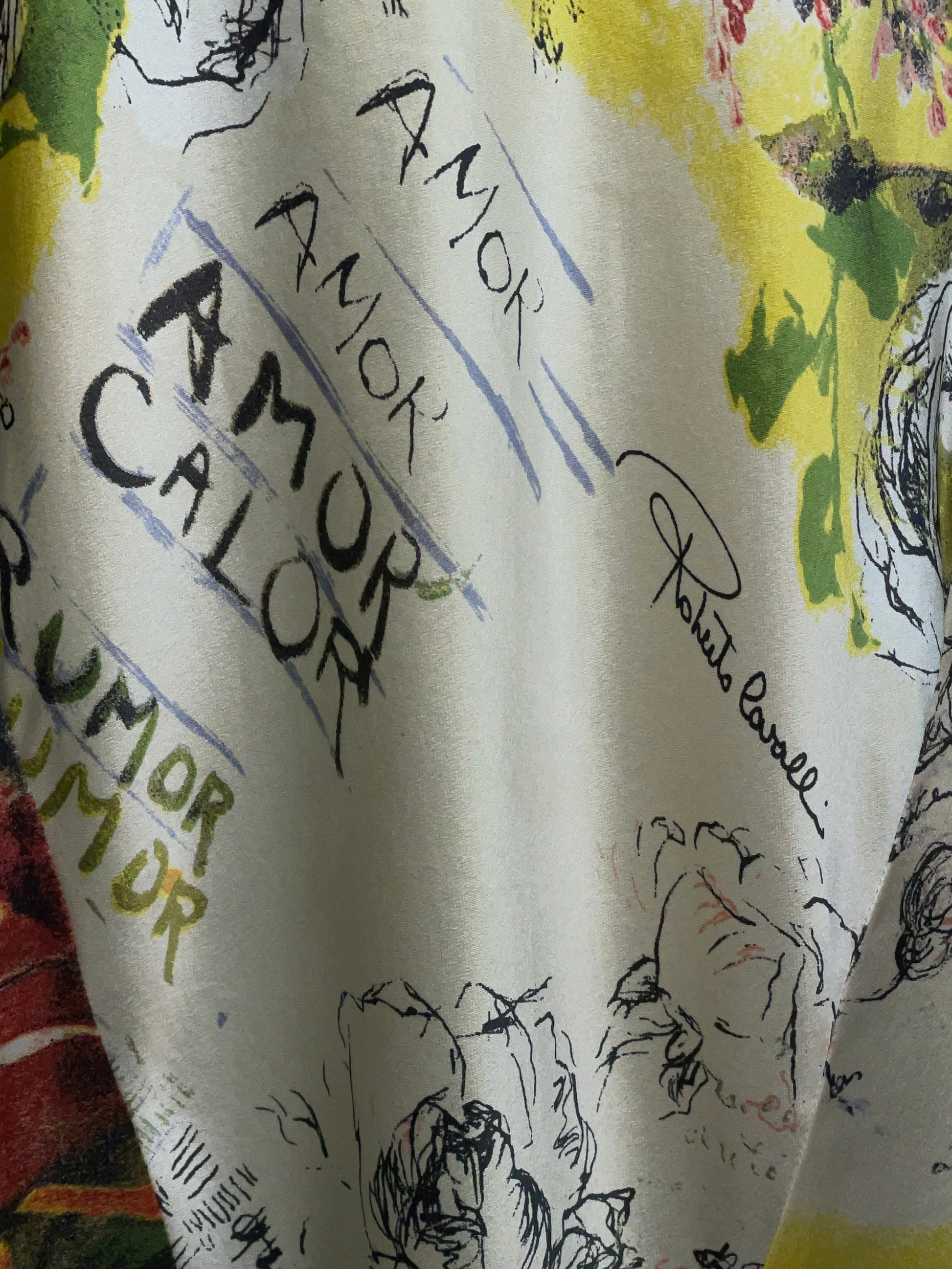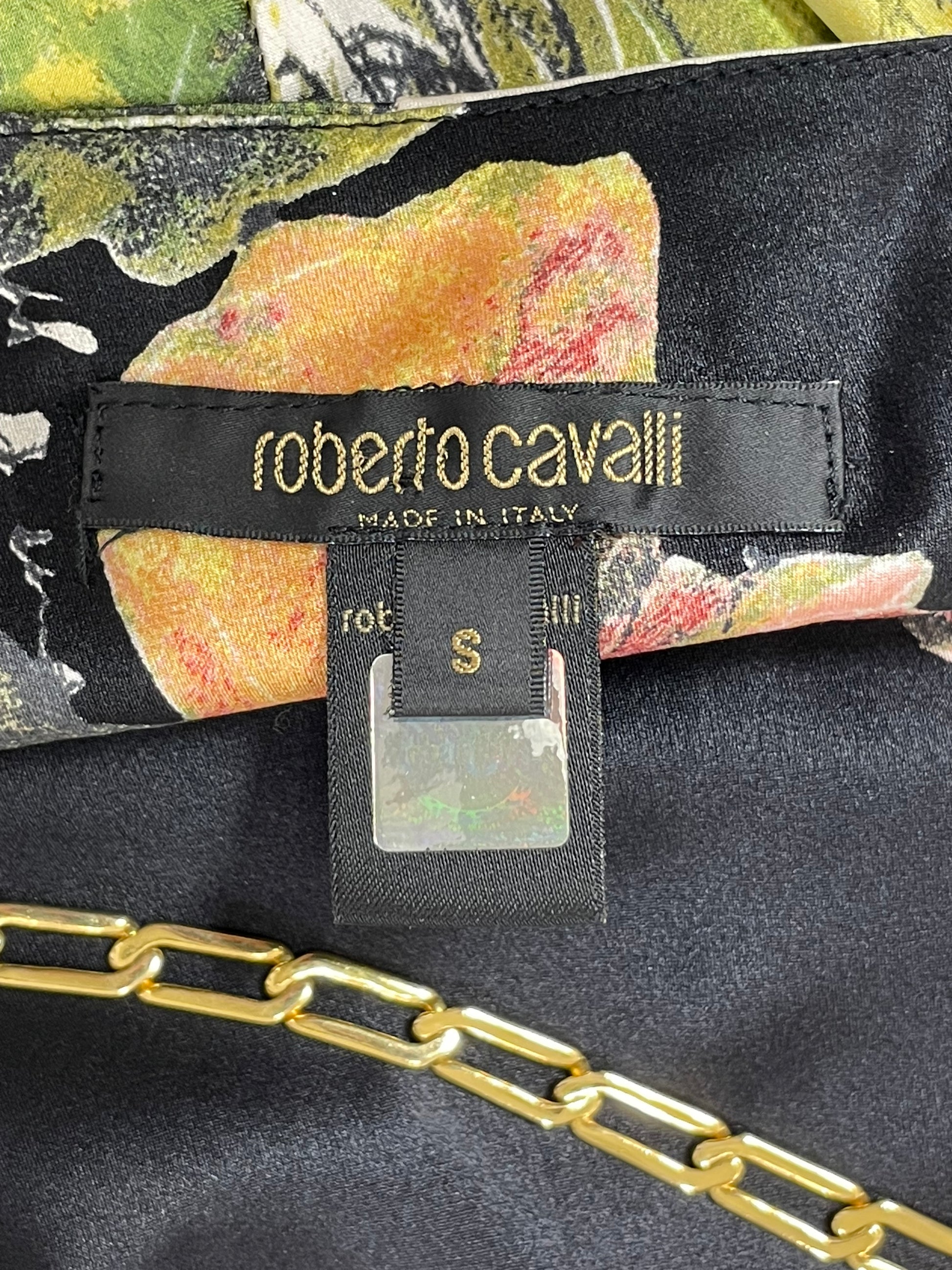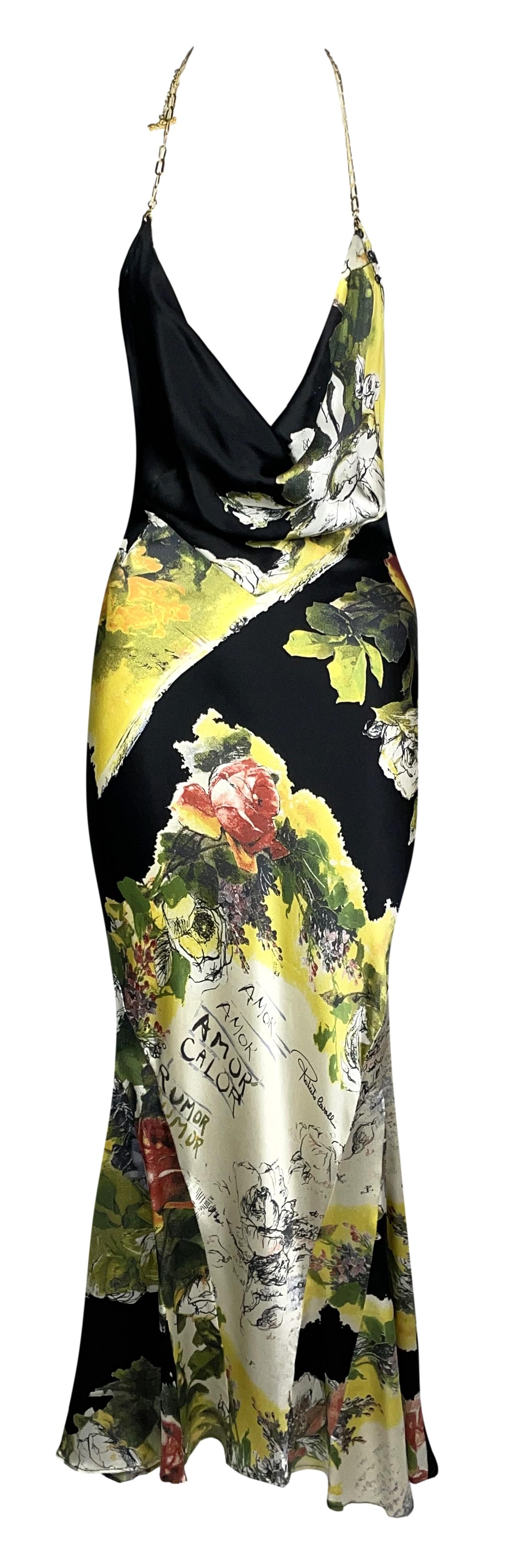 2003 Roberto Cavalli Plunging Black Amor Print Silk Mermaid Maxi Dress w Gold Chain Strap