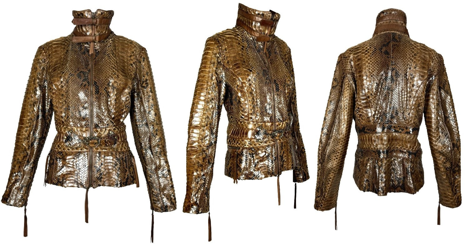 2005 Roberto Cavalli Brown Python Fitted Motorcycle Jacket w Gold Serpent Buckle