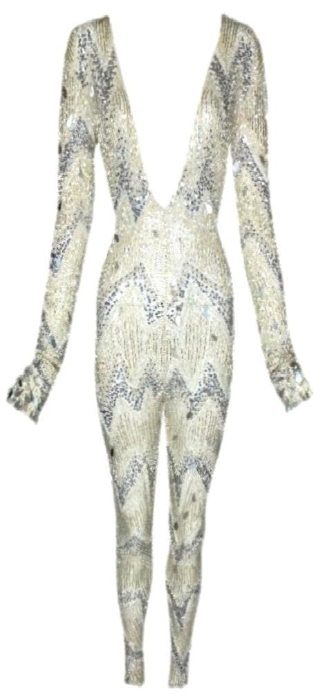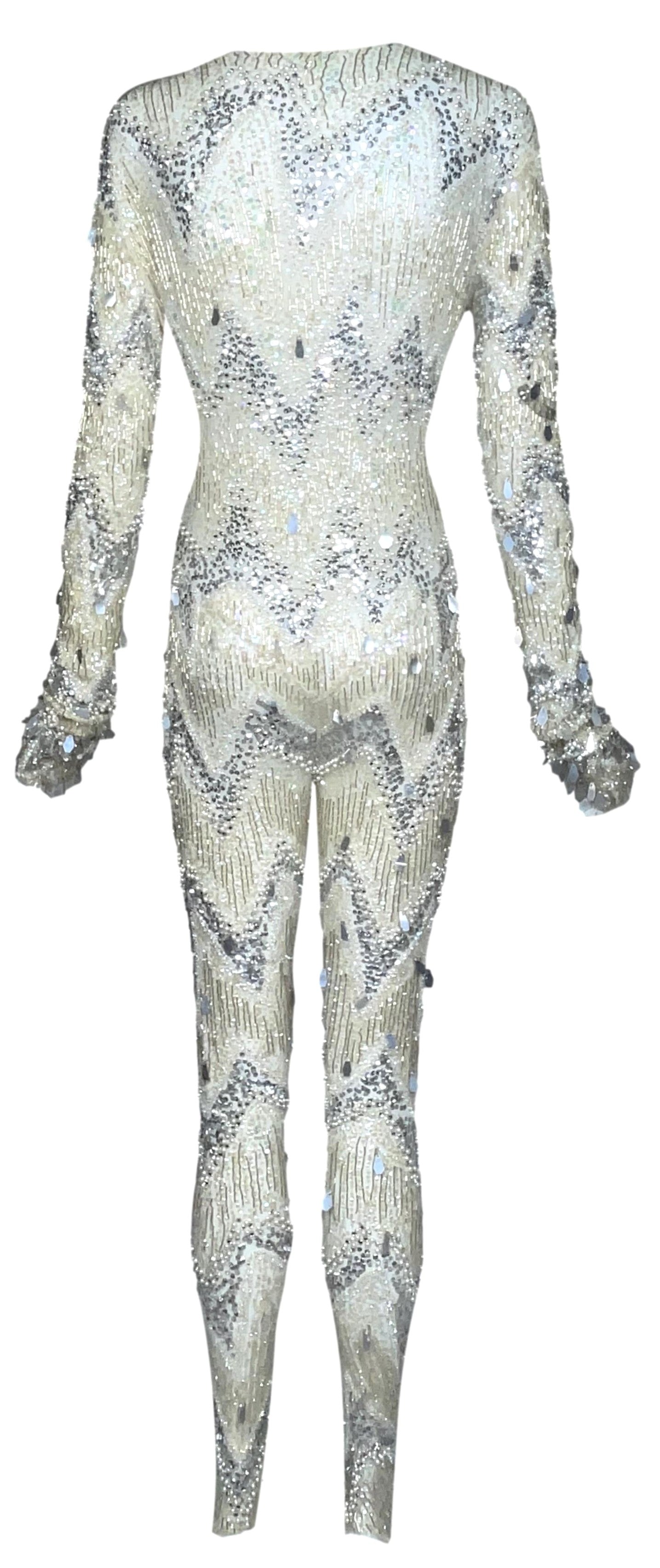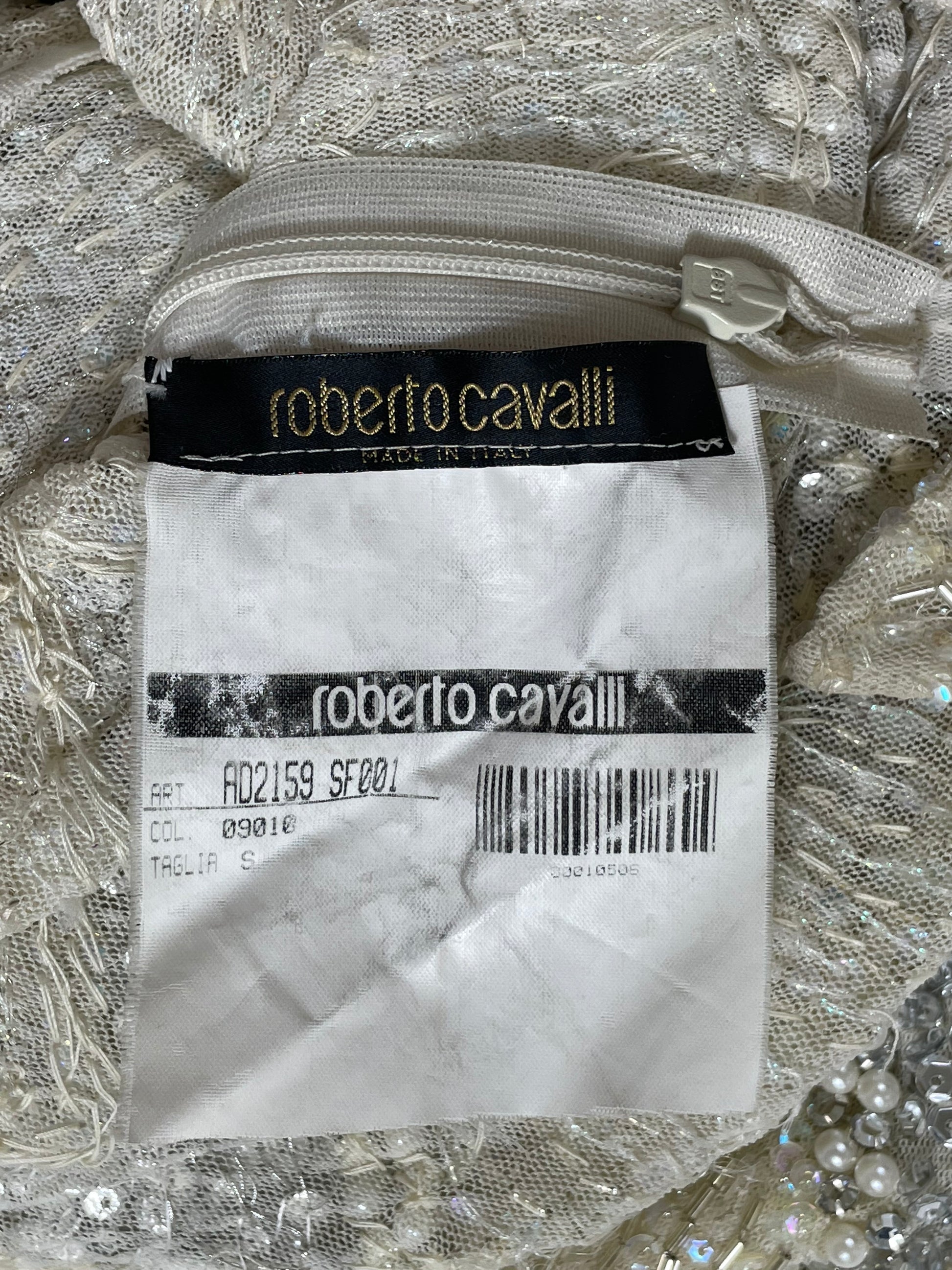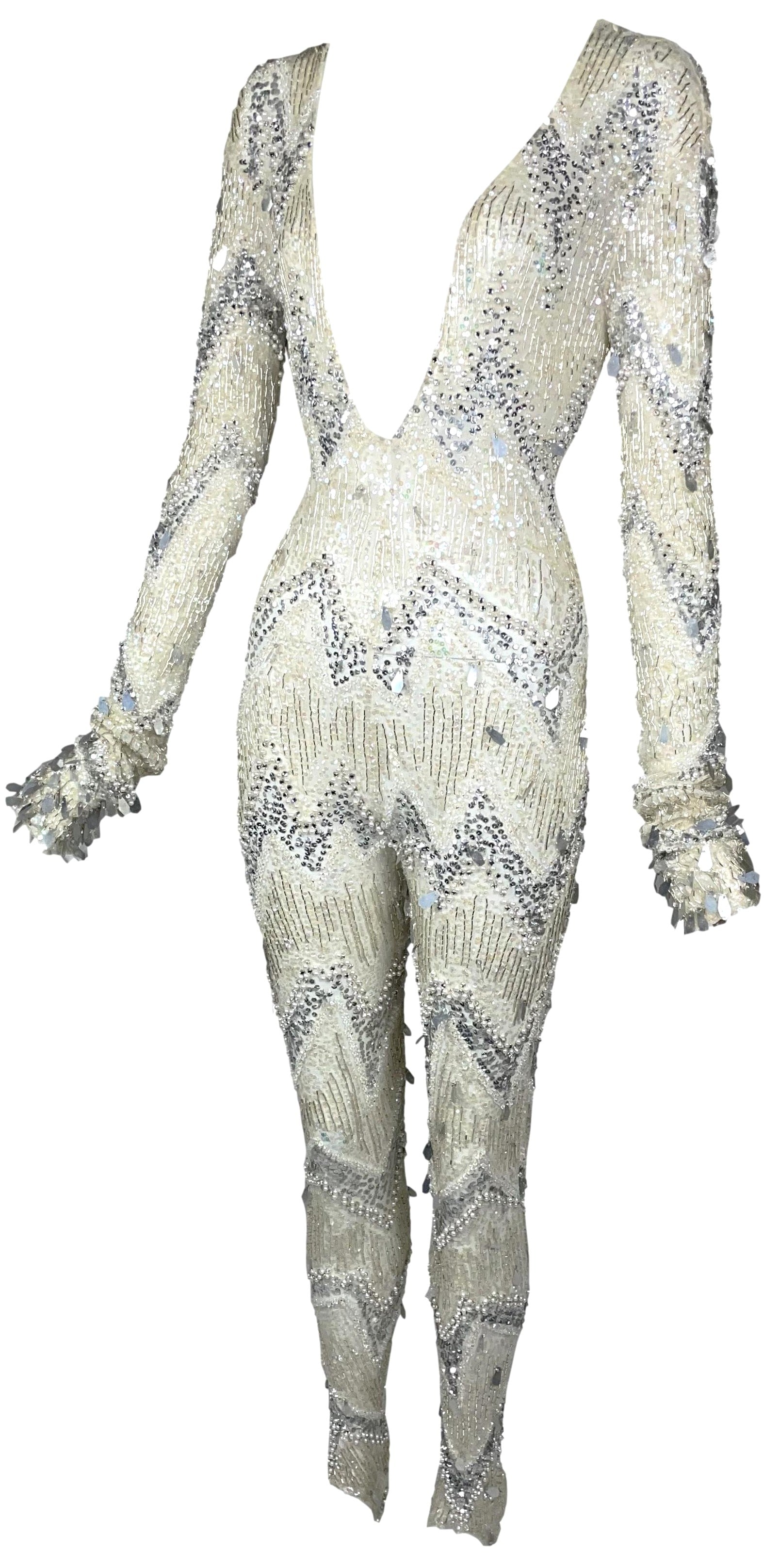 EXTREMELY RARE F/W 2003 Roberto Cavalli Runway Sheer Ivory Mesh Plunging Crystal Beaded Jumpsuit