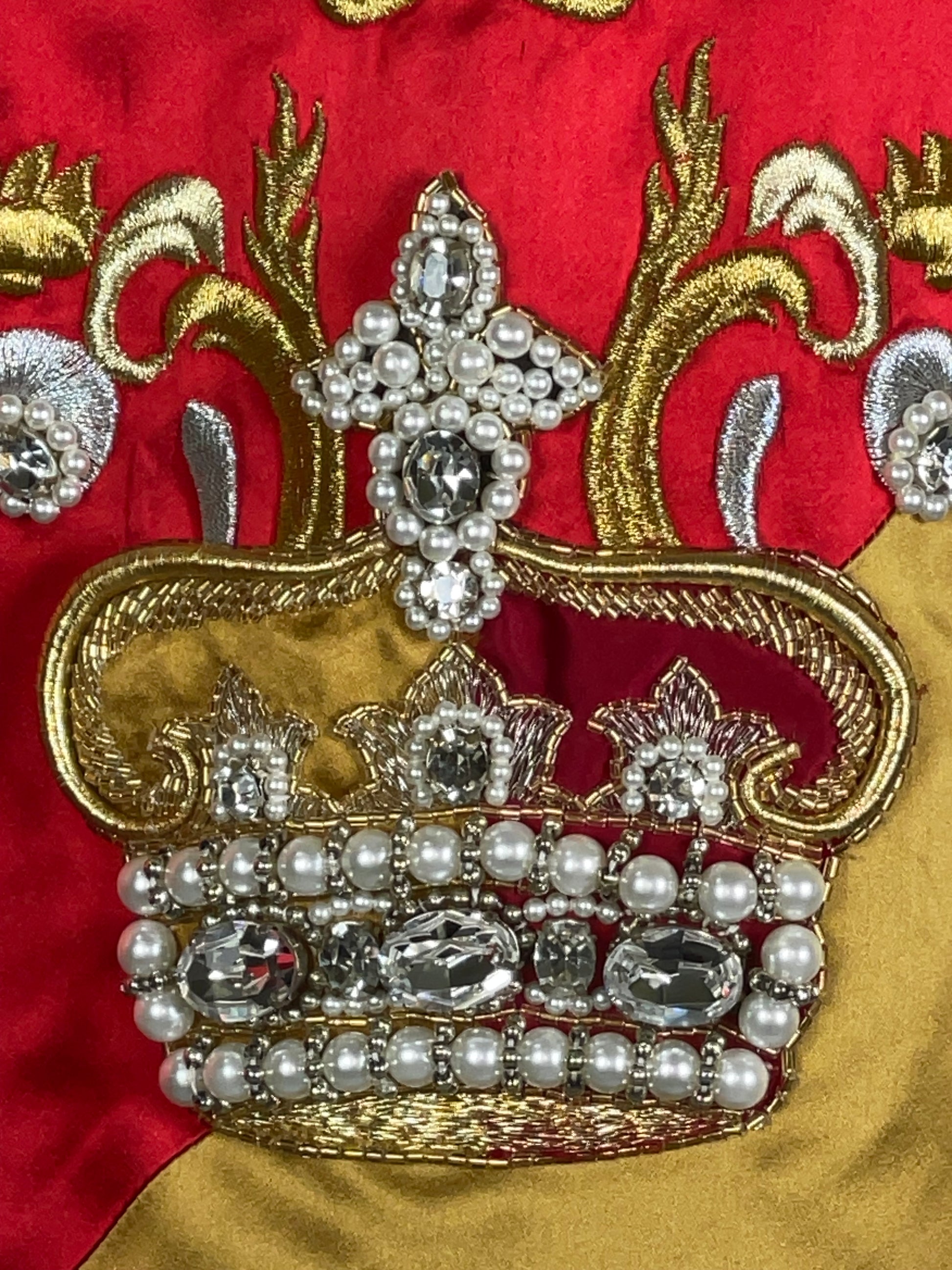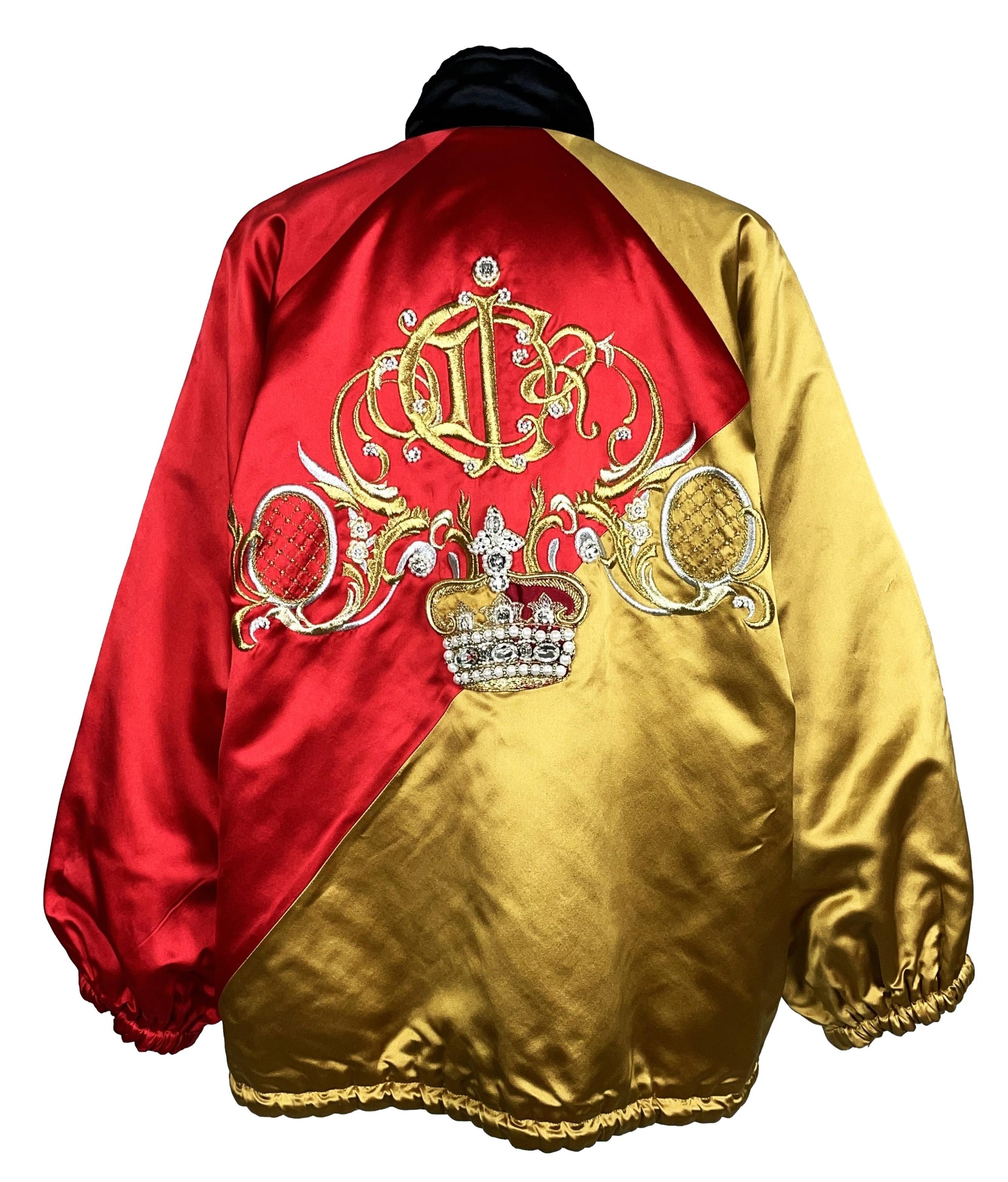 F/W 1990 Christian Dior by Gianfranco Ferre Runway Red & Gold Embellished Crown Baggy Reversible Coat Jacket