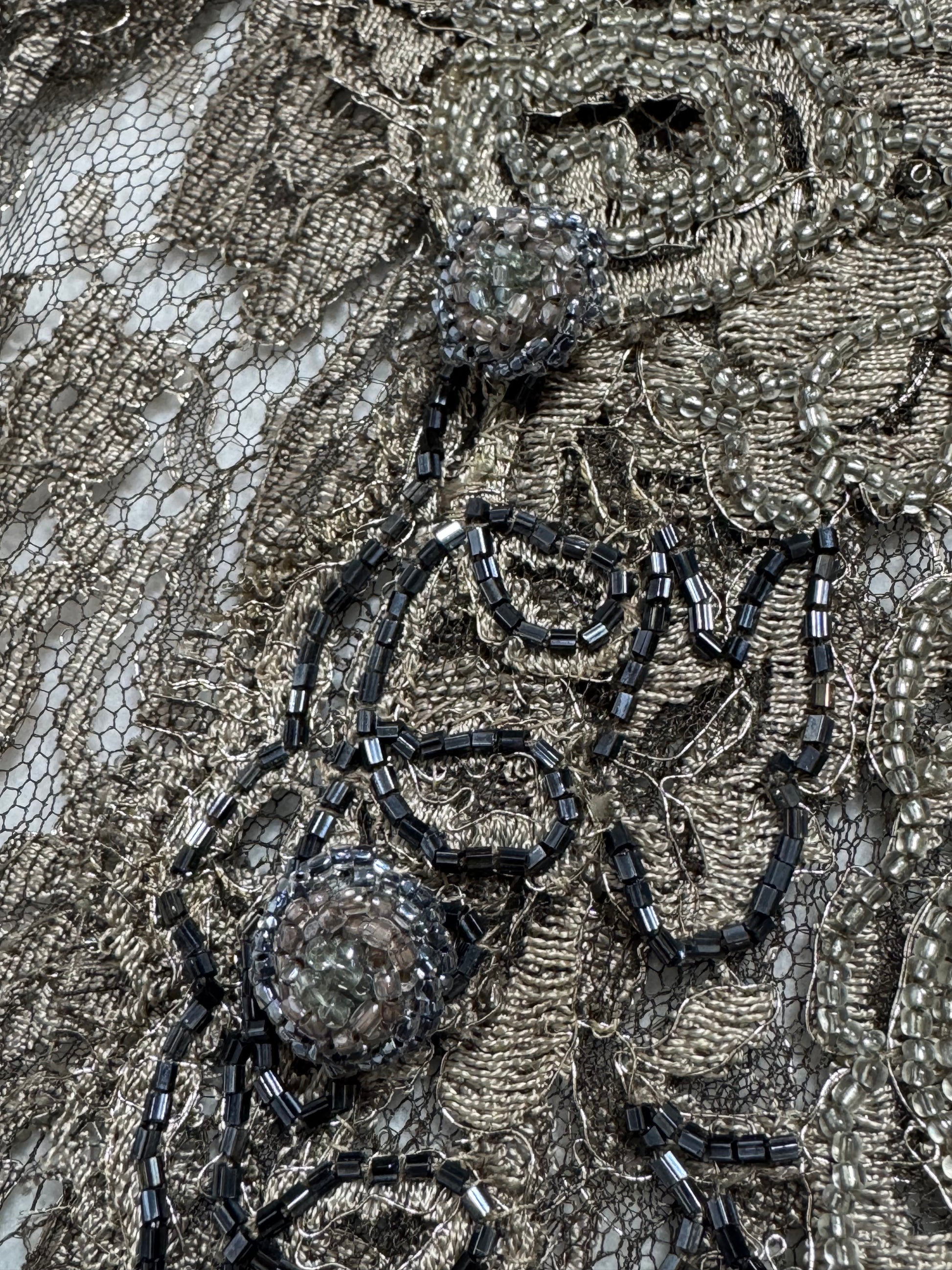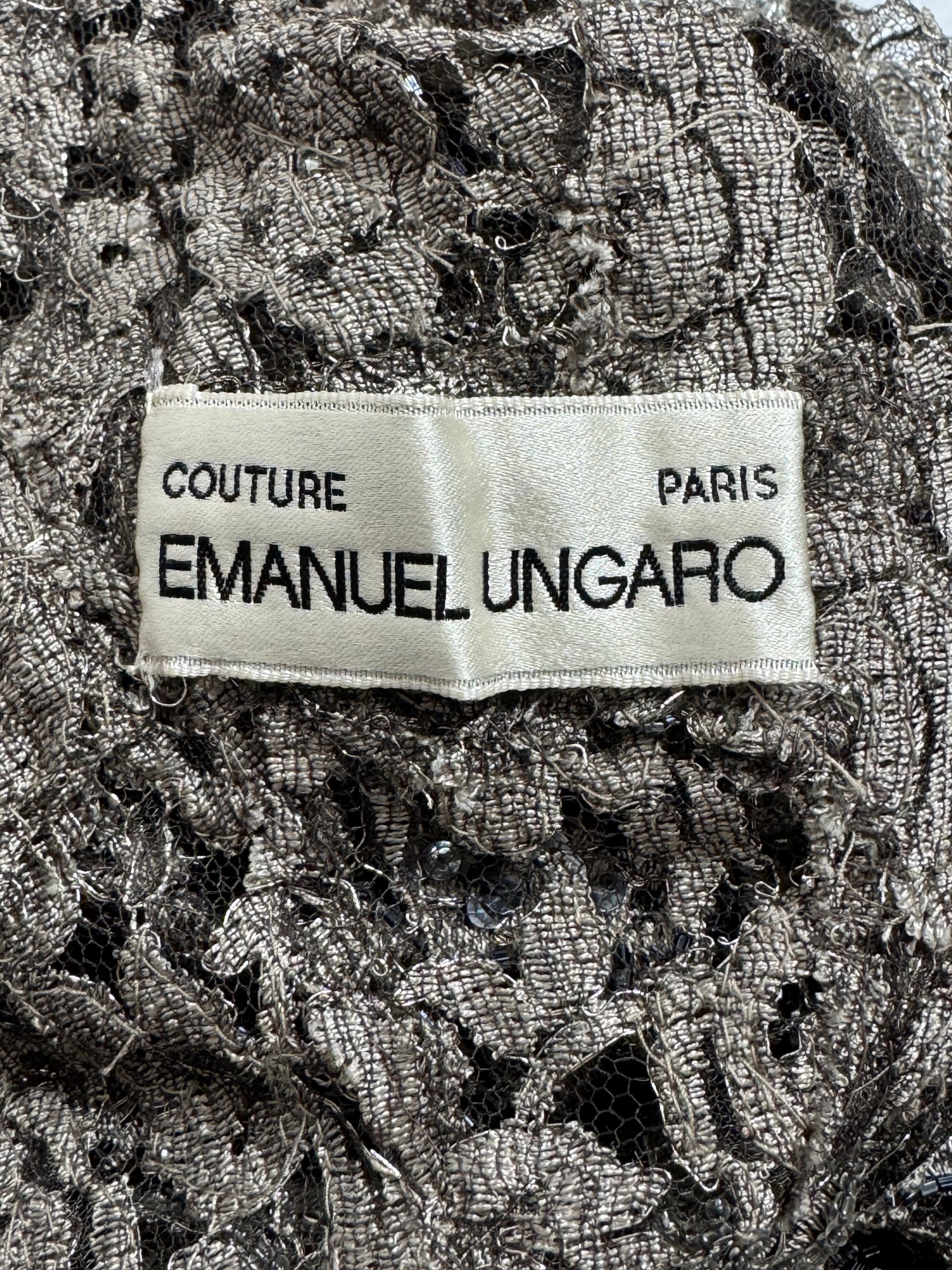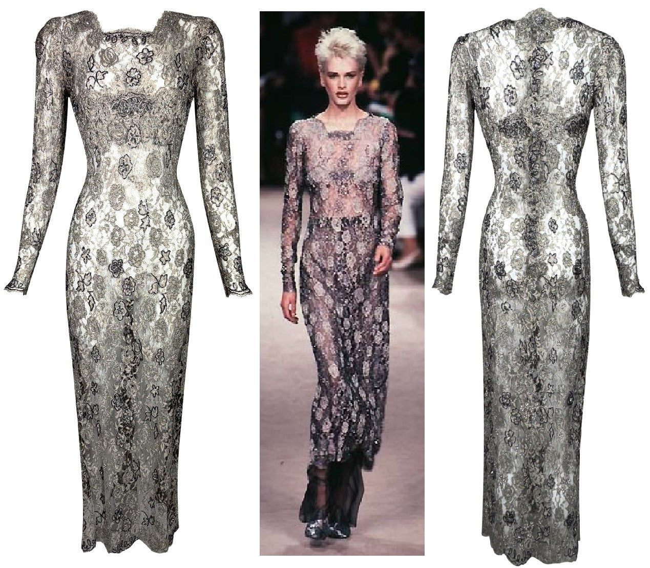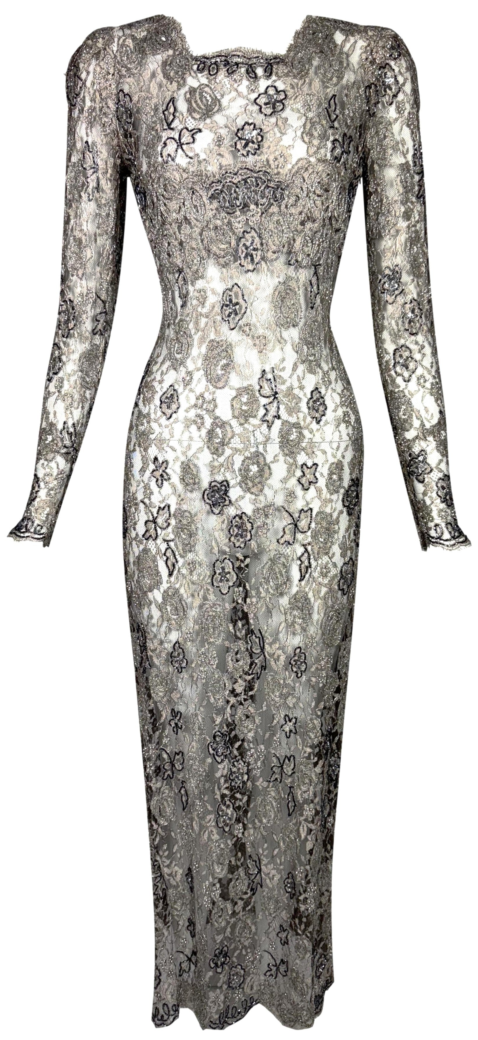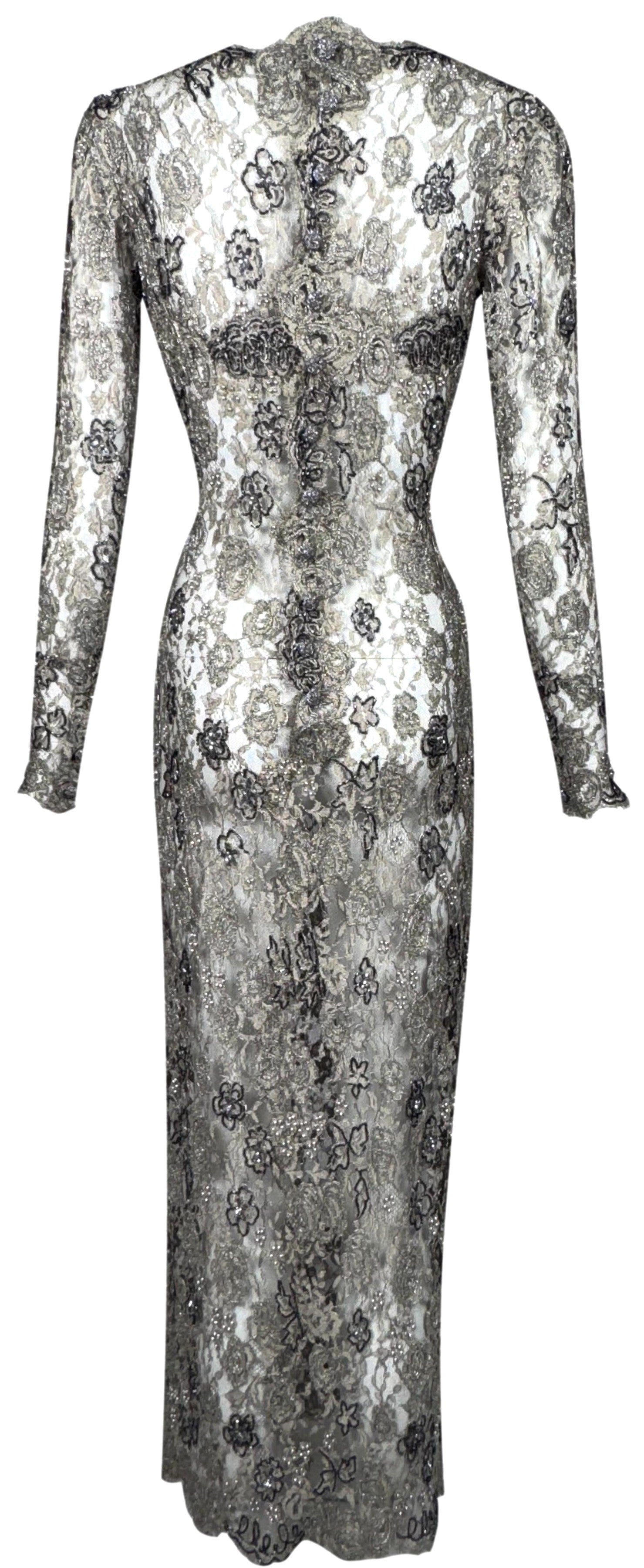 F/W 1996 Emanuel Ungaro Haute Couture Runway Sheer Silver Lace Beaded L/S Column Maxi Dress