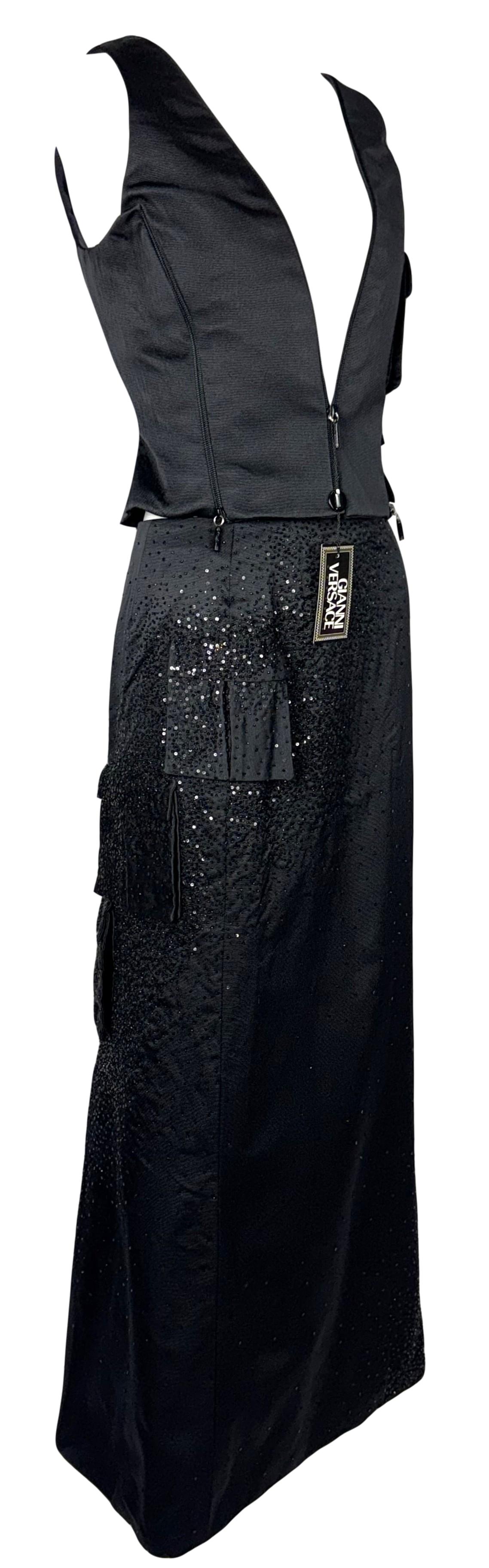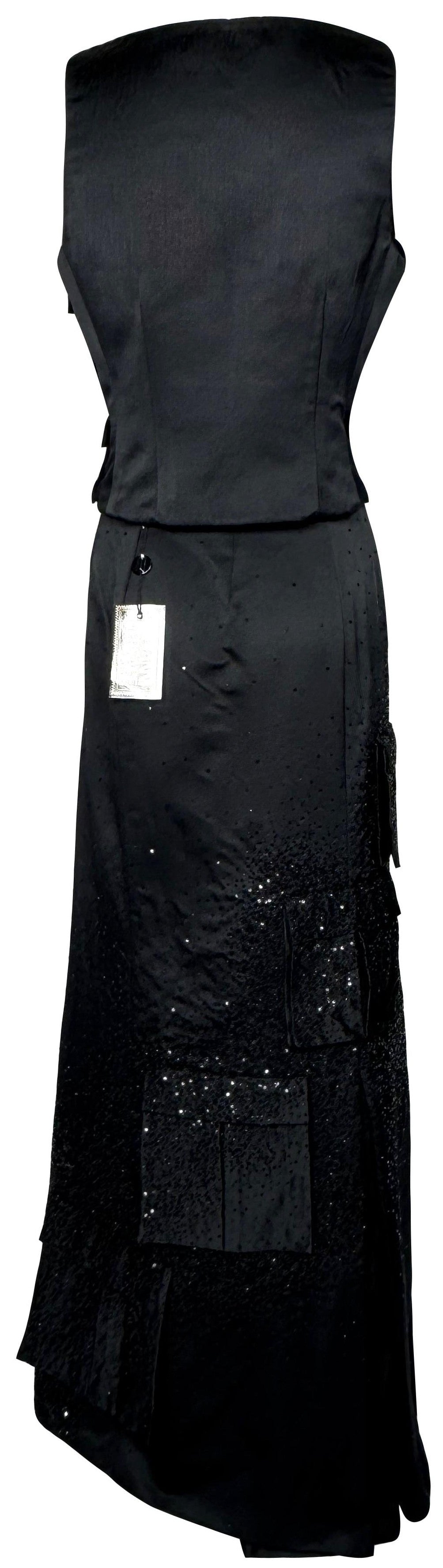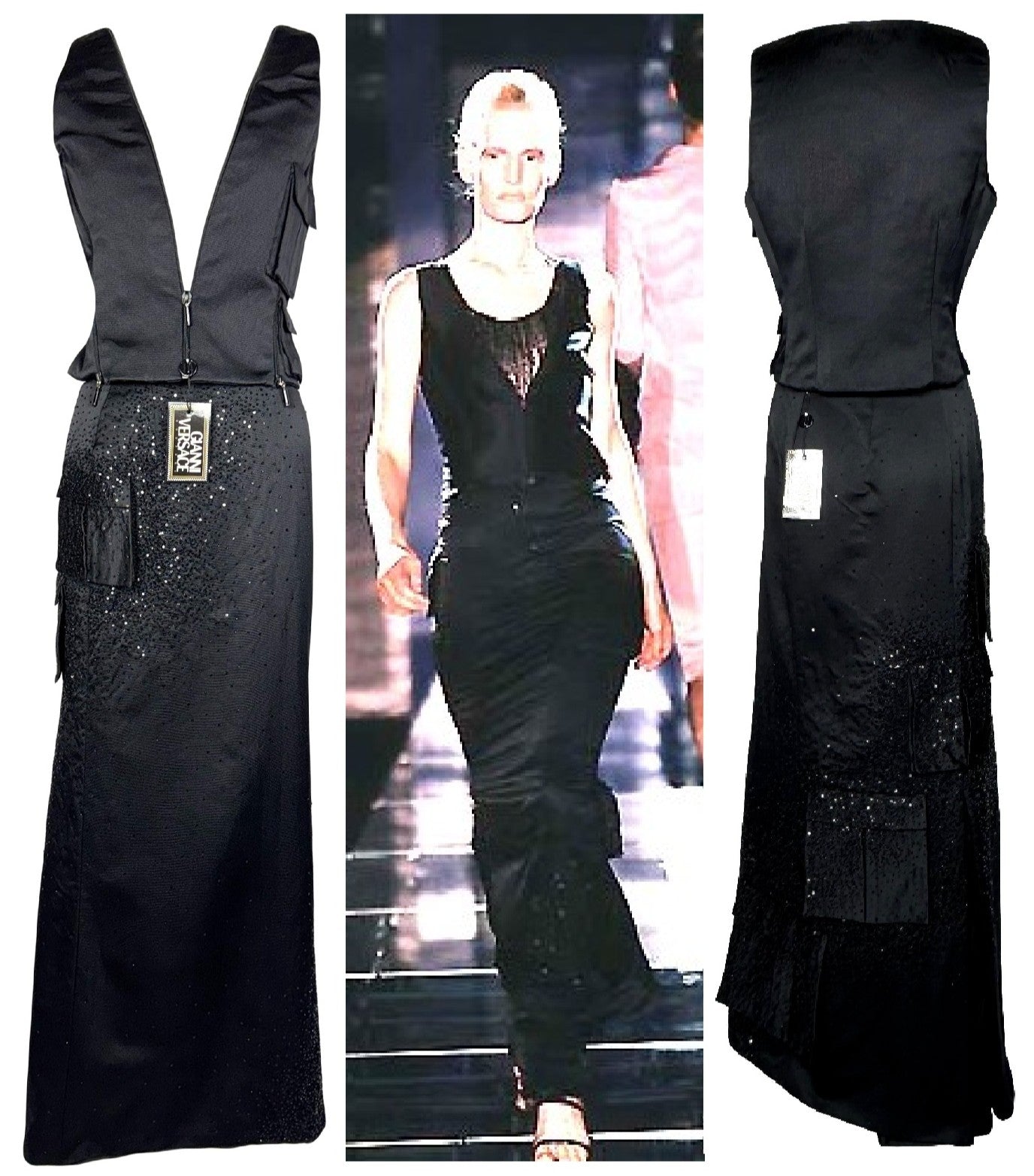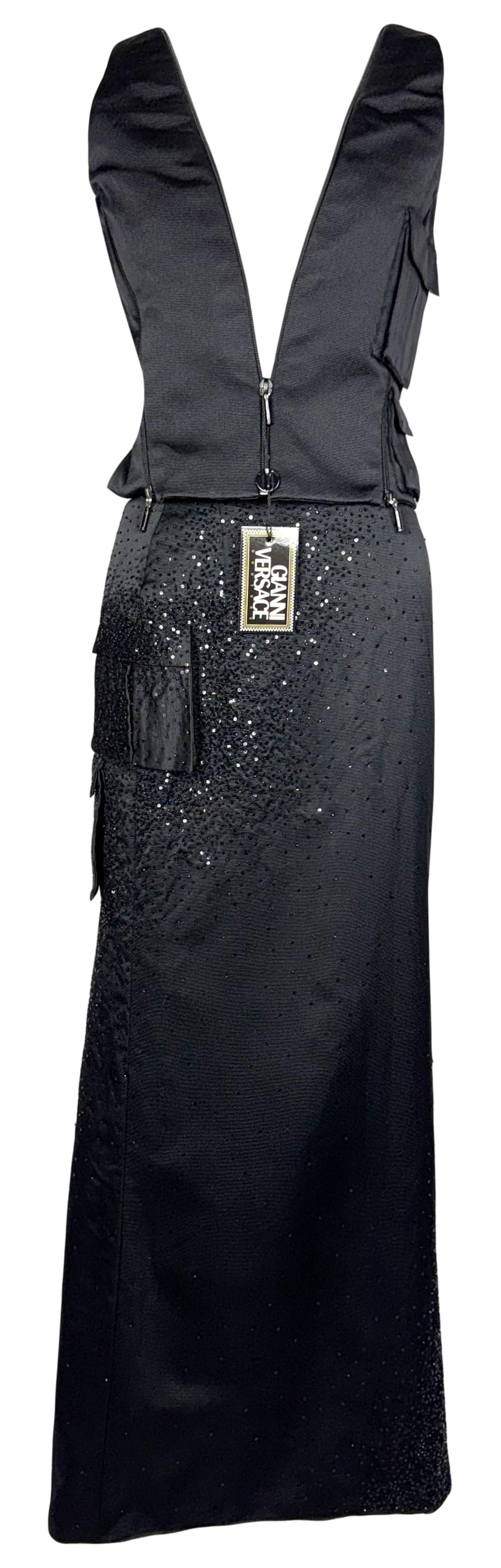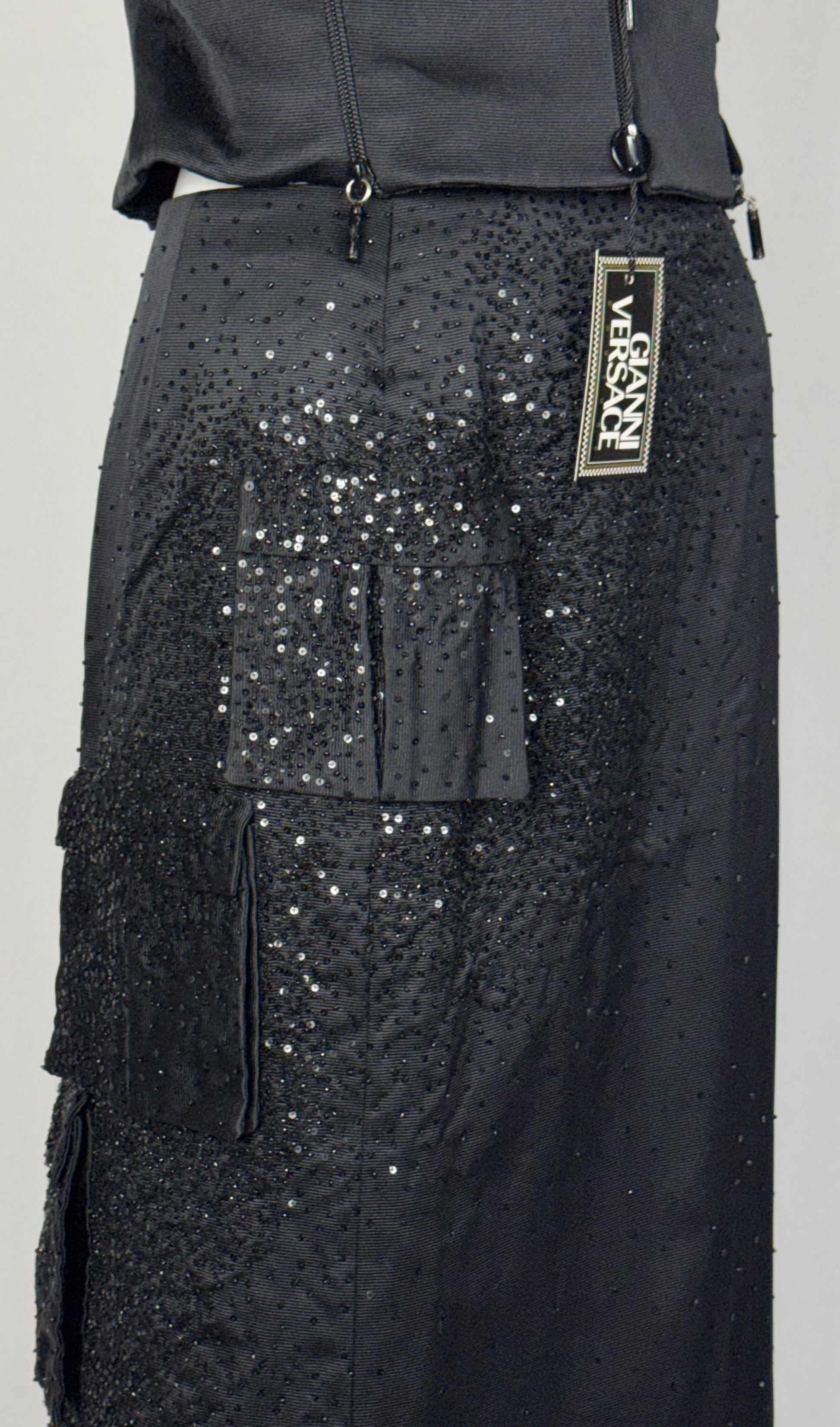 F/W 1998 Atelier Versace Couture Runway Black Beaded Silk Cargo Maxi Skirt & Plunging Zipper Top Set Dress