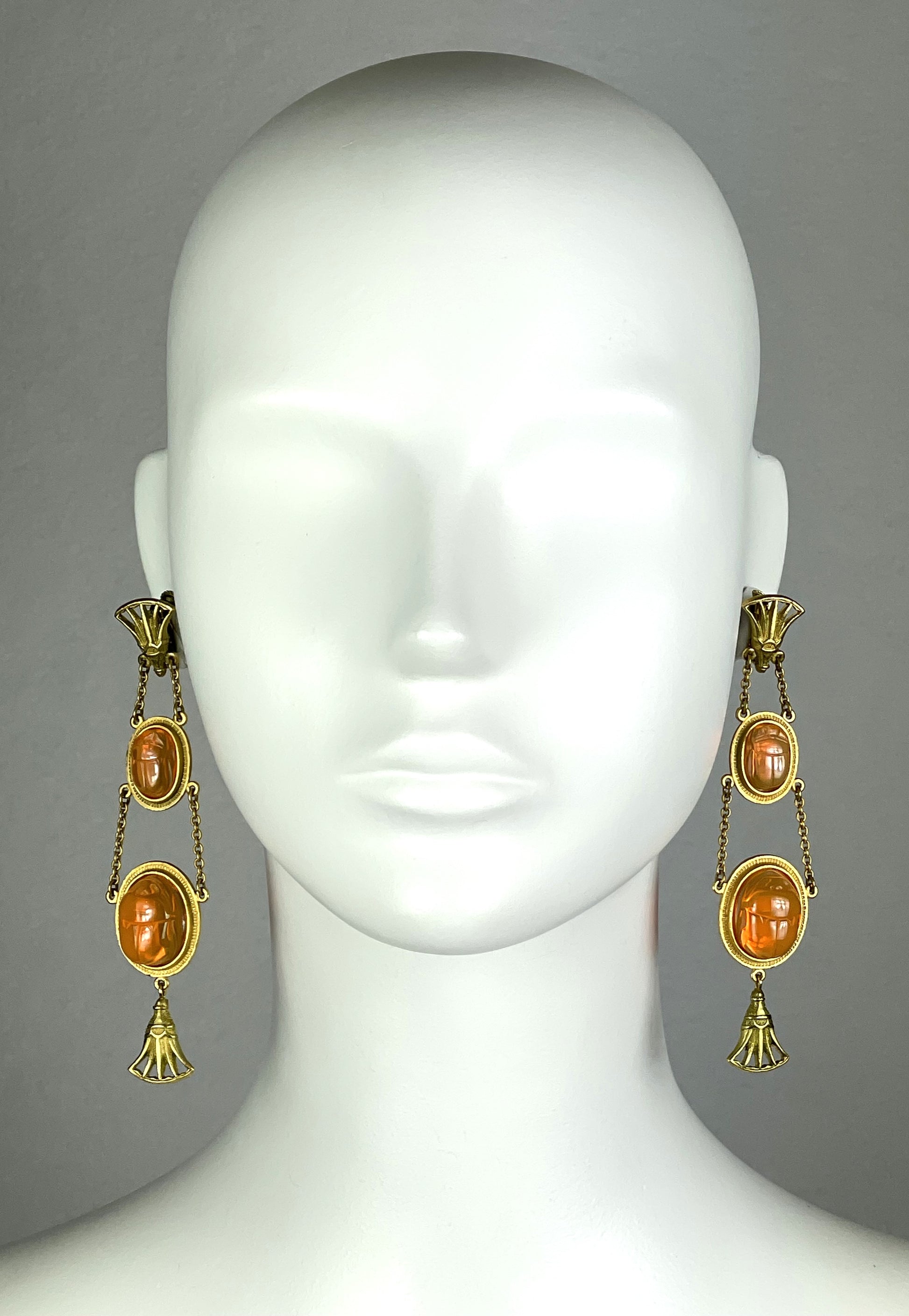 F/W 2001 Christian Dior by John Galliano Long Gold & Orange Egyptian Scarab Earrings