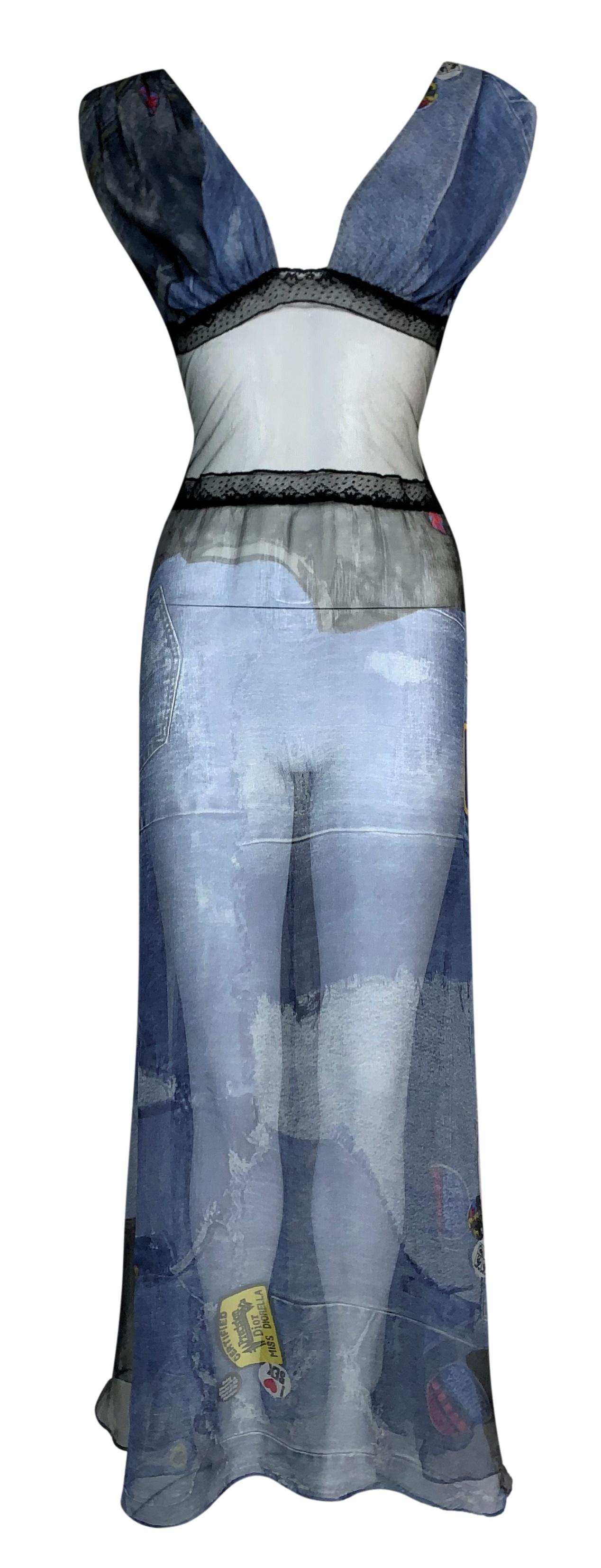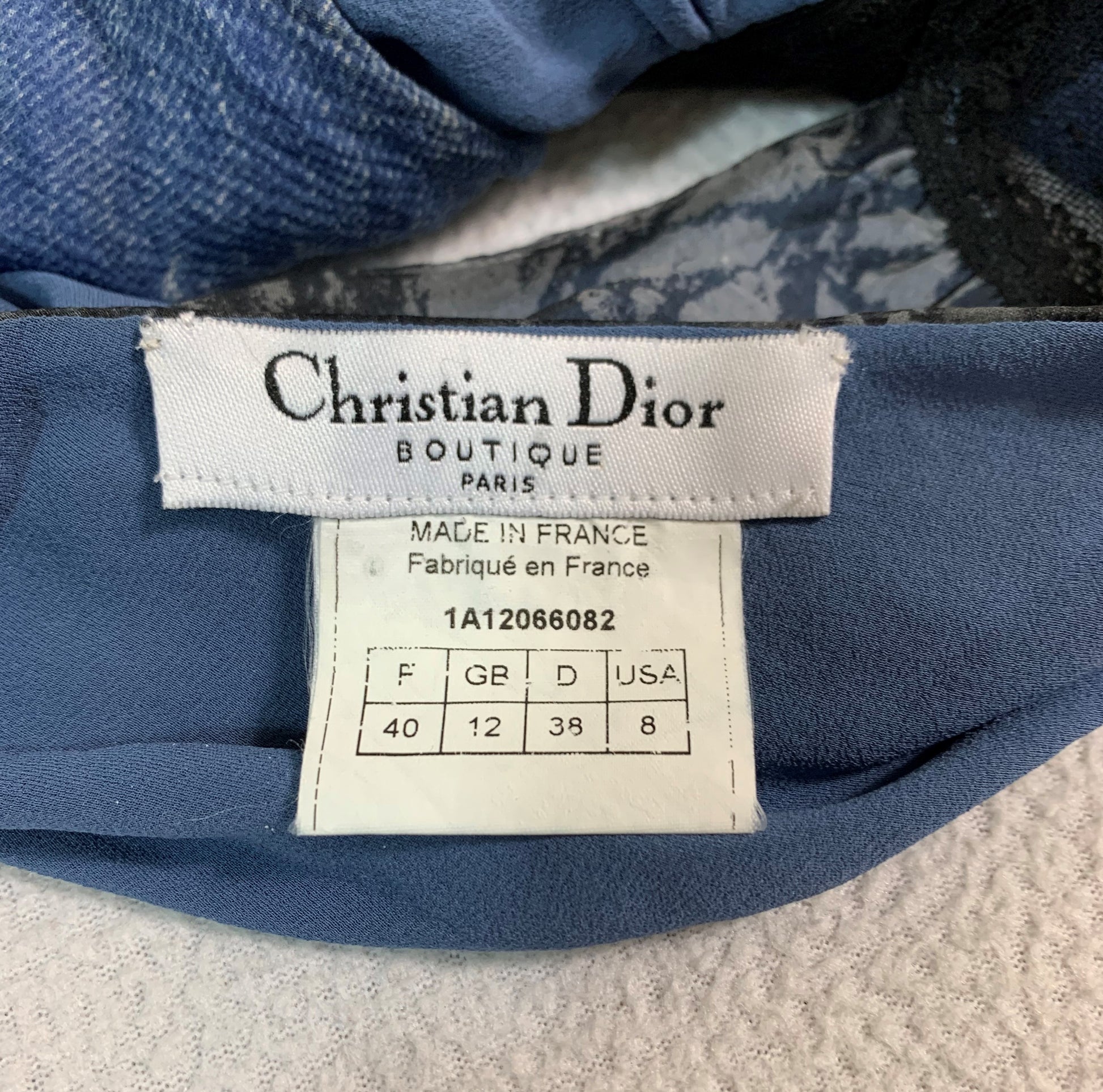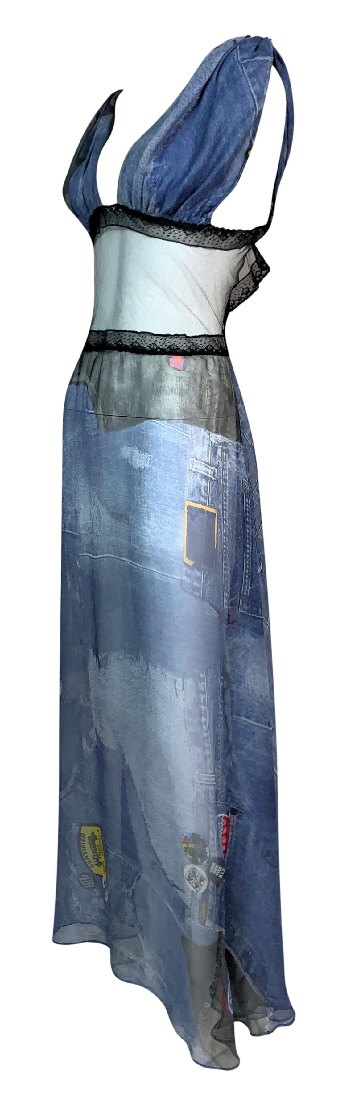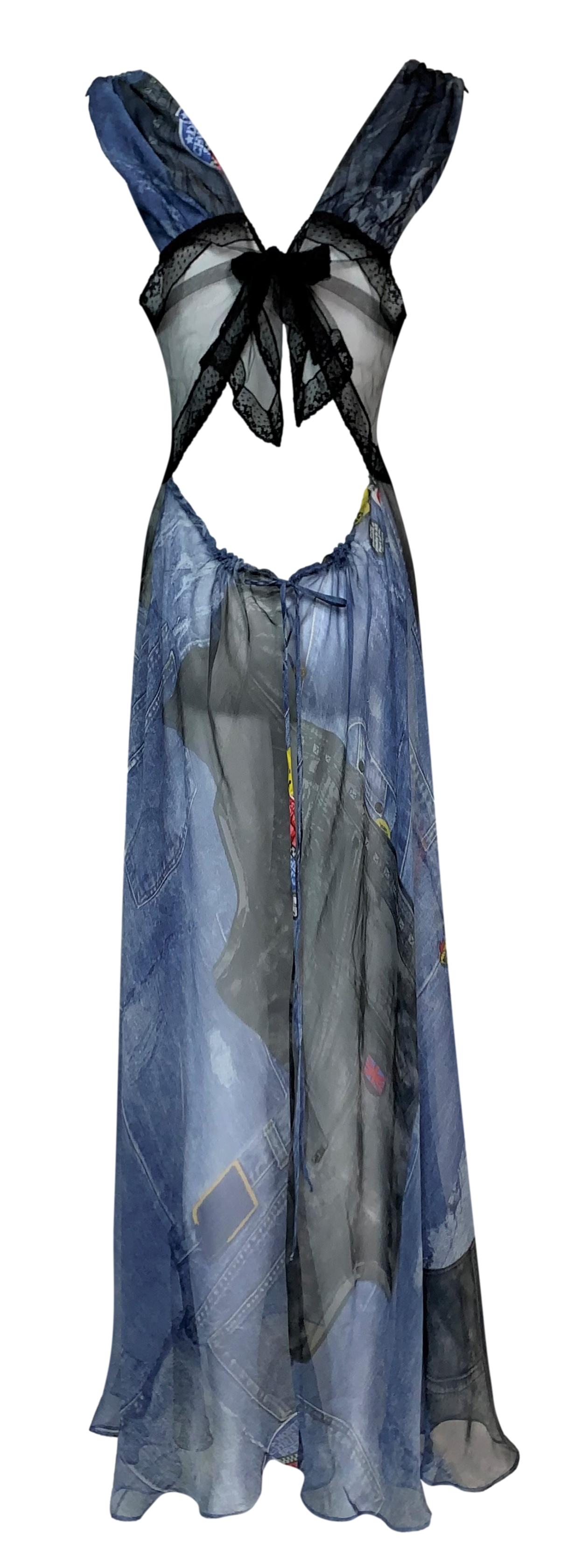 F/W 2001 Christian Dior by John Galliano Sheer Blue Silk & Black Mesh Lace Maxi Dress 40