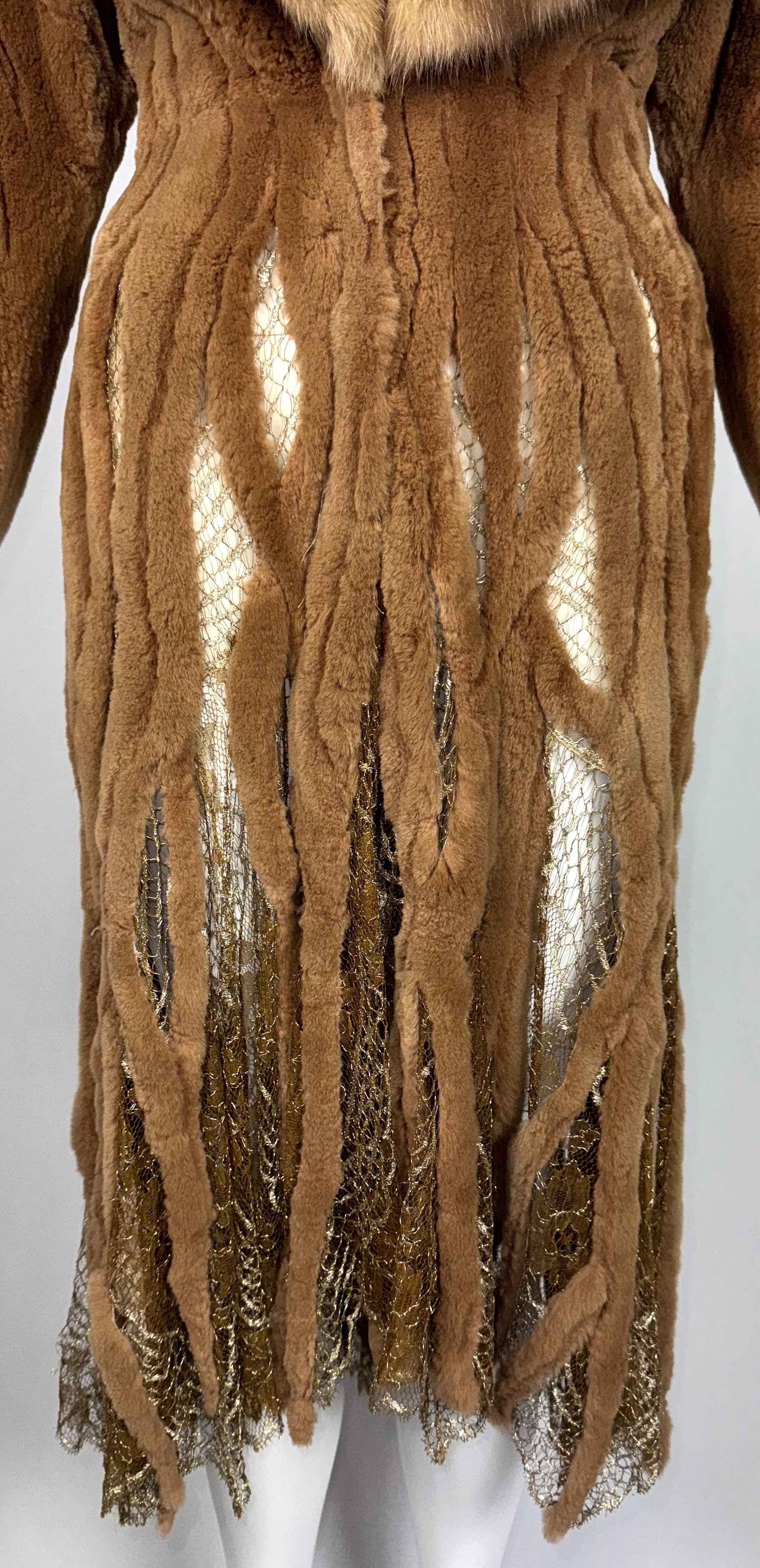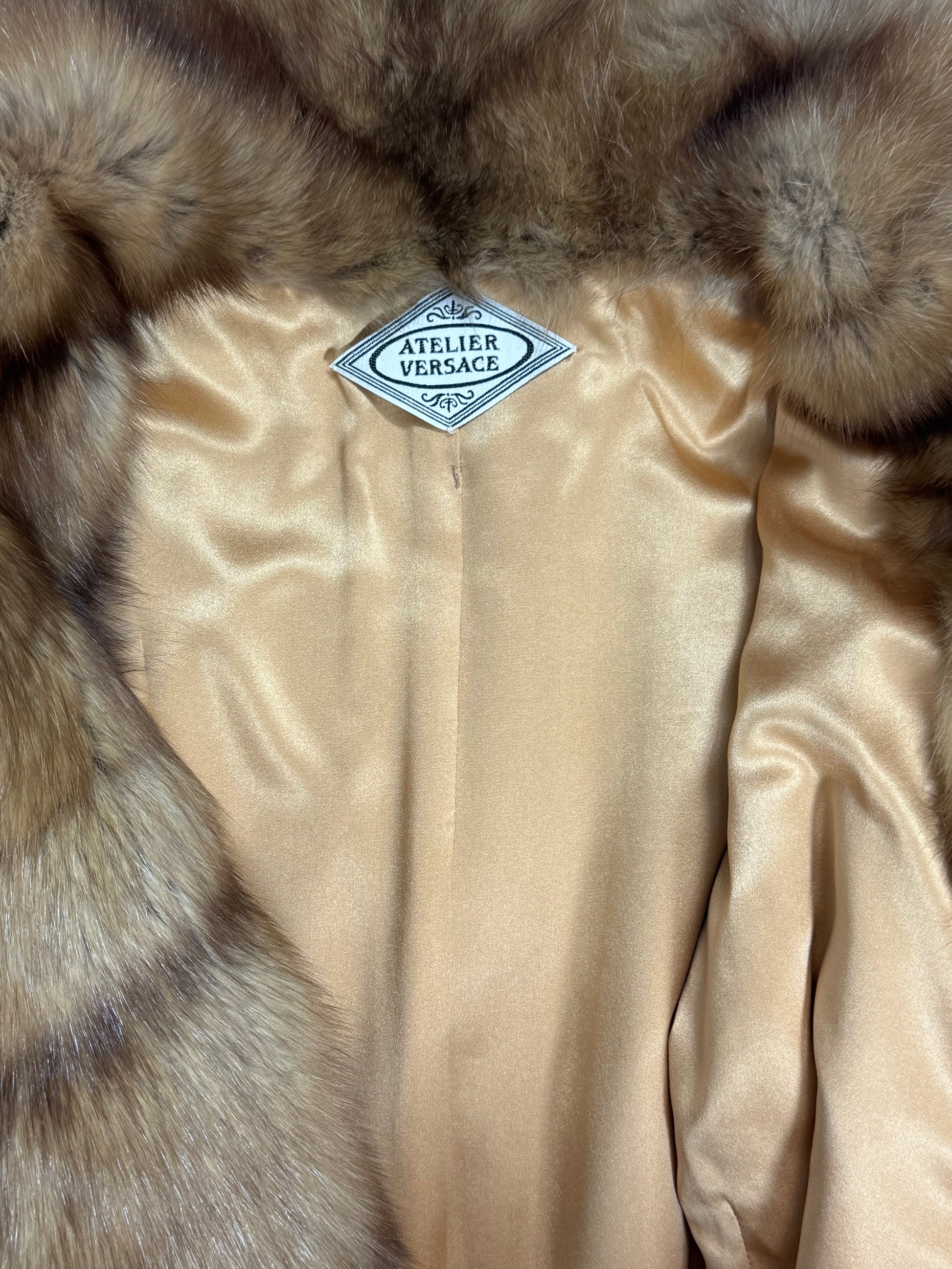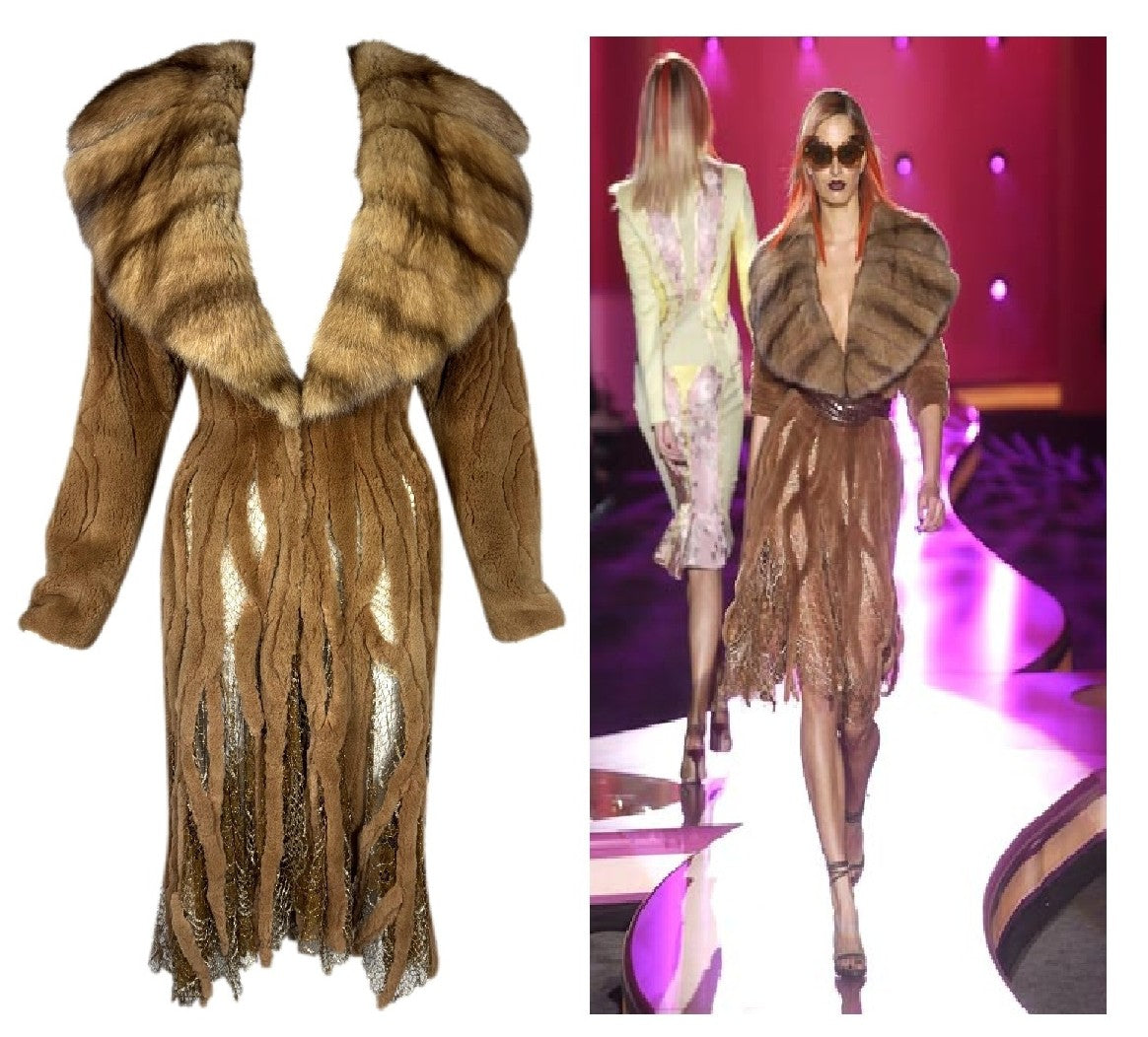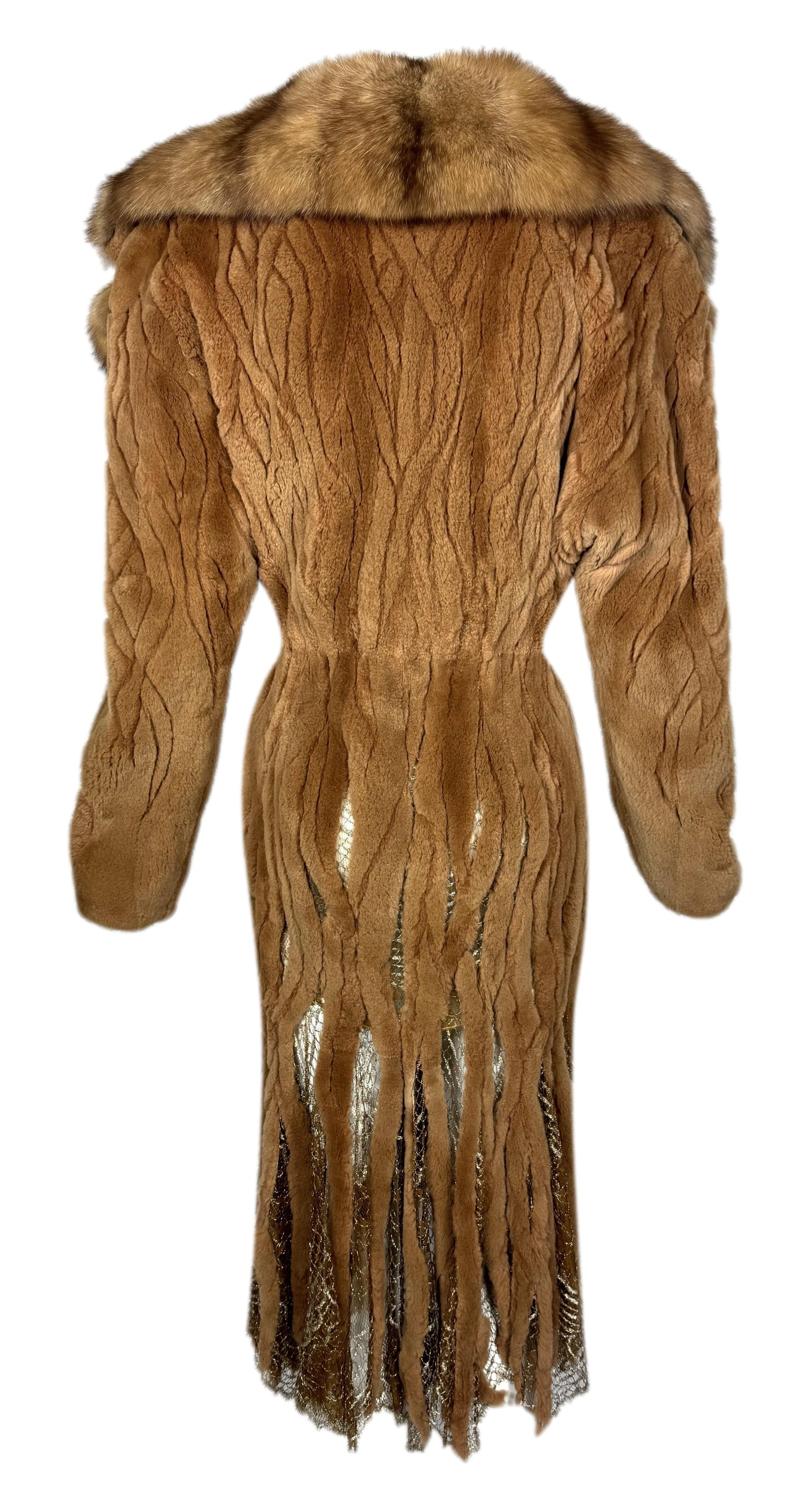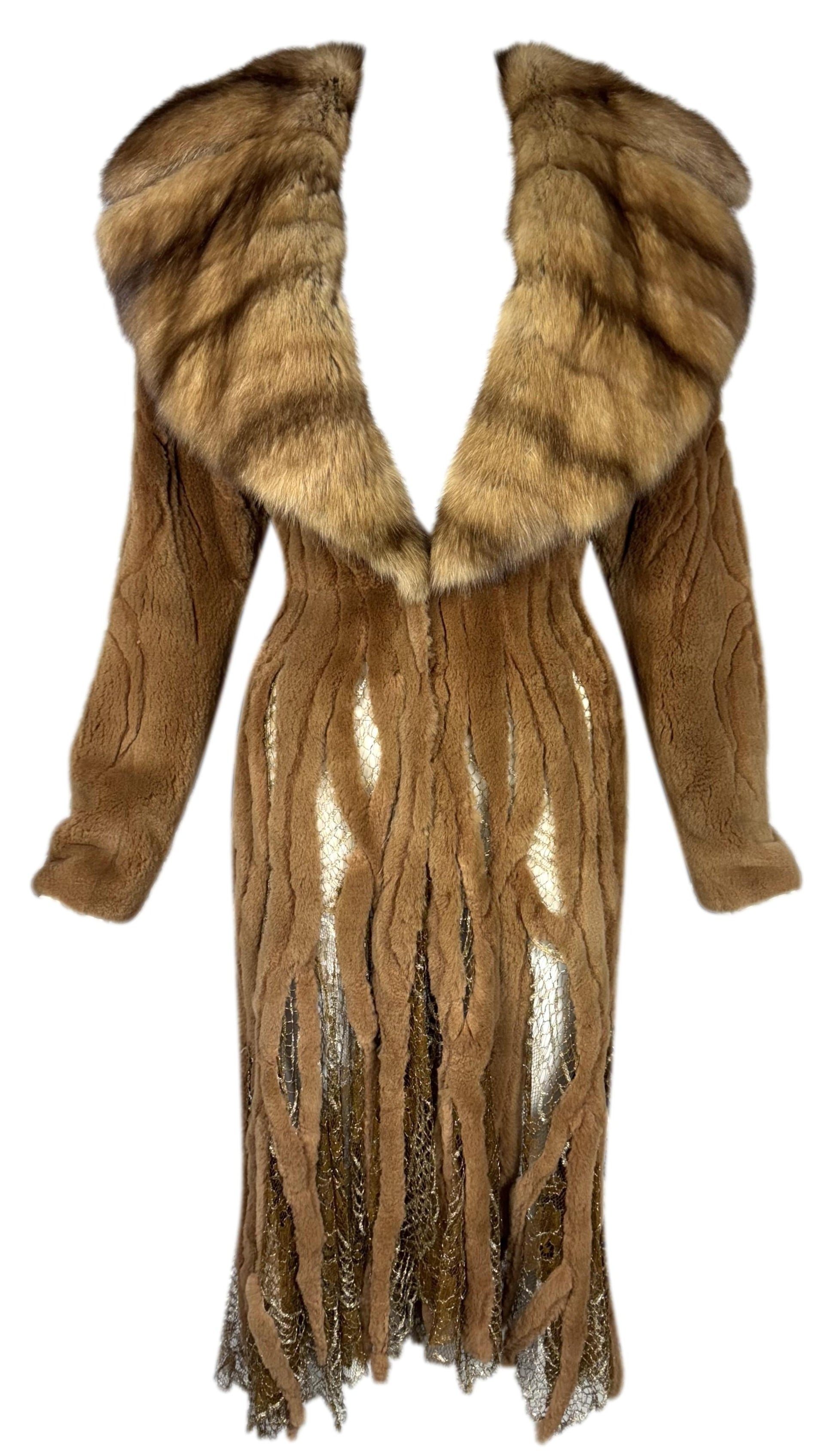 F/W 2002 Atelier Versace Runway Haute Couture Sable Fur & Sheer Lace Plunging Dress Coat