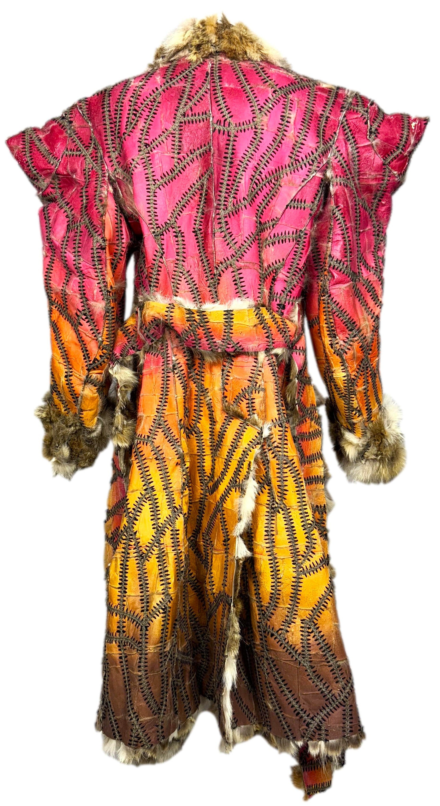 F/W 2002 Christian Dior by John Galliano Runway Hand Made Coyote Fur & Leather Red & Yellow Whipstitch Long Coat Jacket