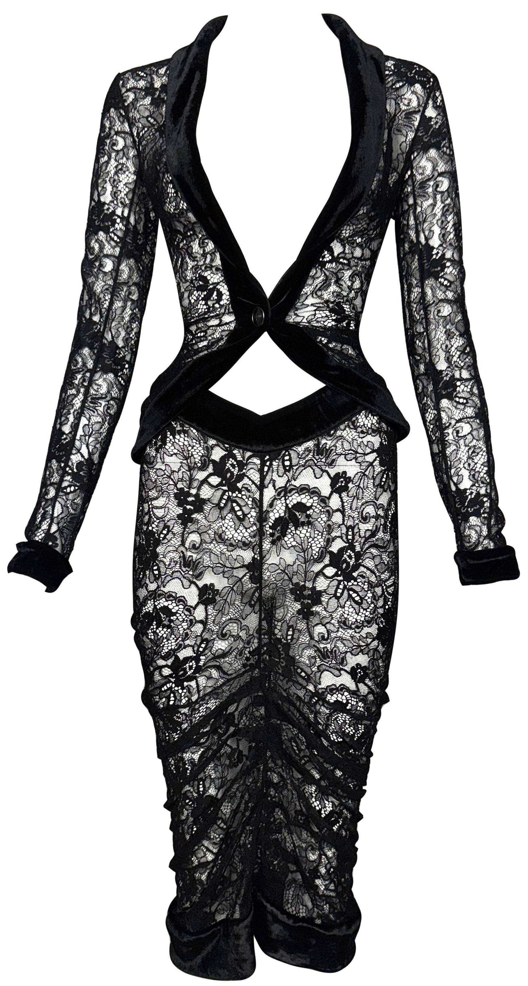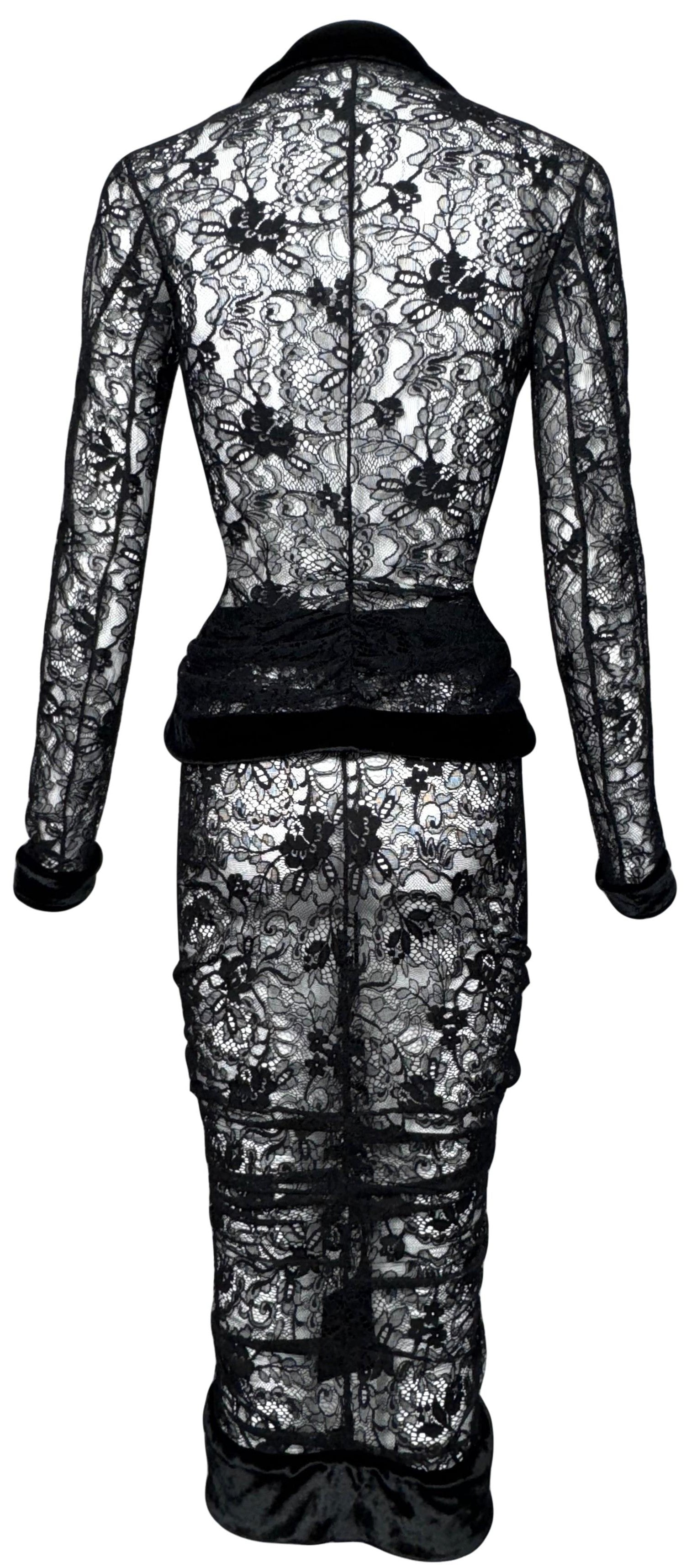 F/W 2003 Christian Dior x John Galliano Sheer Black Lace Pin-Up Plunging Wasp Waist Ruched Wiggle Skirt Set