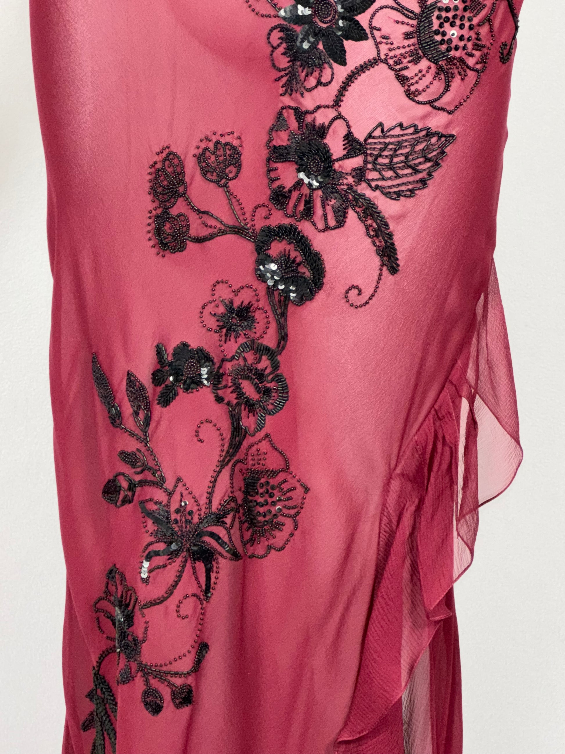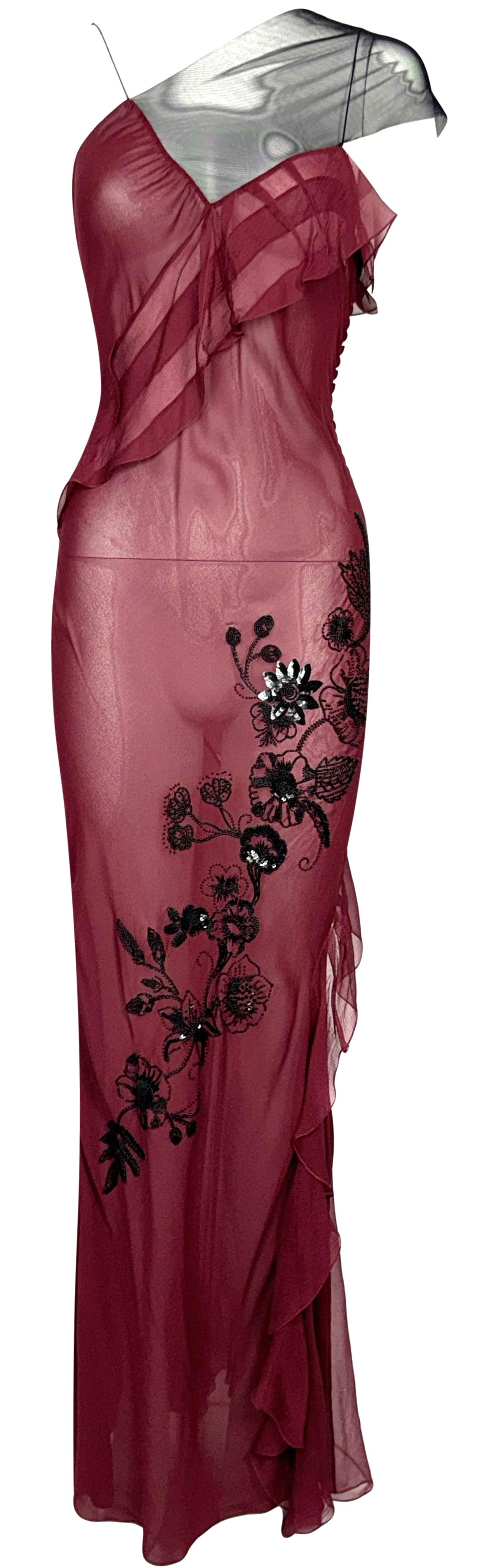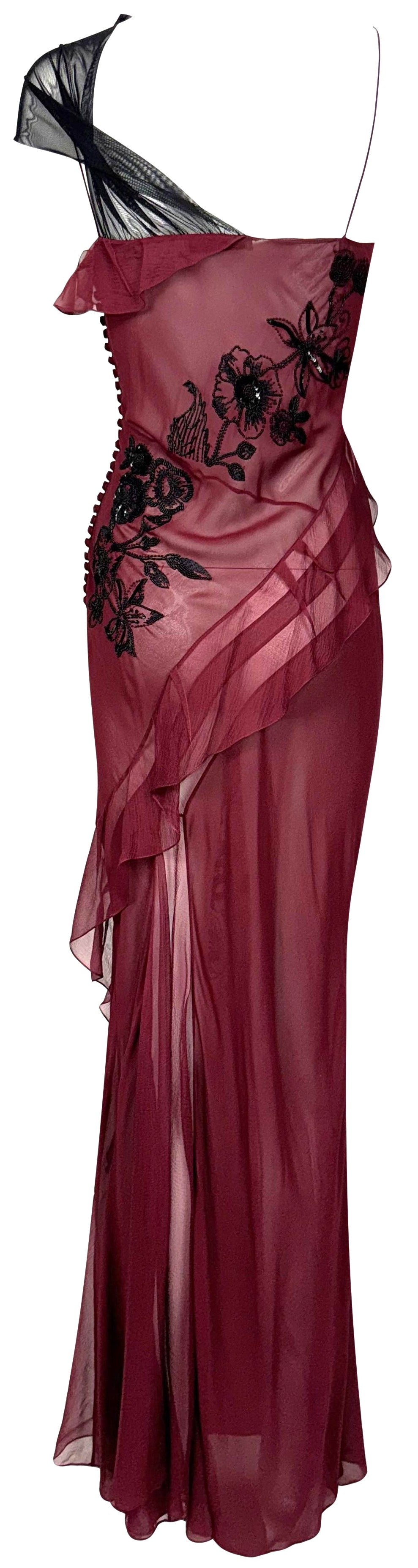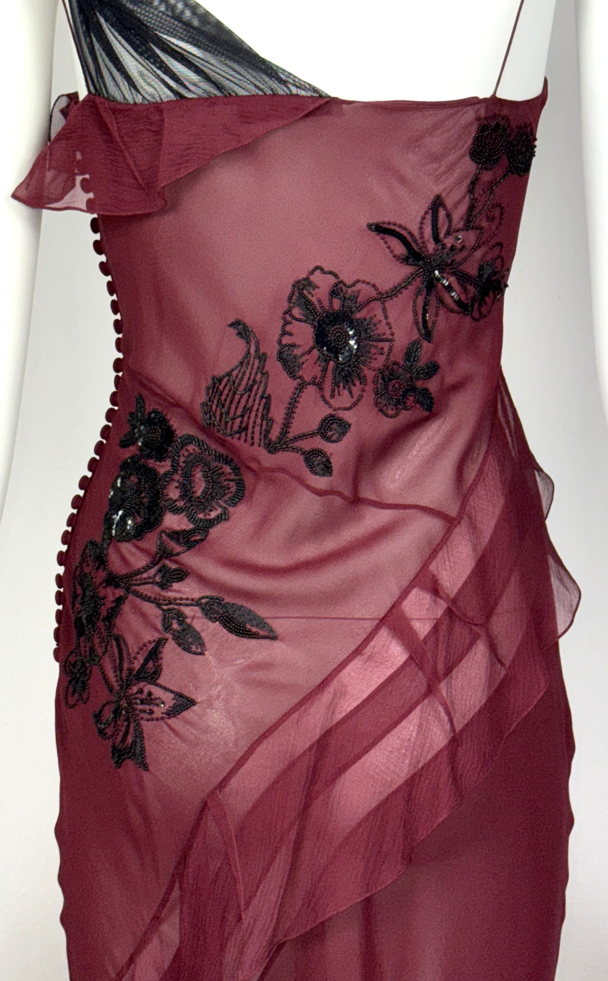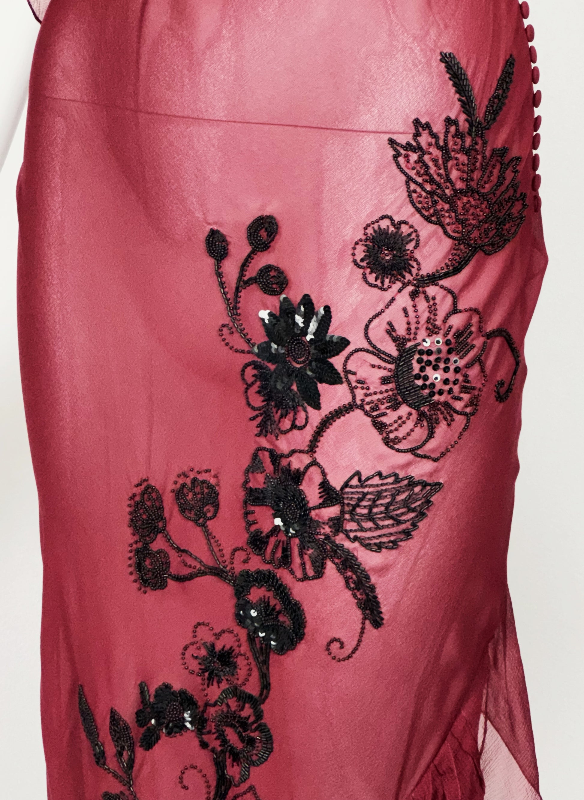 F/W 2006 Christian Dior x John Galliano Runway Sheer Red Beaded Tattoo Silk Embroidered Ruffle Gown Dress