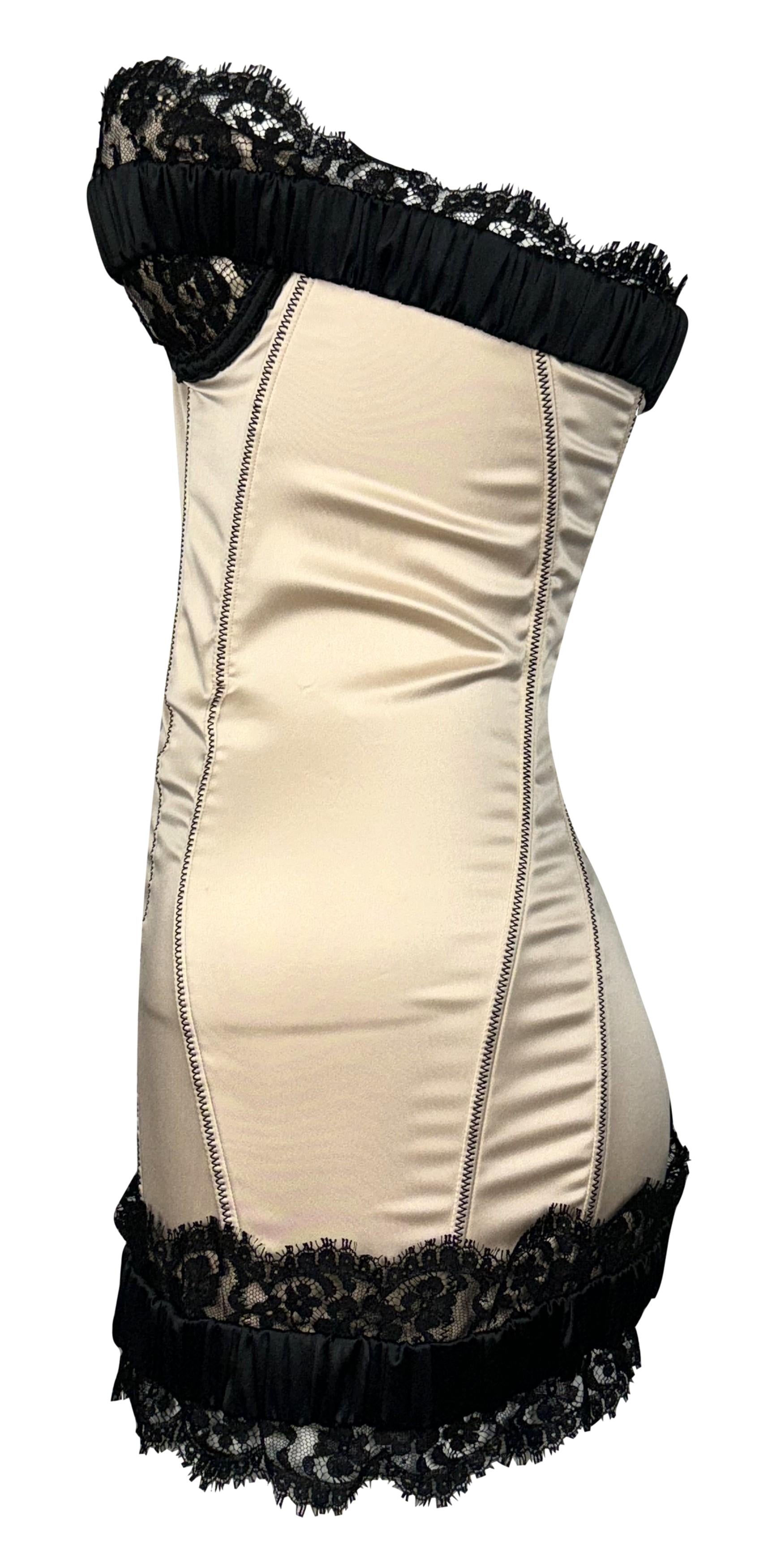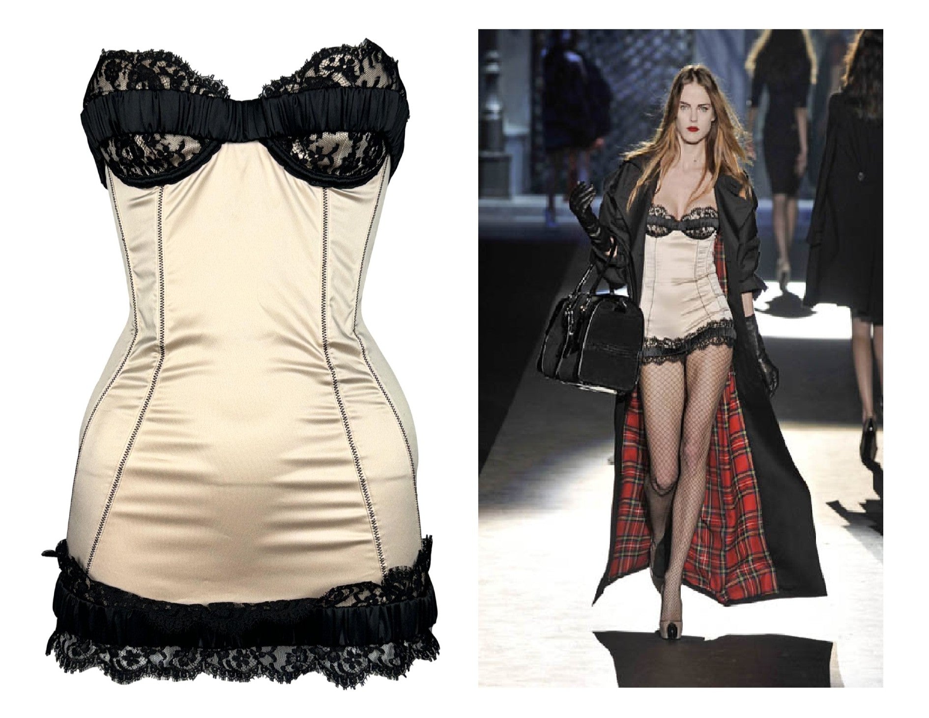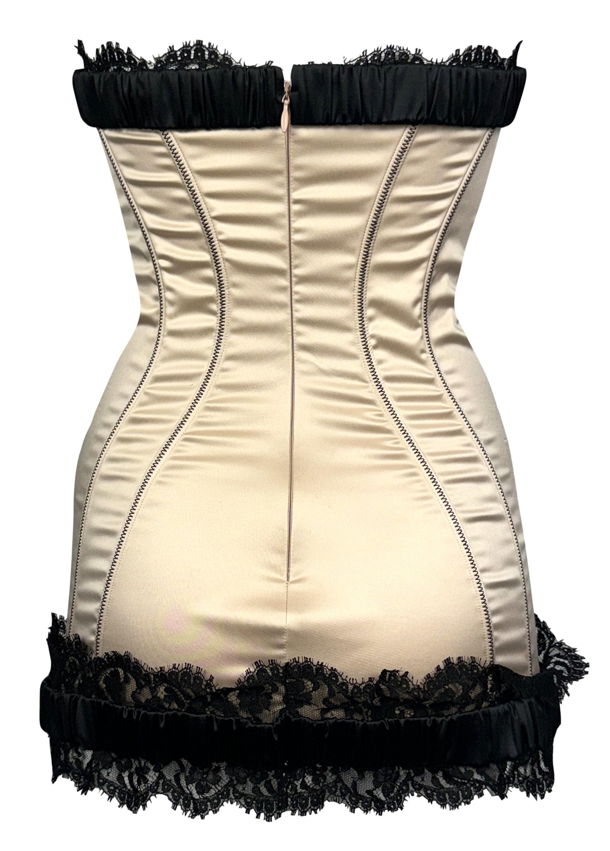 F/W 2008 Dsquared2 Runway Pin-up Stretch Champagne Satin & Black Lace Strapless Mini Dress