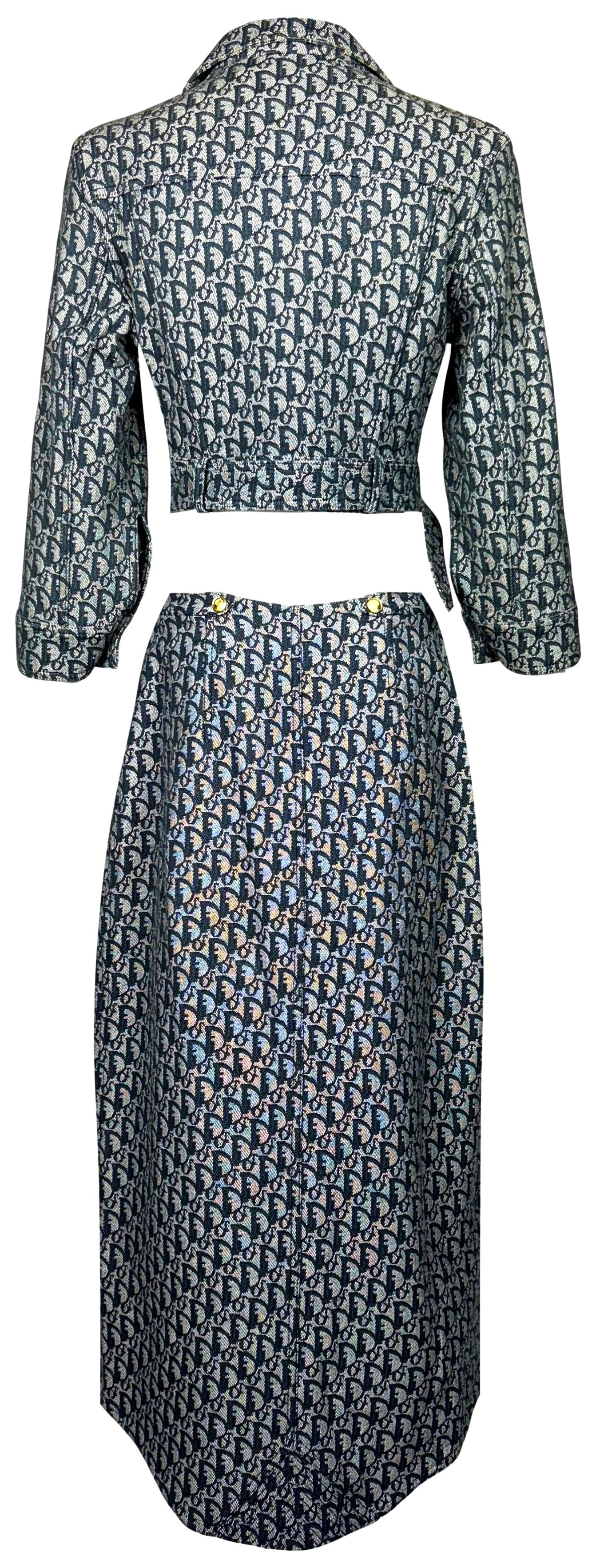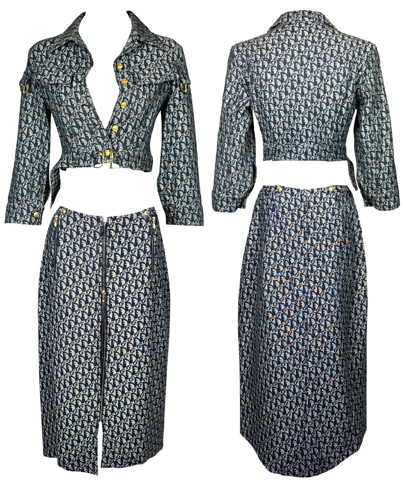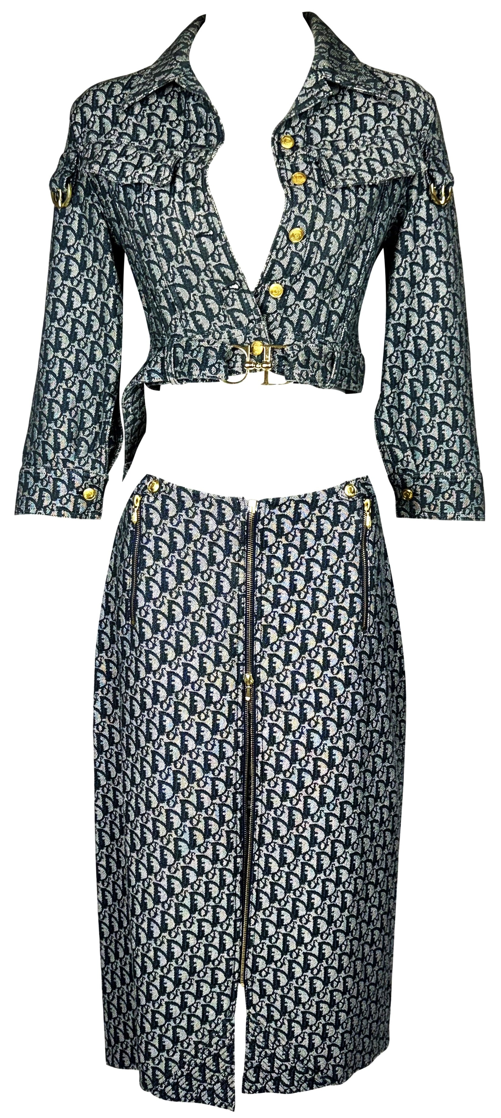 S/S 2000 Christian Dior by John Galliano Logo Monogram Trotter Denim Cropped Buckle Jacket & Zipper Maxi Skirt