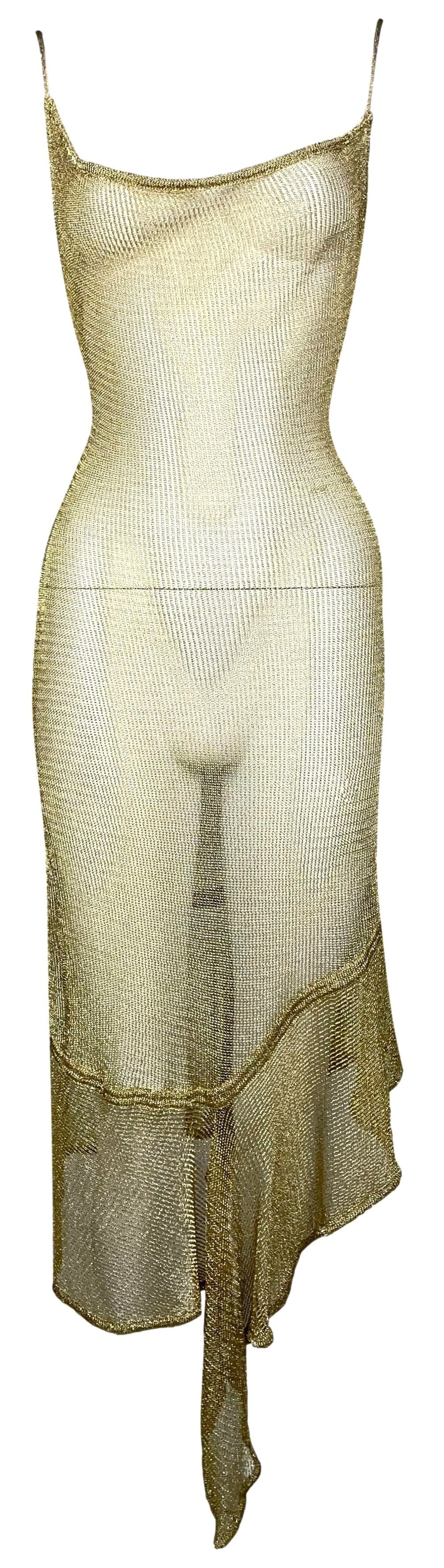 S/S 2001 John Galliano Sheer Gold Knit Faux Chainmail Asymmetrical Bodycon Dress