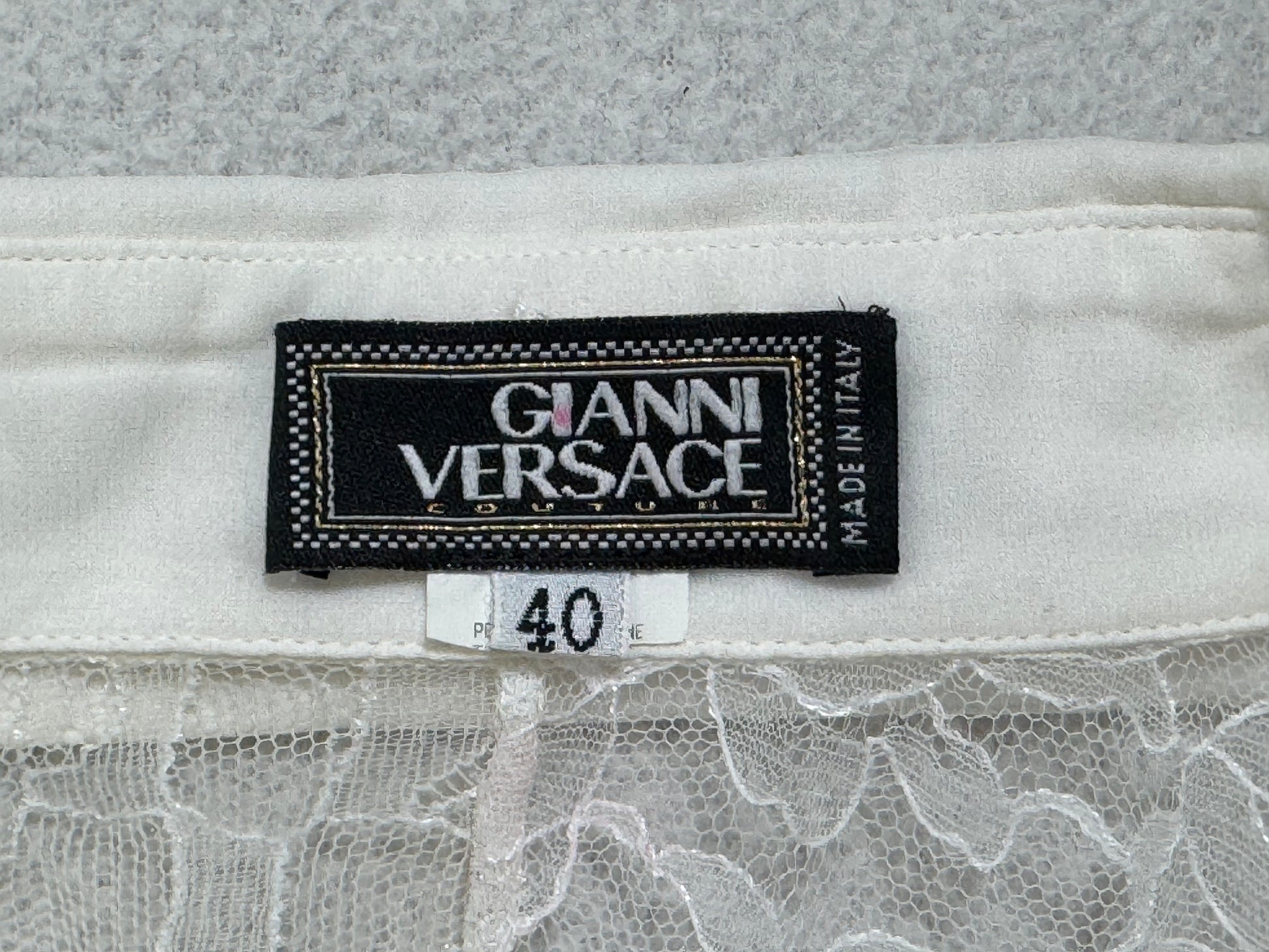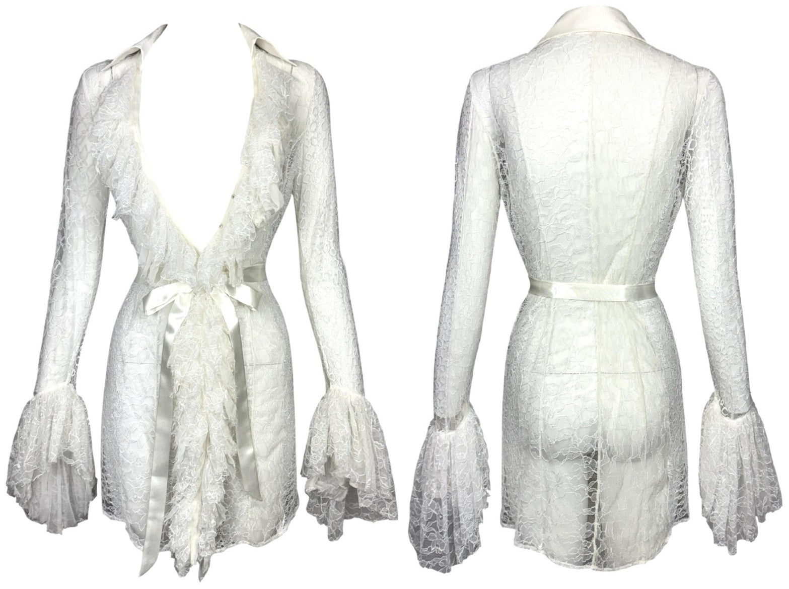 S/S 2002 Gianni Versace Plunging Sheer Ivory Lace Bell Sleeve Mini Dress Tunic