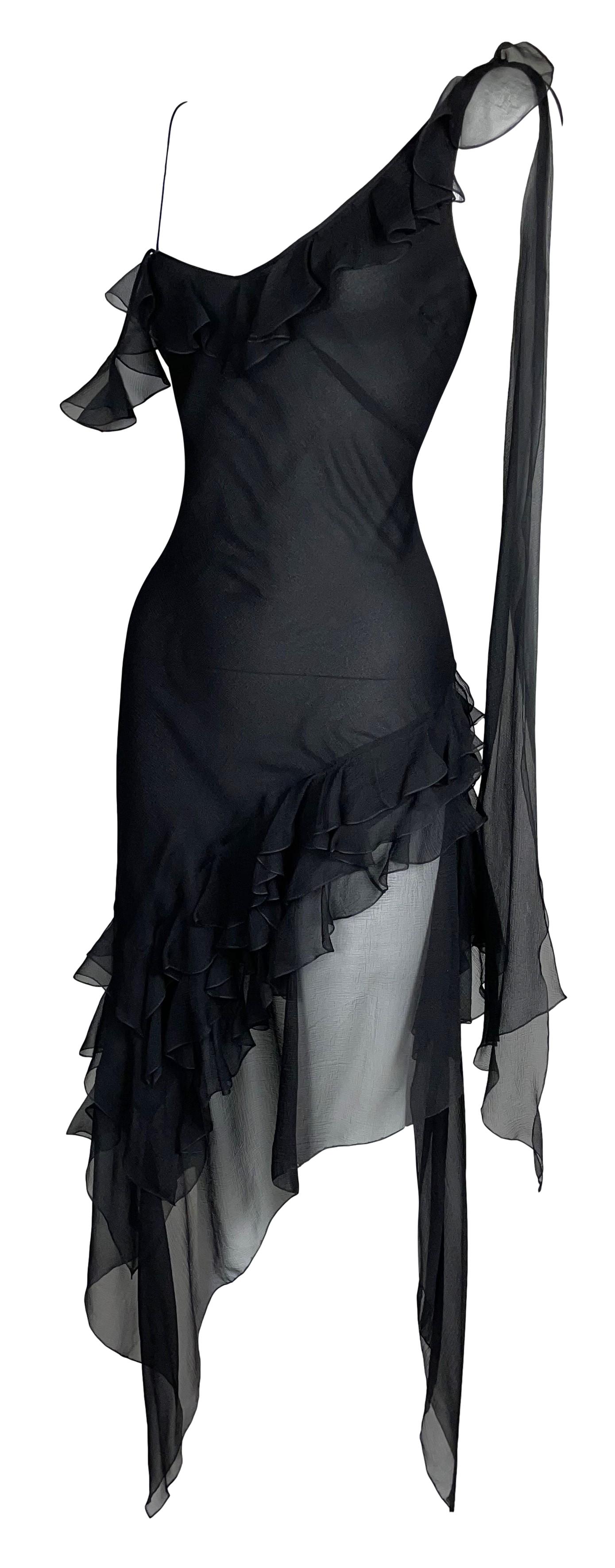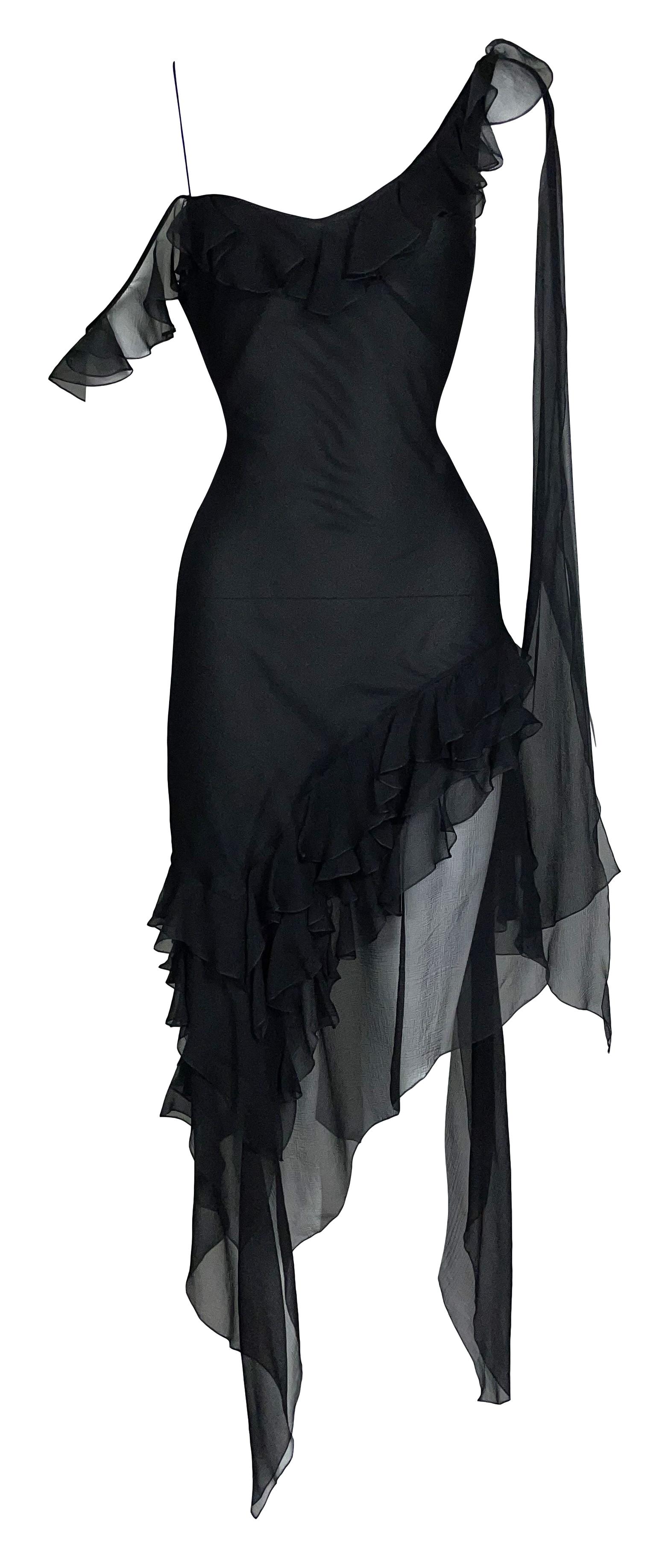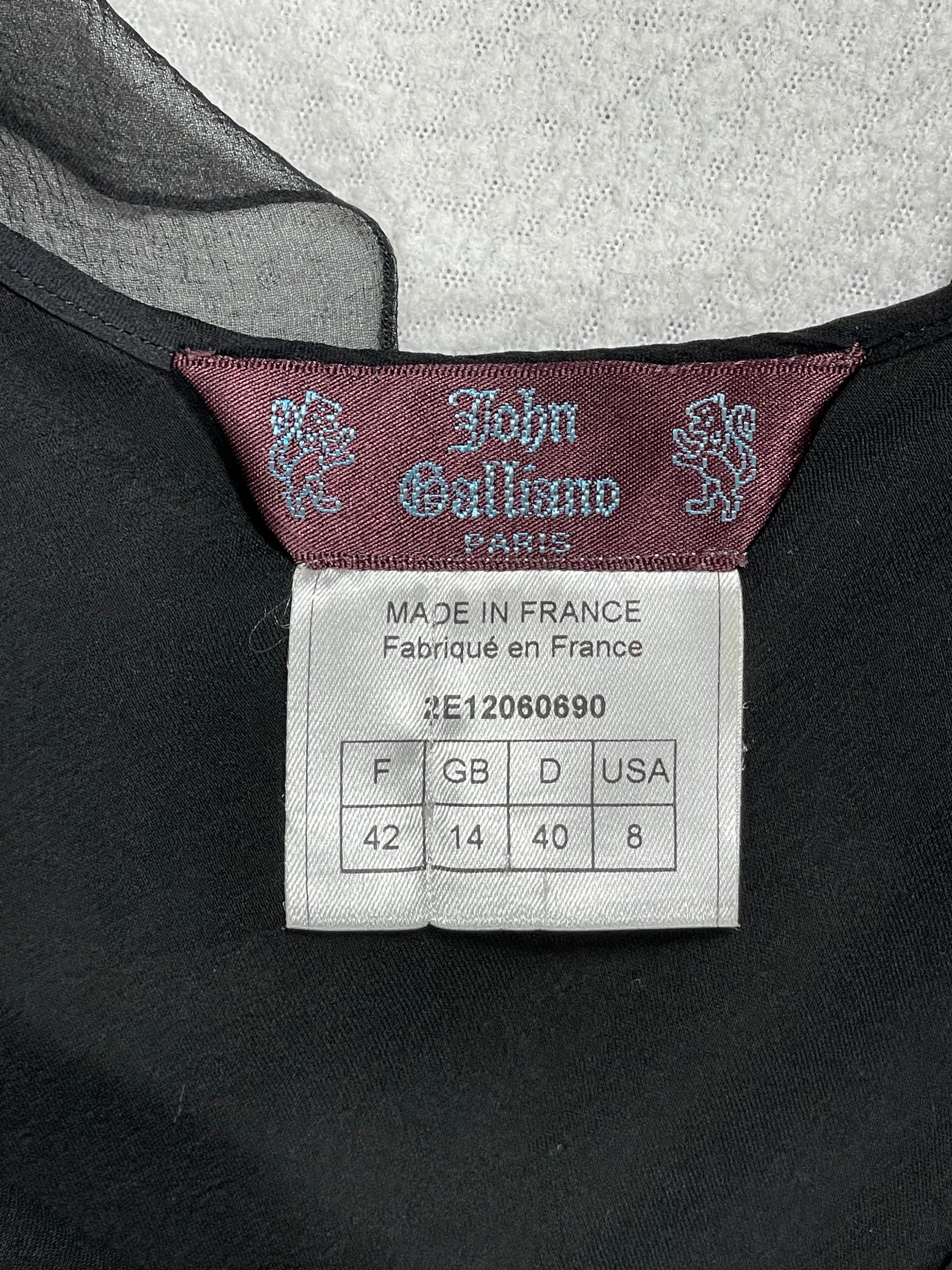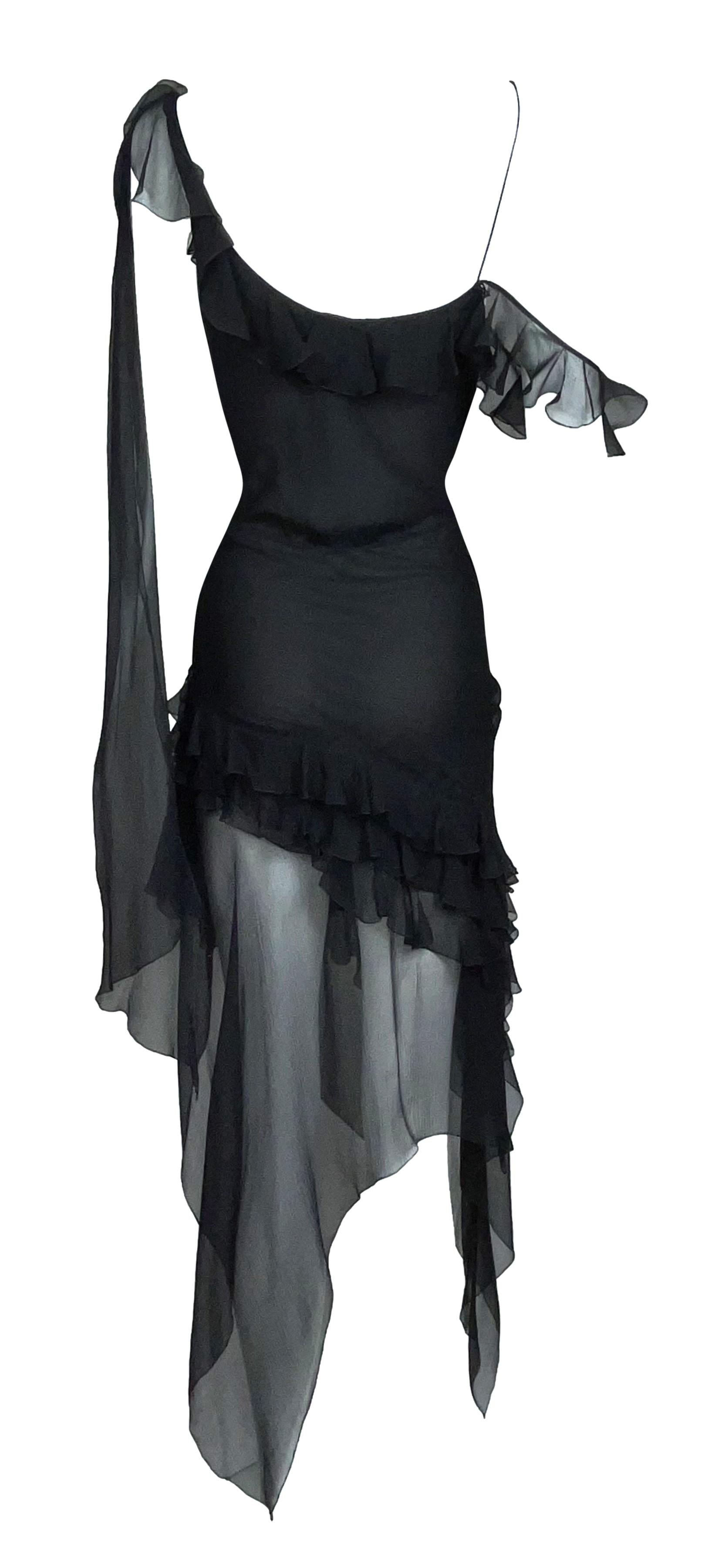 S/S 2002 John Galliano Sheer Black Silk Off Shoulder Asymmetrical Dress w Sash