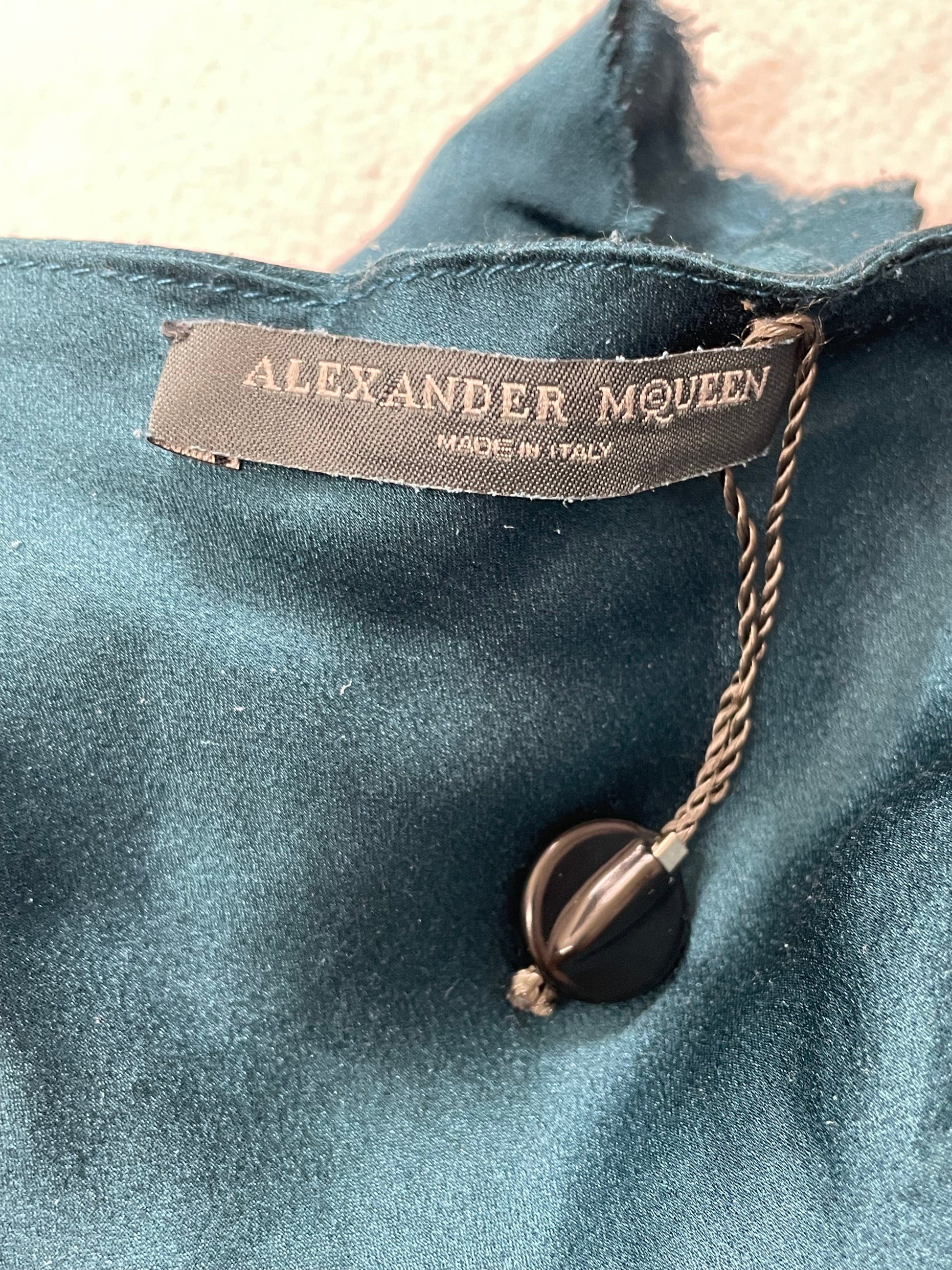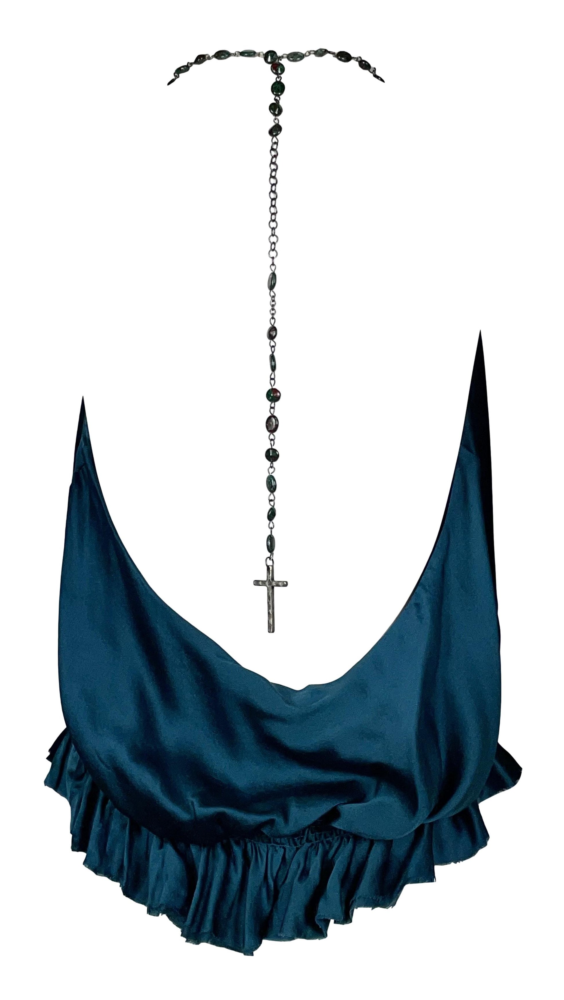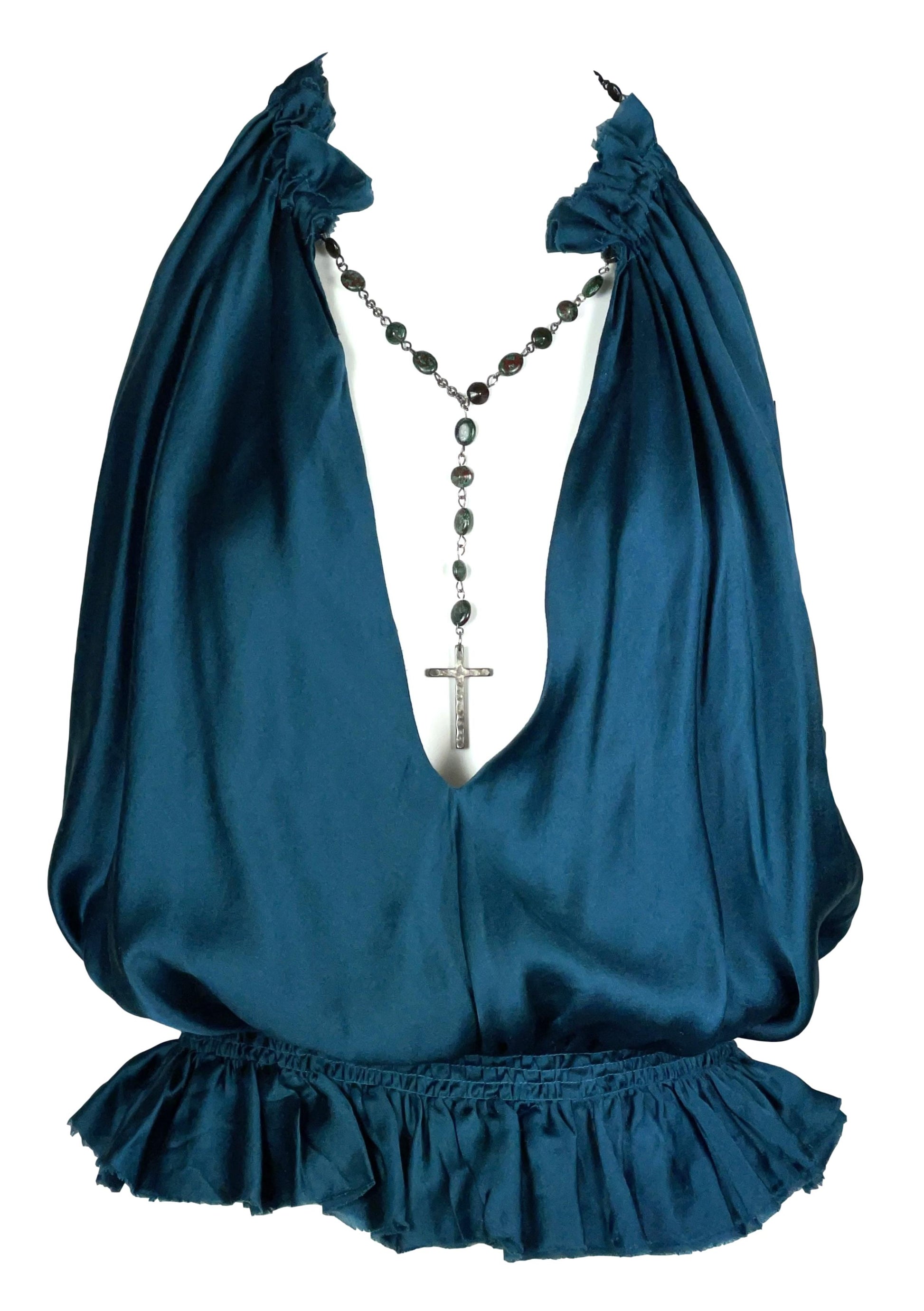 S/S 2003 Alexander McQueen Teal Silk Tattered Pirate Rosary Cross Necklace Plunging Top