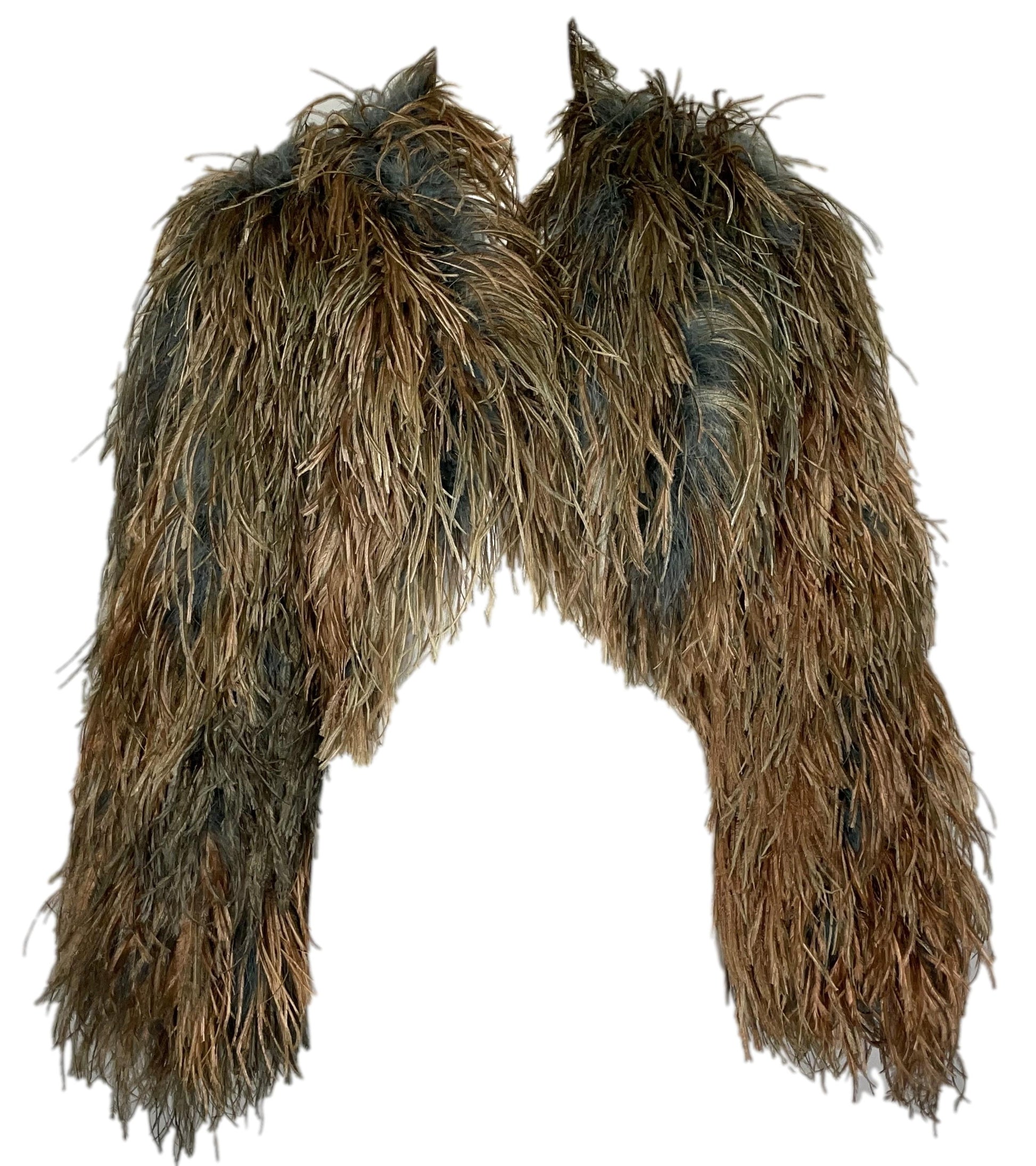Chest: 40", Length: 13" not including feathers, Shoulder to shoulder: 16.5", Arms from shoulder to end: 25"