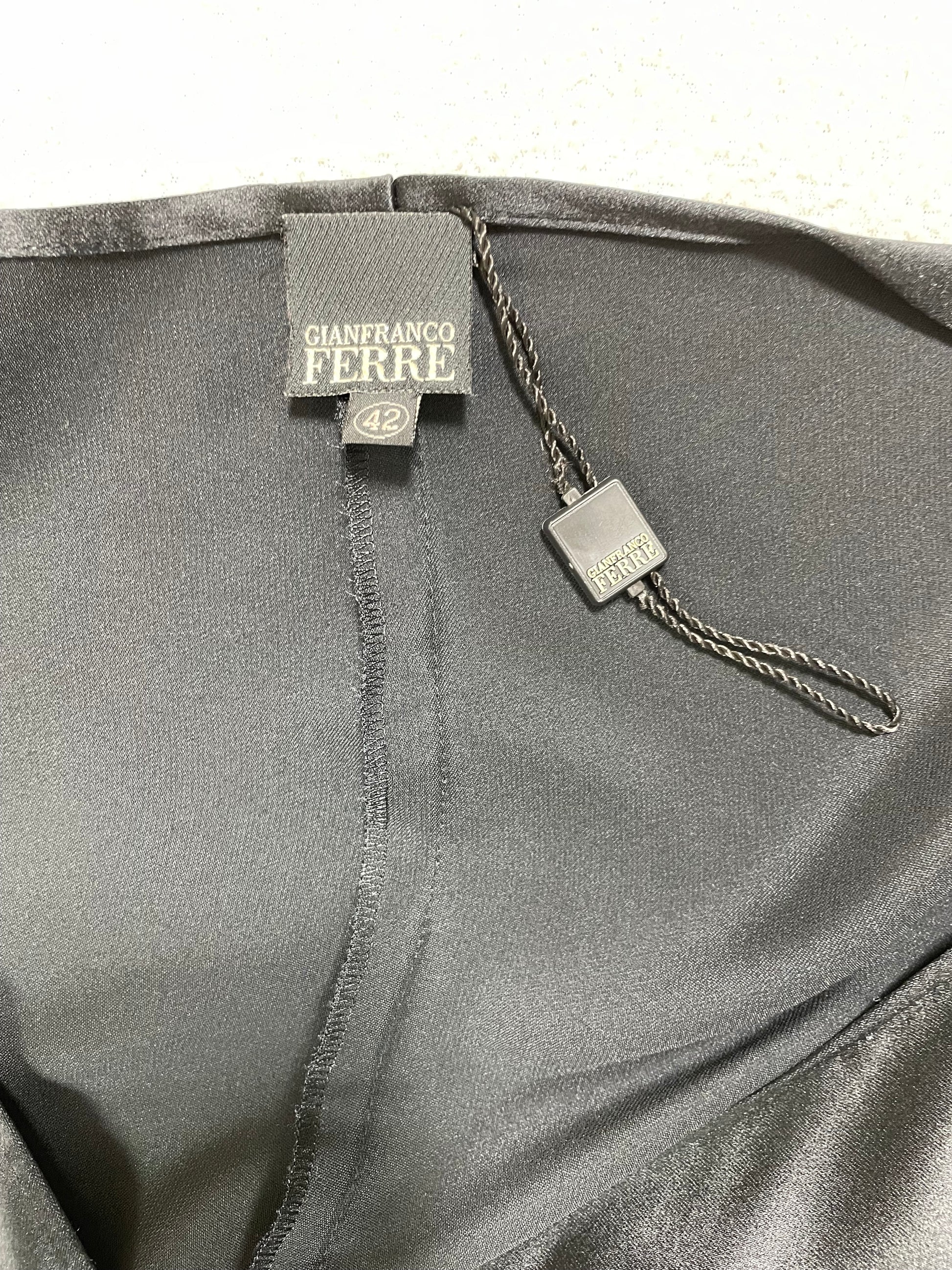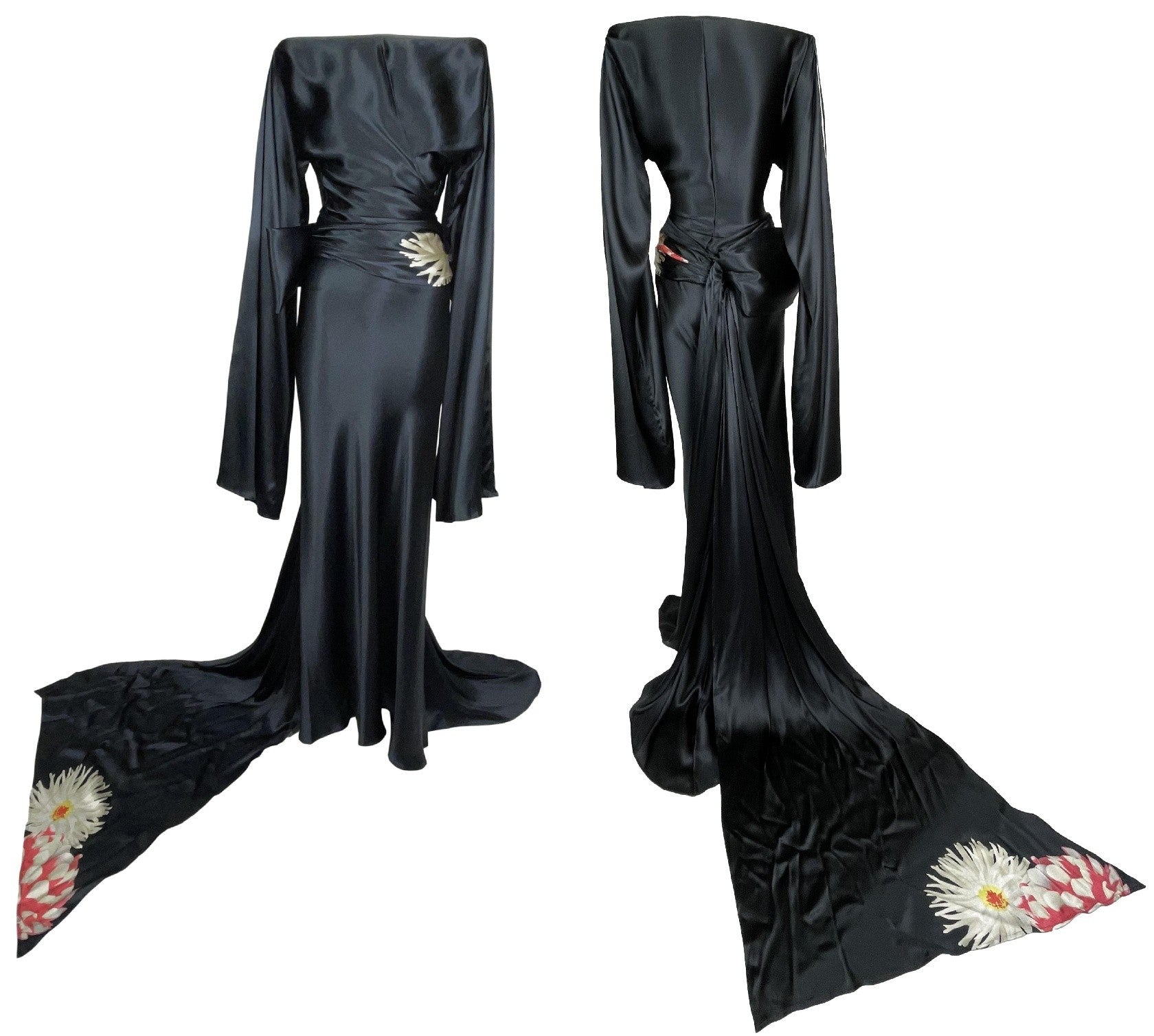 S/S 2003 Gianfranco Ferre Runway Japanese Kimono Sleeve & Bow Black Satin Top & Skirt Gown w Train