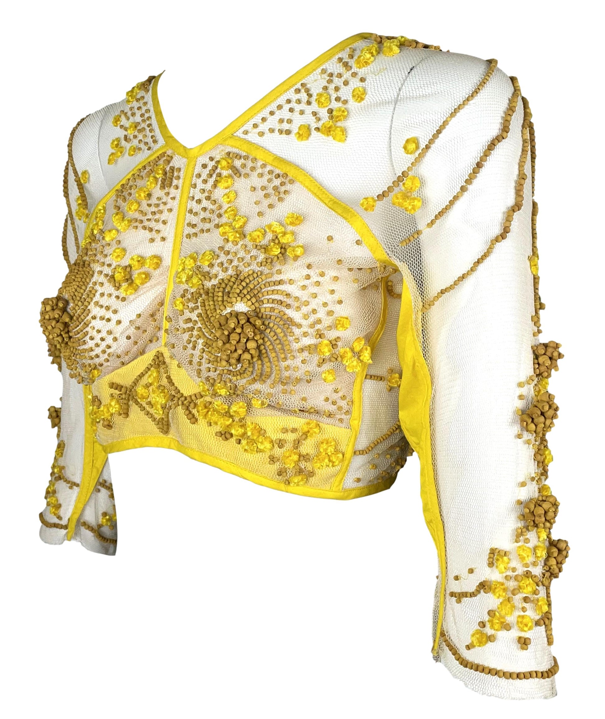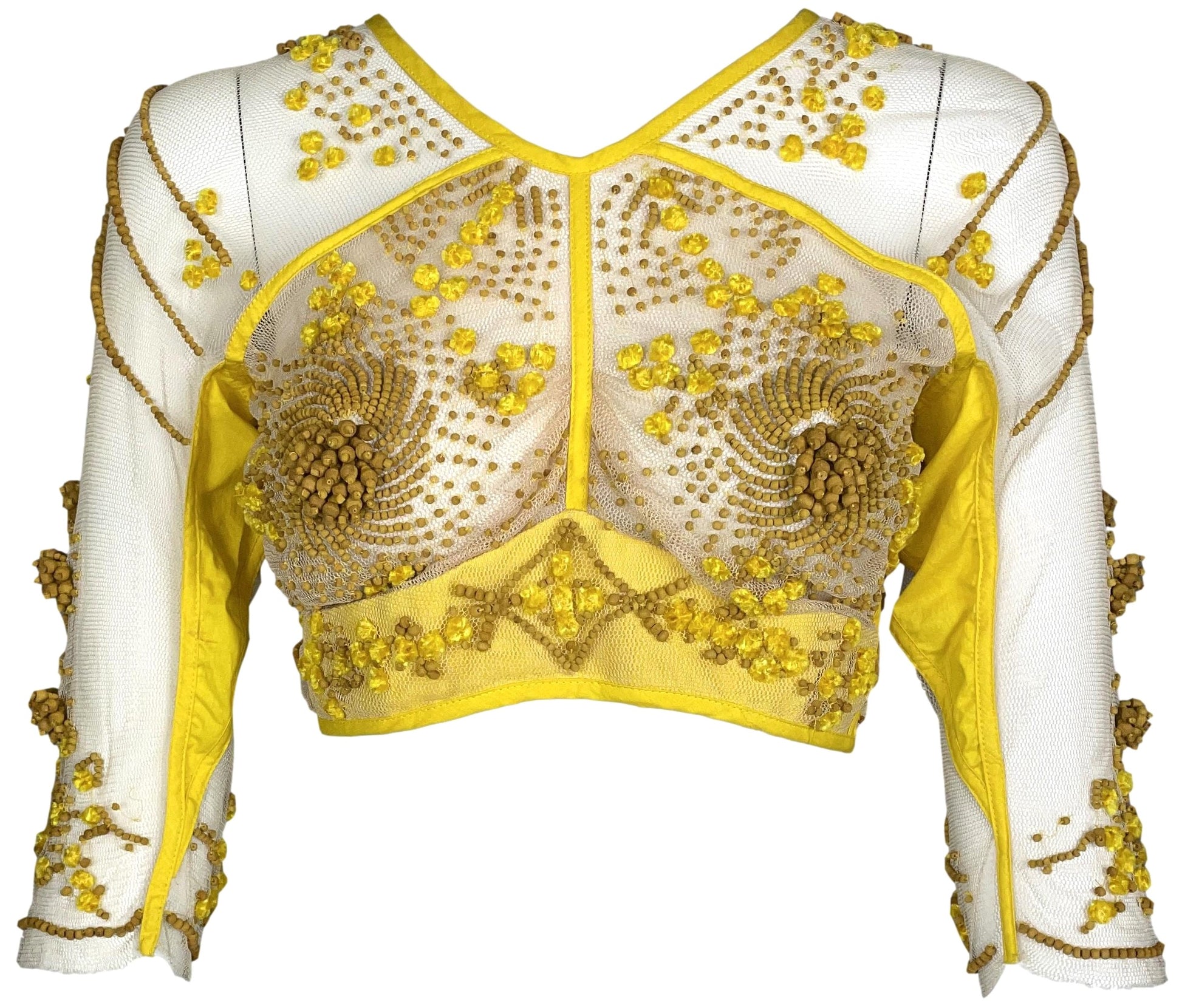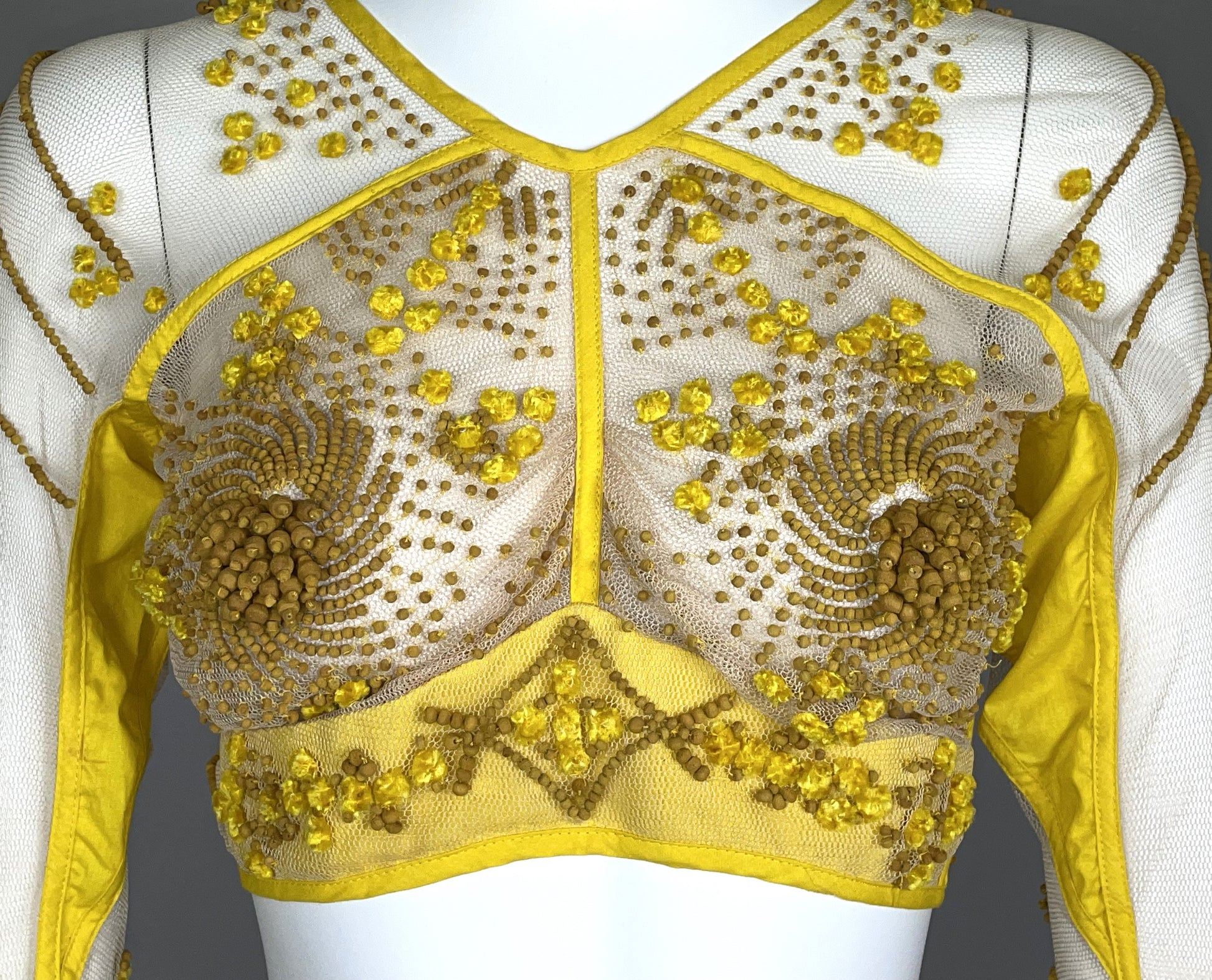 S/S 2004 Jean Paul Gaultier Runway Cone Bra Sheer Nude Mesh & Yellow Beaded Crop Top