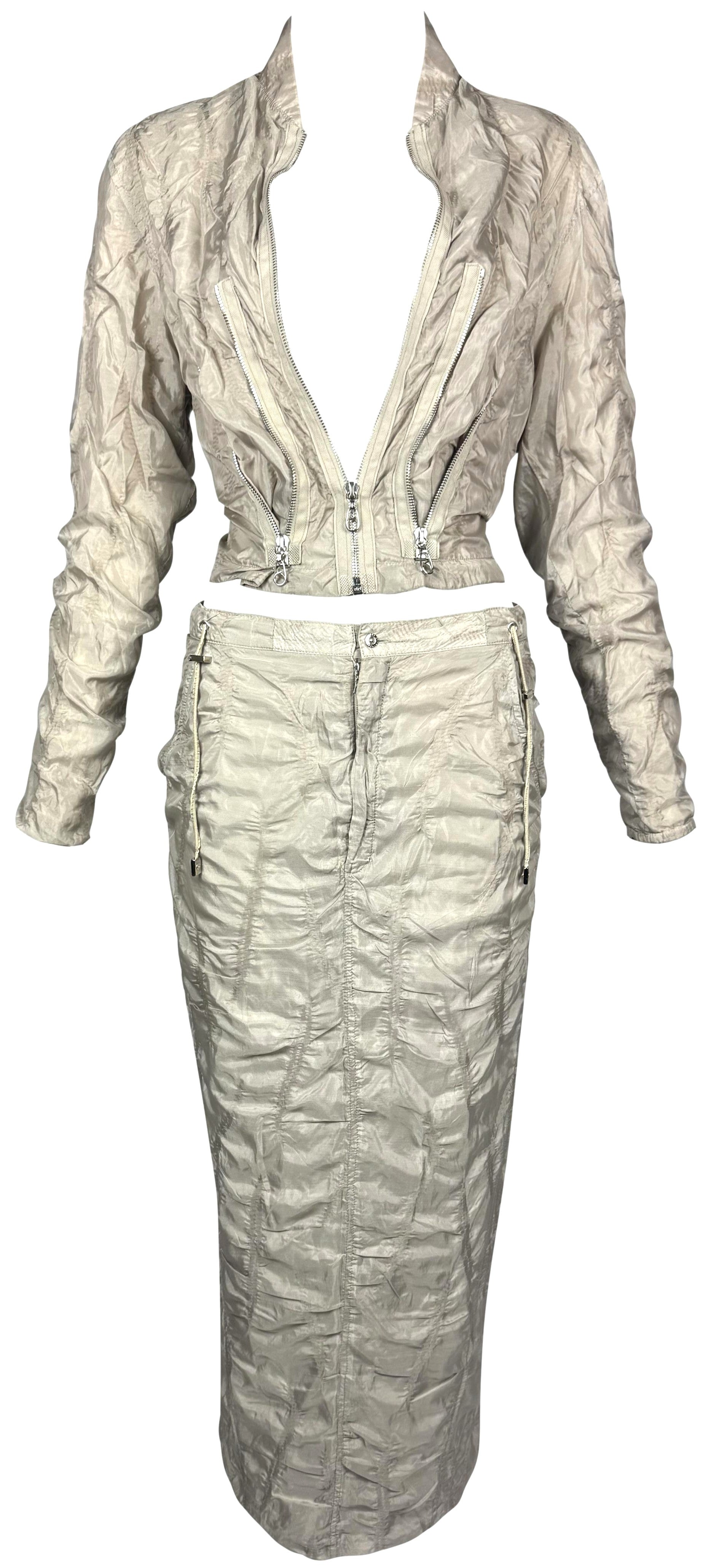 S/S 2005 Gianfranco Ferre Beige Khaki Parachute Sheer Fitted Zipper Detail Jacket & Skirt Tracksuit Set
