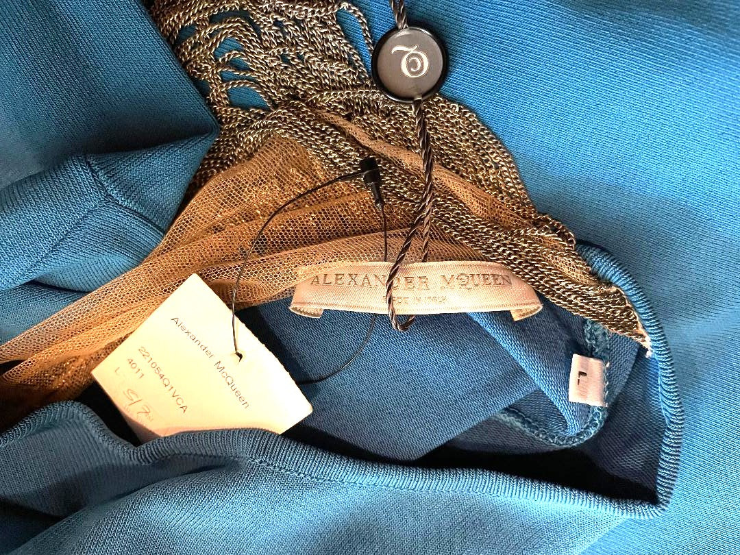 S/S 2006 Alexander McQueen Sheer Mesh Gold Chains Blue Bodycon Dress