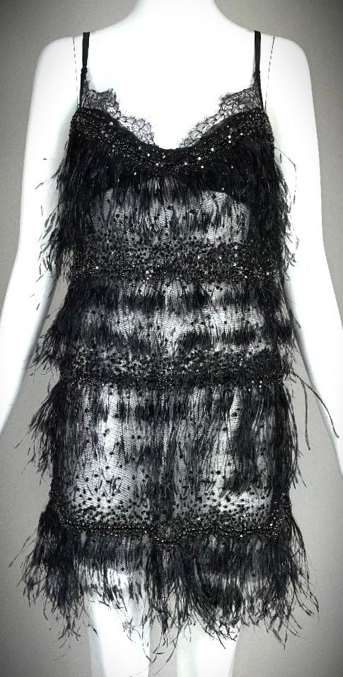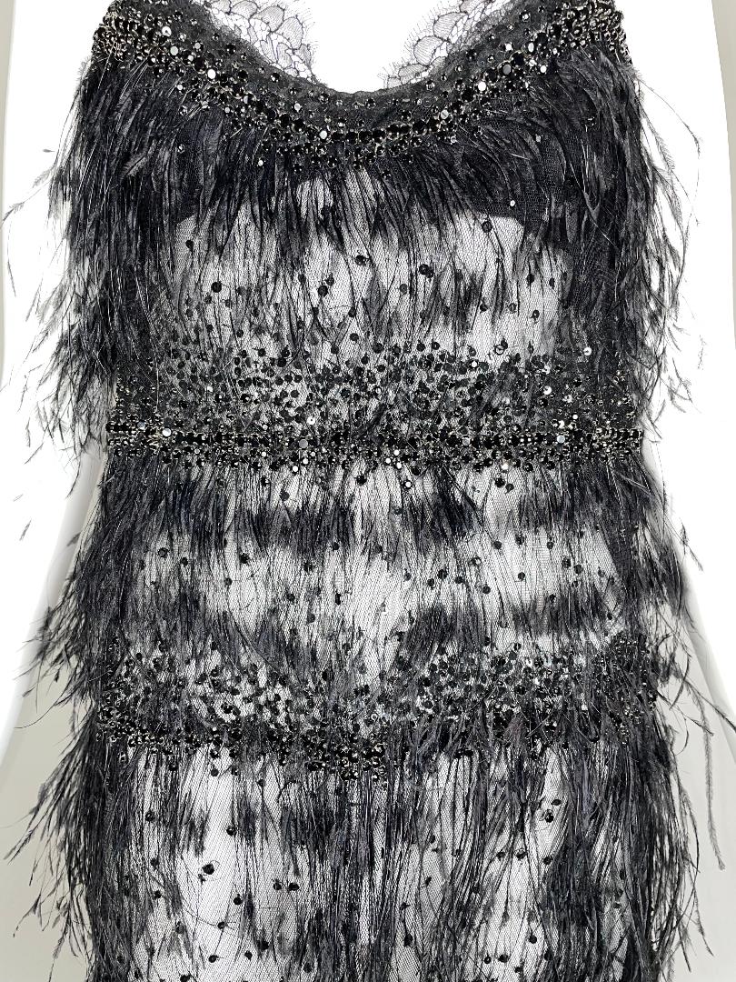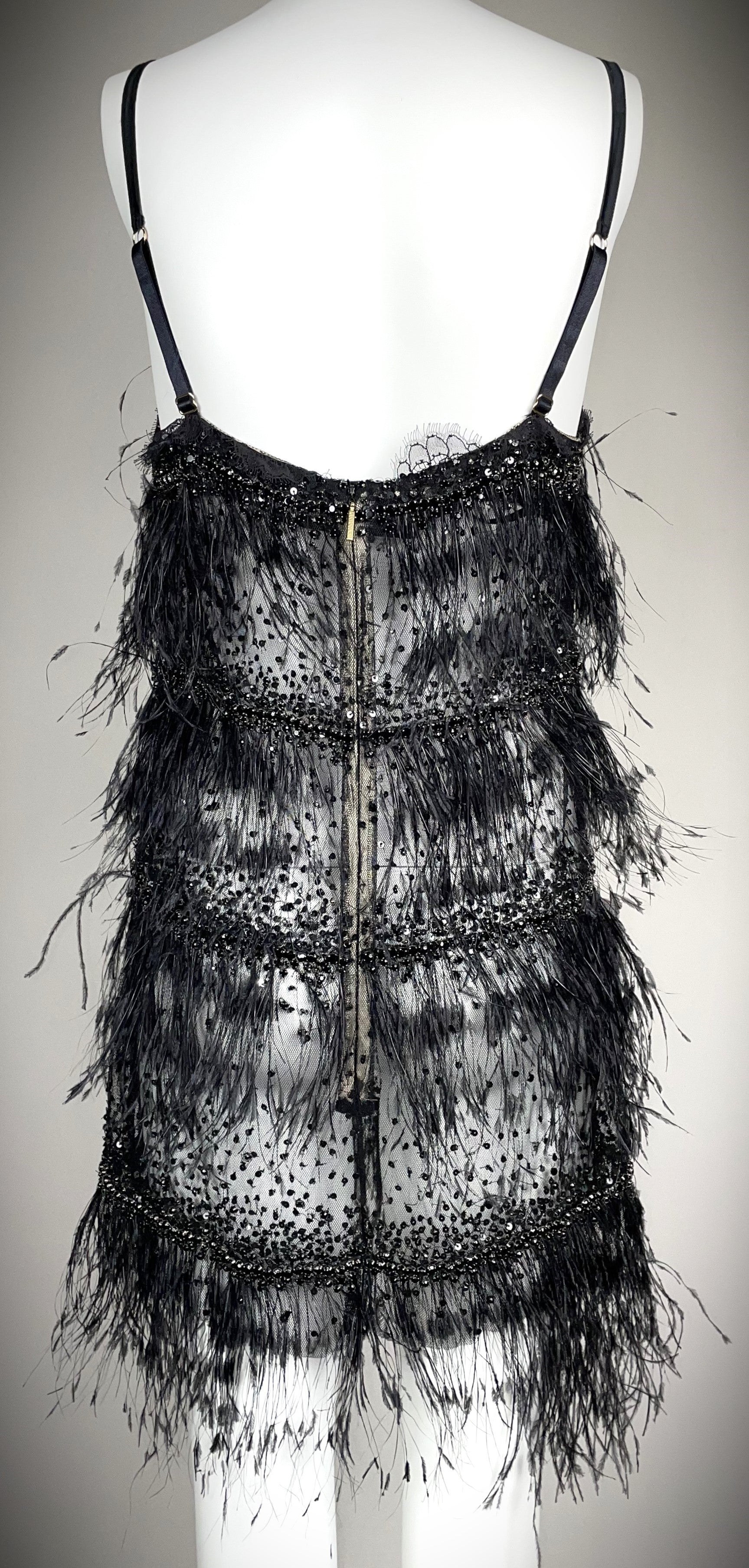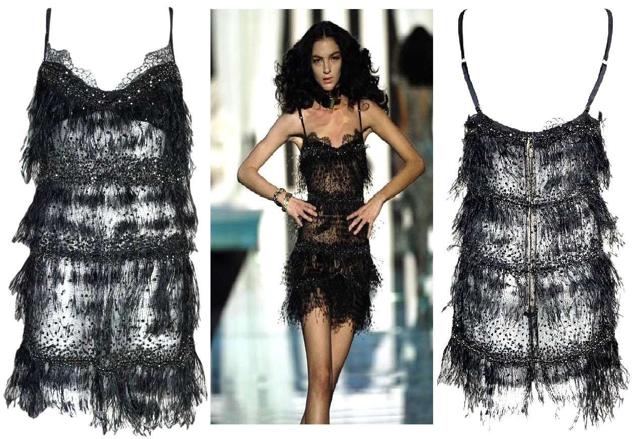 S/S 2006 Roberto Cavalli Runway Sheer Black Mesh & Lace Feather & Crystal Embellished Mini Dress