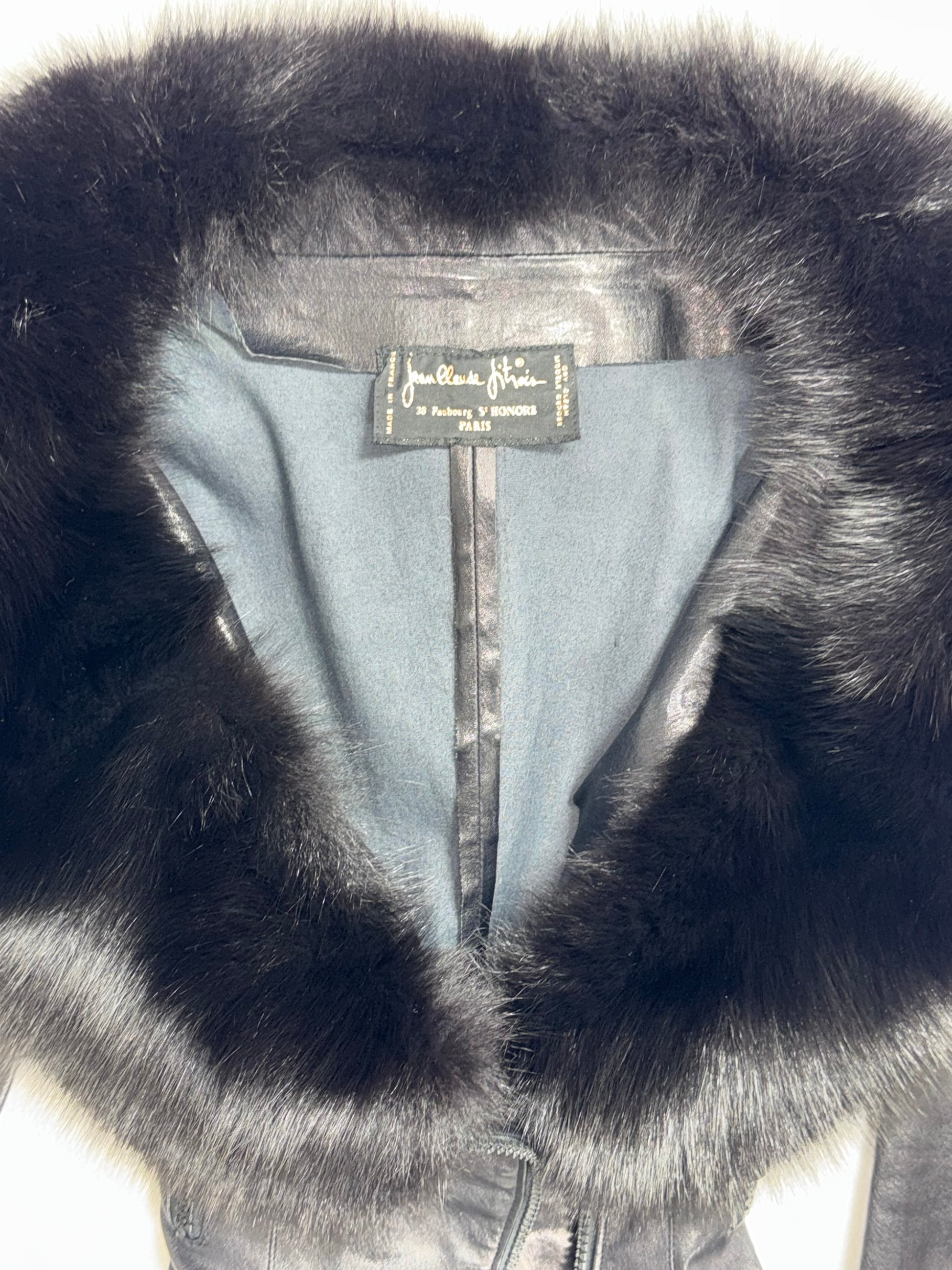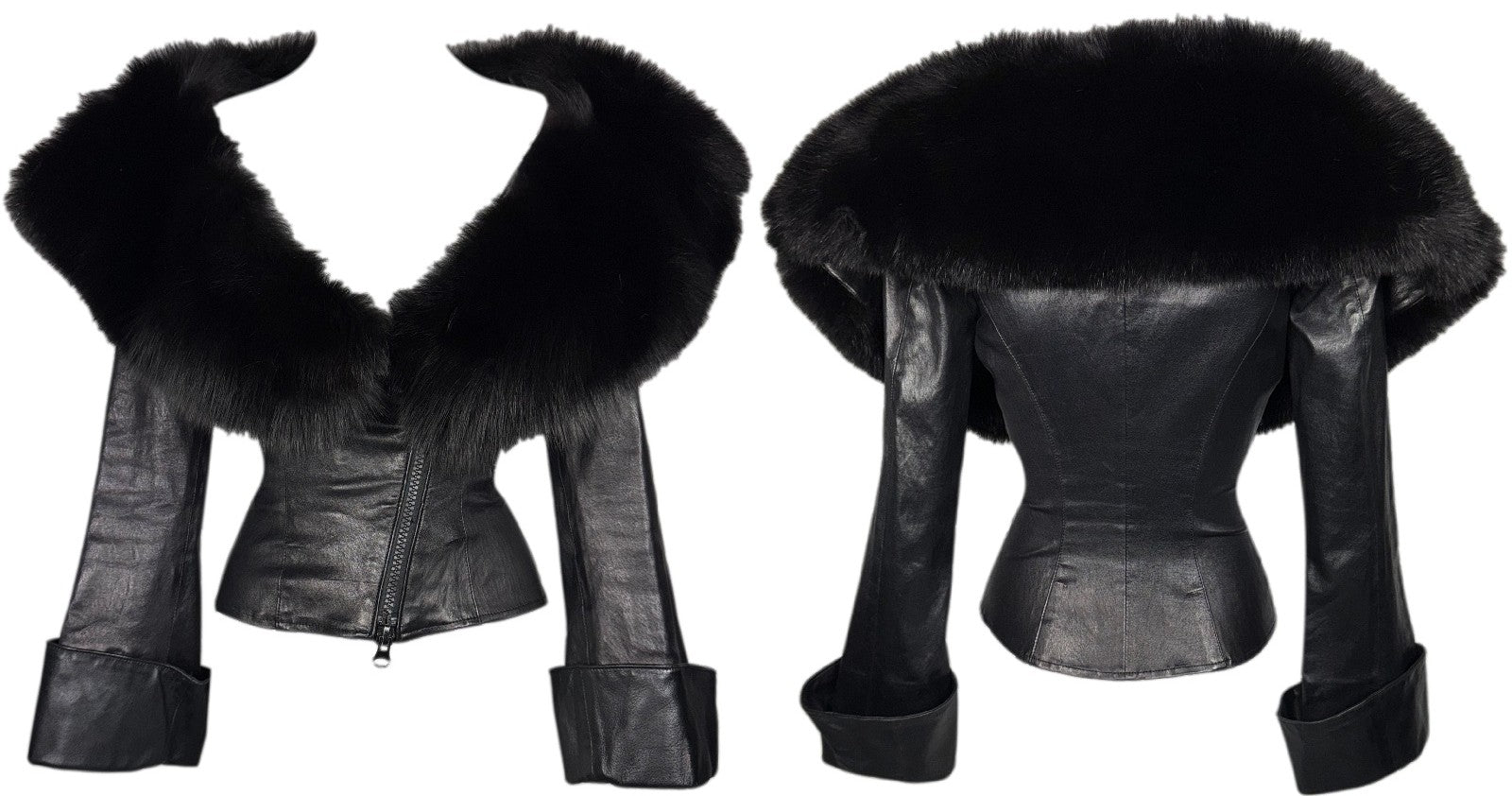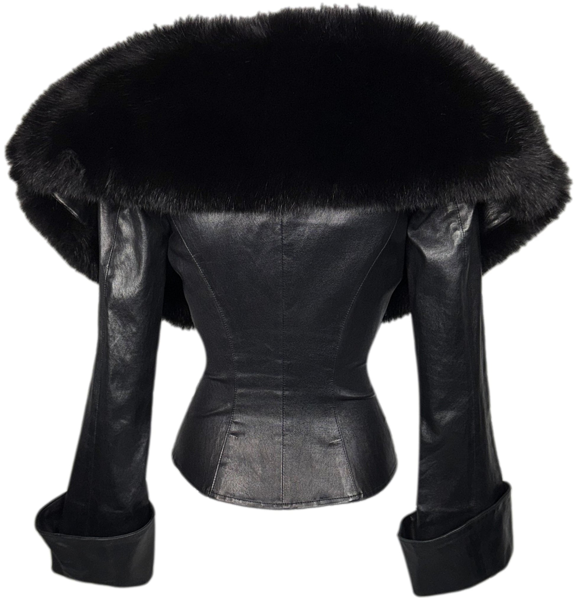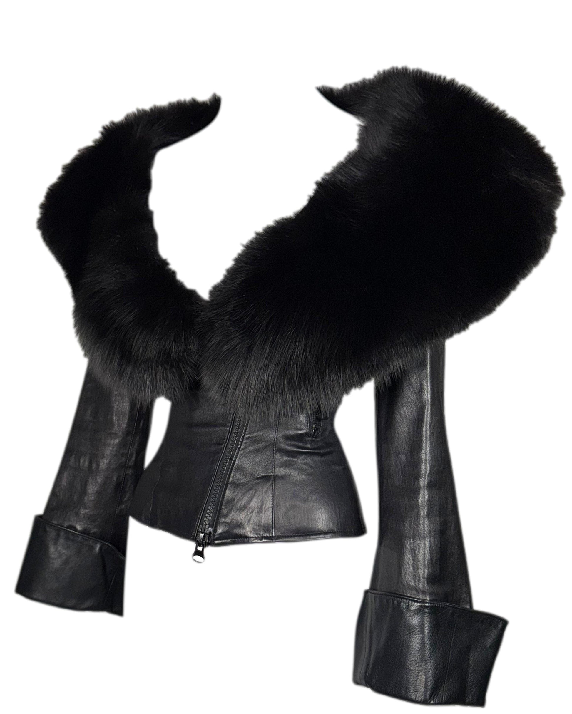 Vintage 1990's Jean Claude Jitrois Sexy Pin-Up Wide Neck Plunging Fox Fur Collar Fitted Leather Jacket