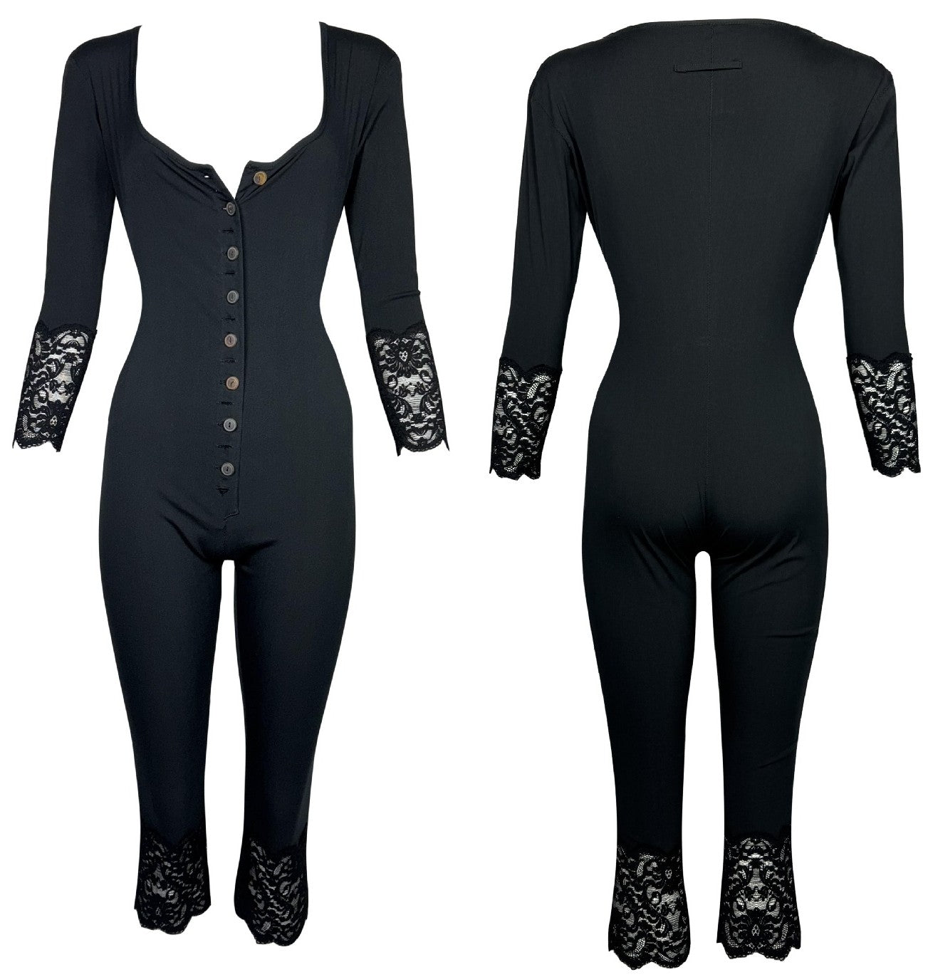 Vintage 1990's Jean Paul Gaultier Pin-Up Black Button Down Bodycon Lace Trim Romper Jumpsuit